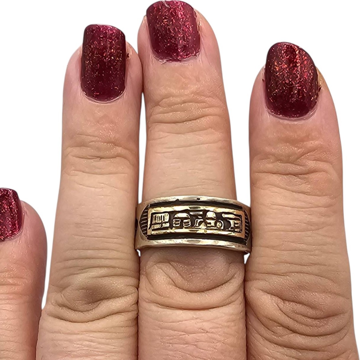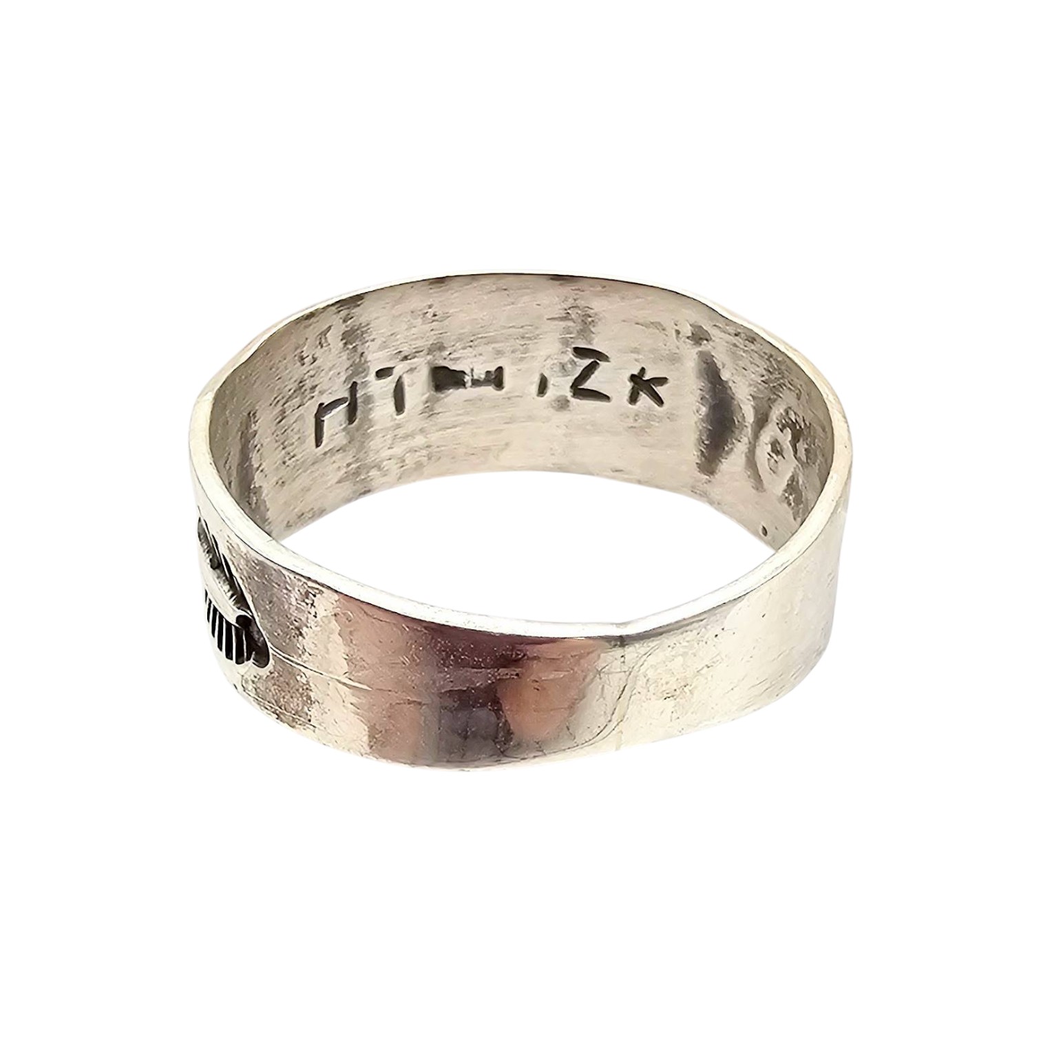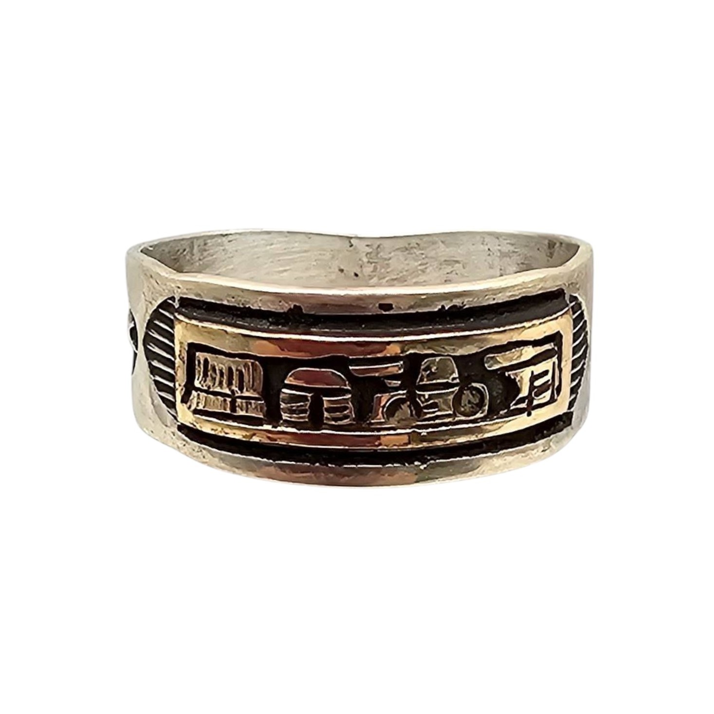 Navajo handmade sterling silver and 12K gold overlay ring crafted by artist Harry Tsosie. Features an intricate design in overlay with hallmarks ‘HT’ and ’12K’ on the interior. Ring weighs approximately 3.8 grams and is size 10.5. Comes with an original price tag indicating $75.