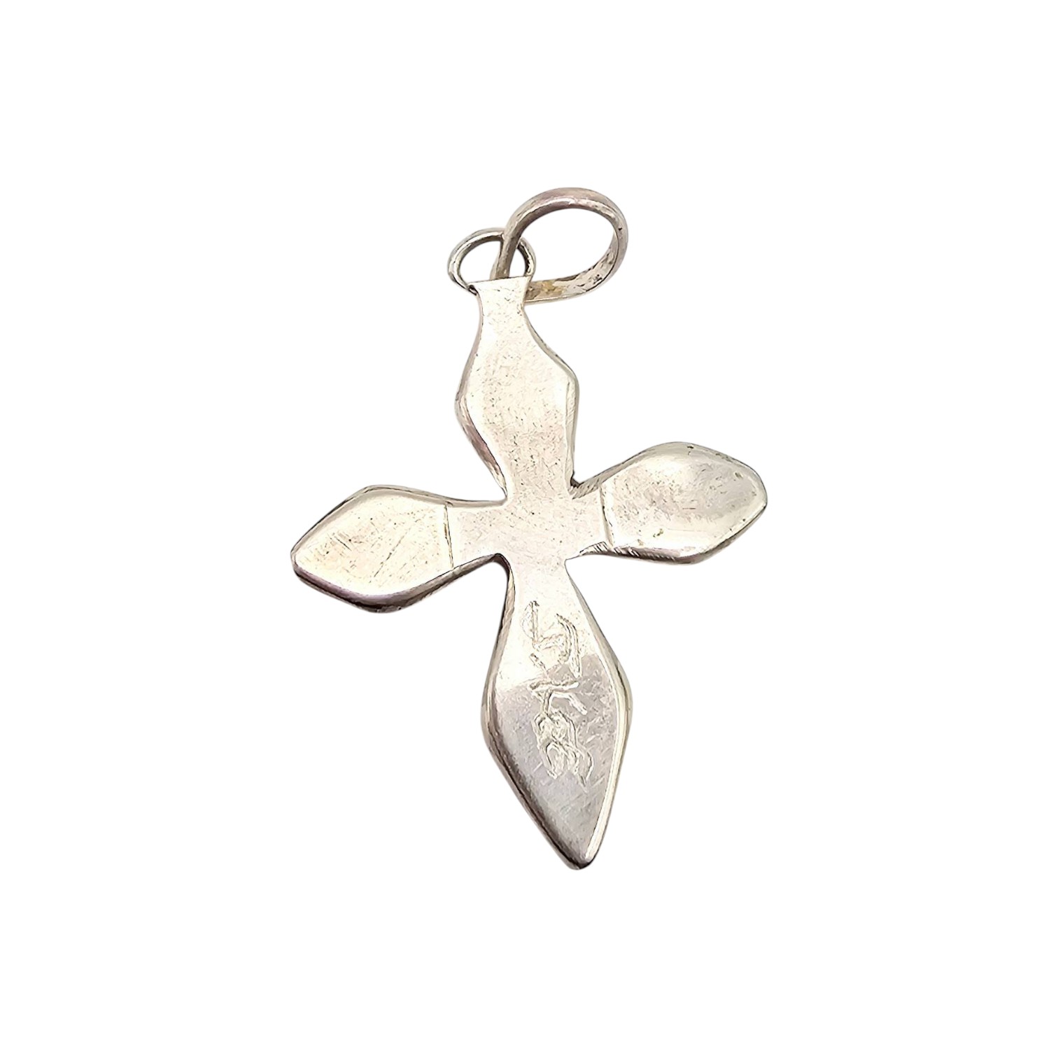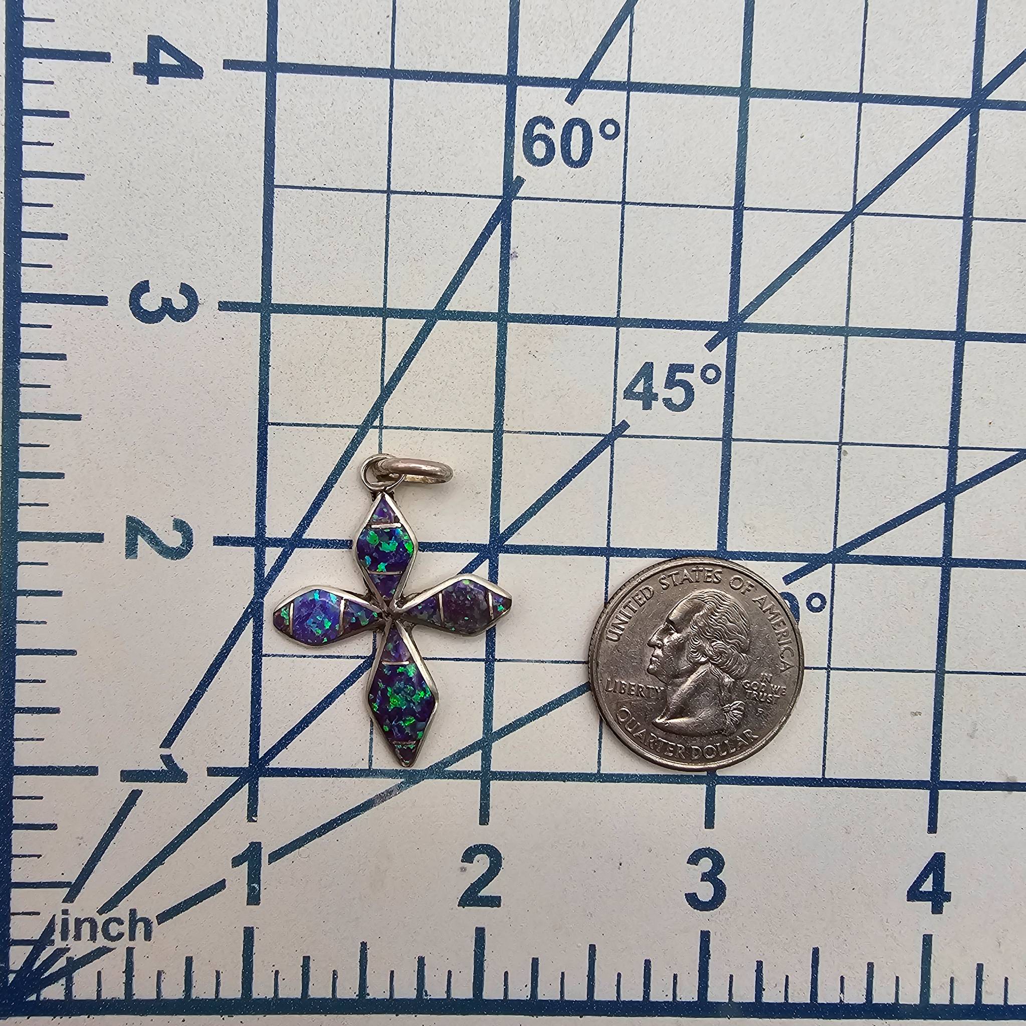 Sterling silver cross pendant handmade by James Kee, a Navajo artisan. Features inlaid vibrant purple and green stones with a polished finish. The pendant weighs 2.0 grams and measures approximately 1.5 inches in length, including the bail. Marked on the back. Excellent craftsmanship from a renowned Navajo artist.