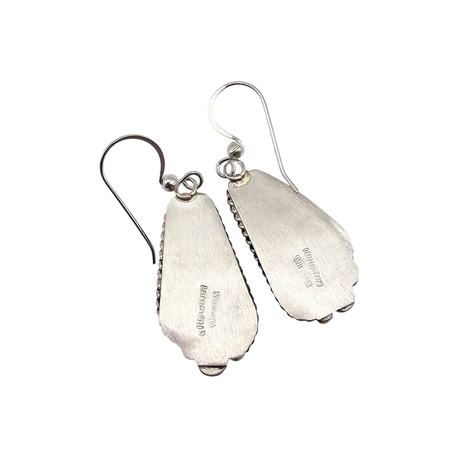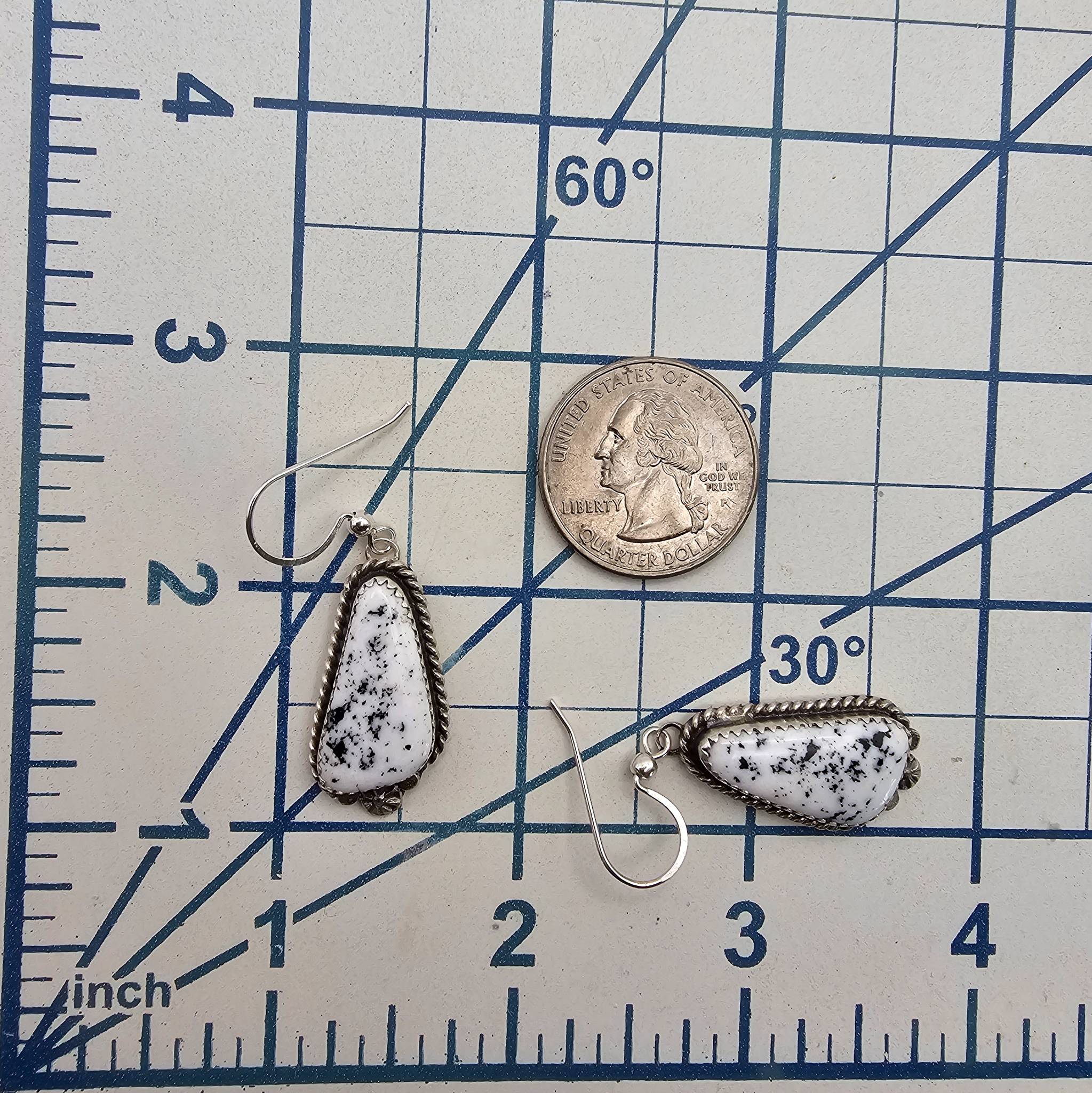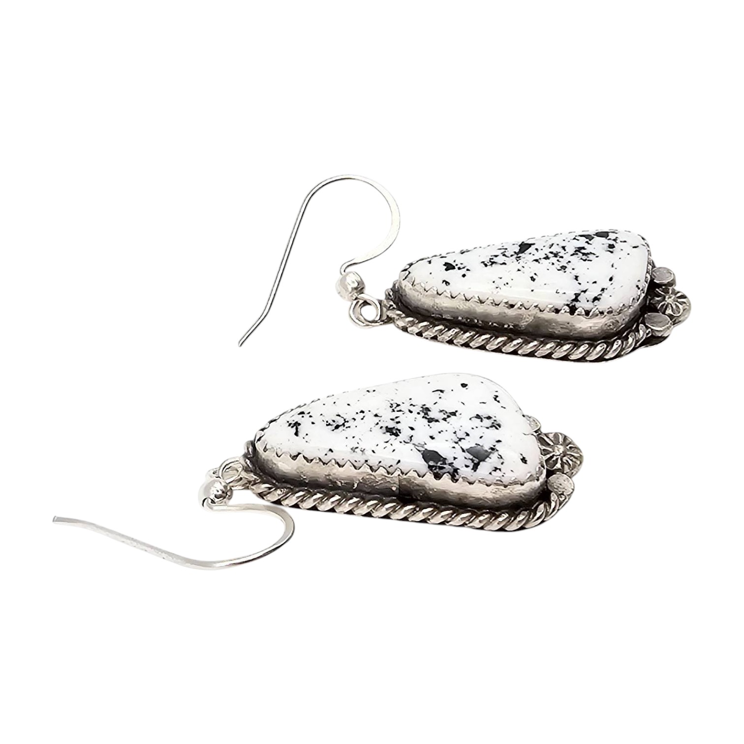 Handmade earrings crafted by Judith Dixon, featuring authentic Navajo artistry. The earrings are made of sterling silver and showcase white buffalo stones framed by intricate rope and flower silverwork. Each earring includes a hook fastening and measures approximately 1.5 inches long. Total weight is 9.6 grams.