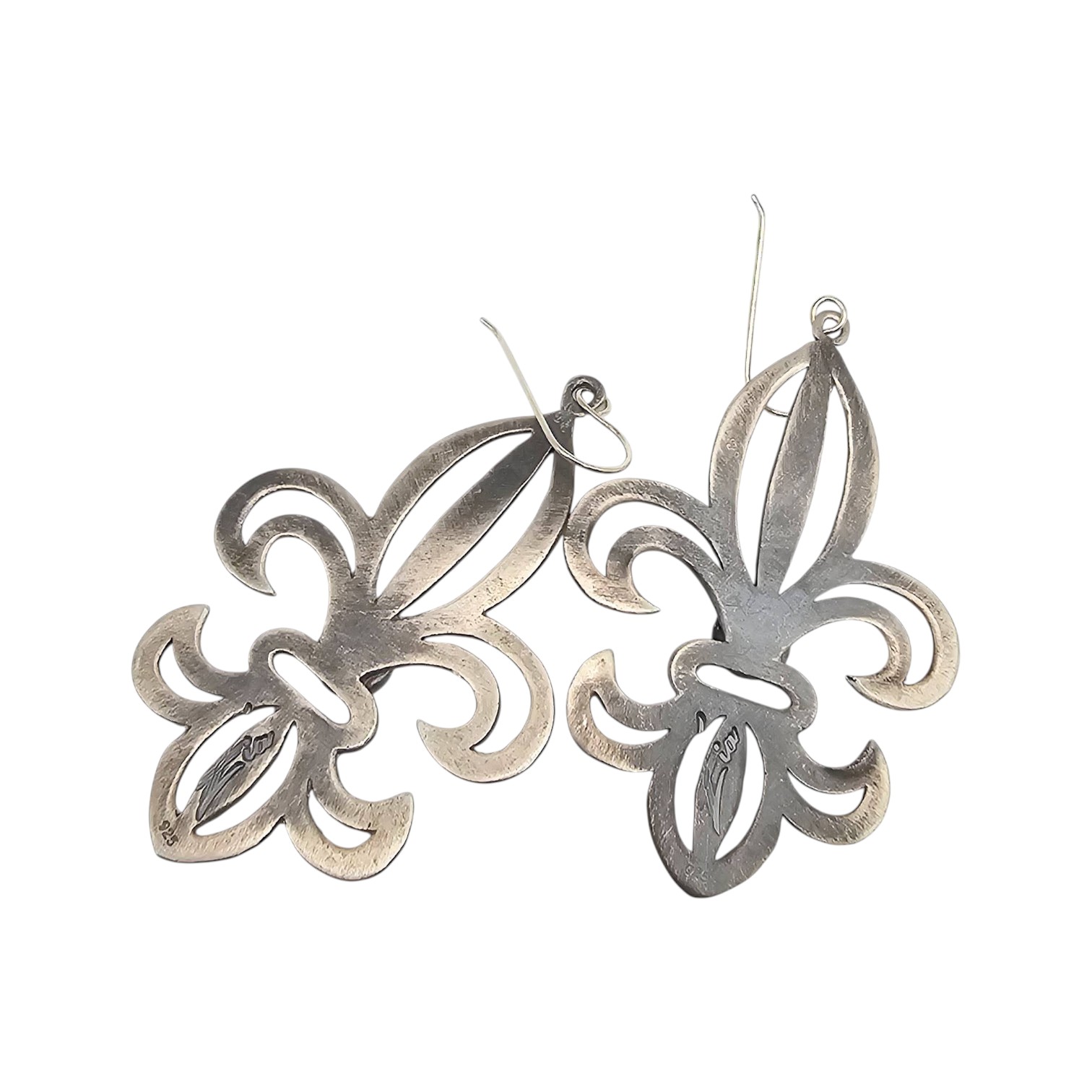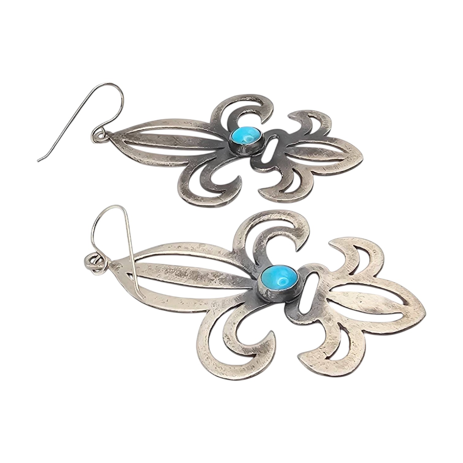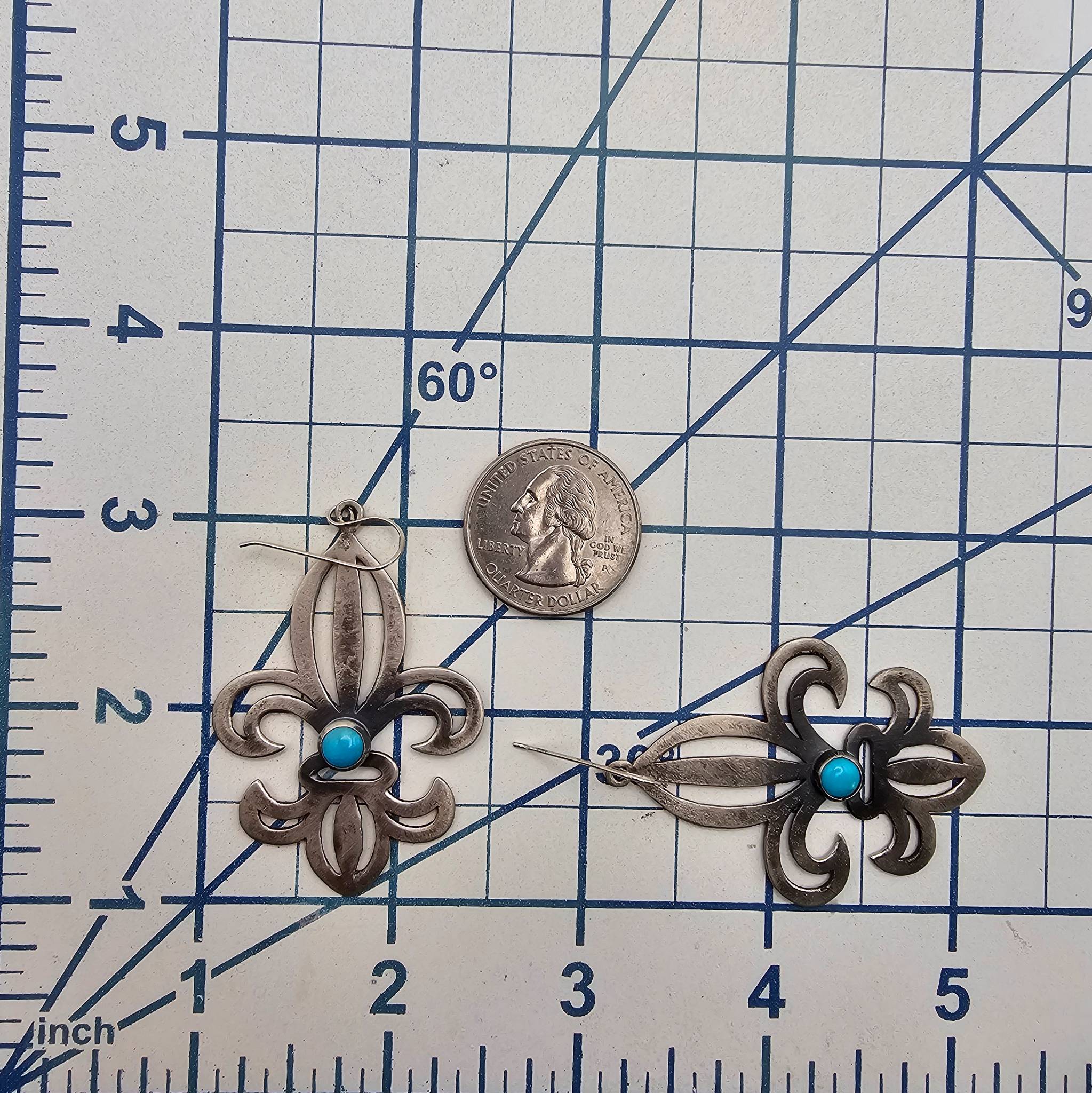 Tony Yazzie Navajo handmade sterling silver earrings in a fleur-de-lis design, featuring Kingman turquoise stones. They weigh approximately 11.1 grams in total. Hooks are included for wearing. These pieces highlight traditional Navajo craftsmanship. Estimated dimensions are visible against the scale grid for reference.