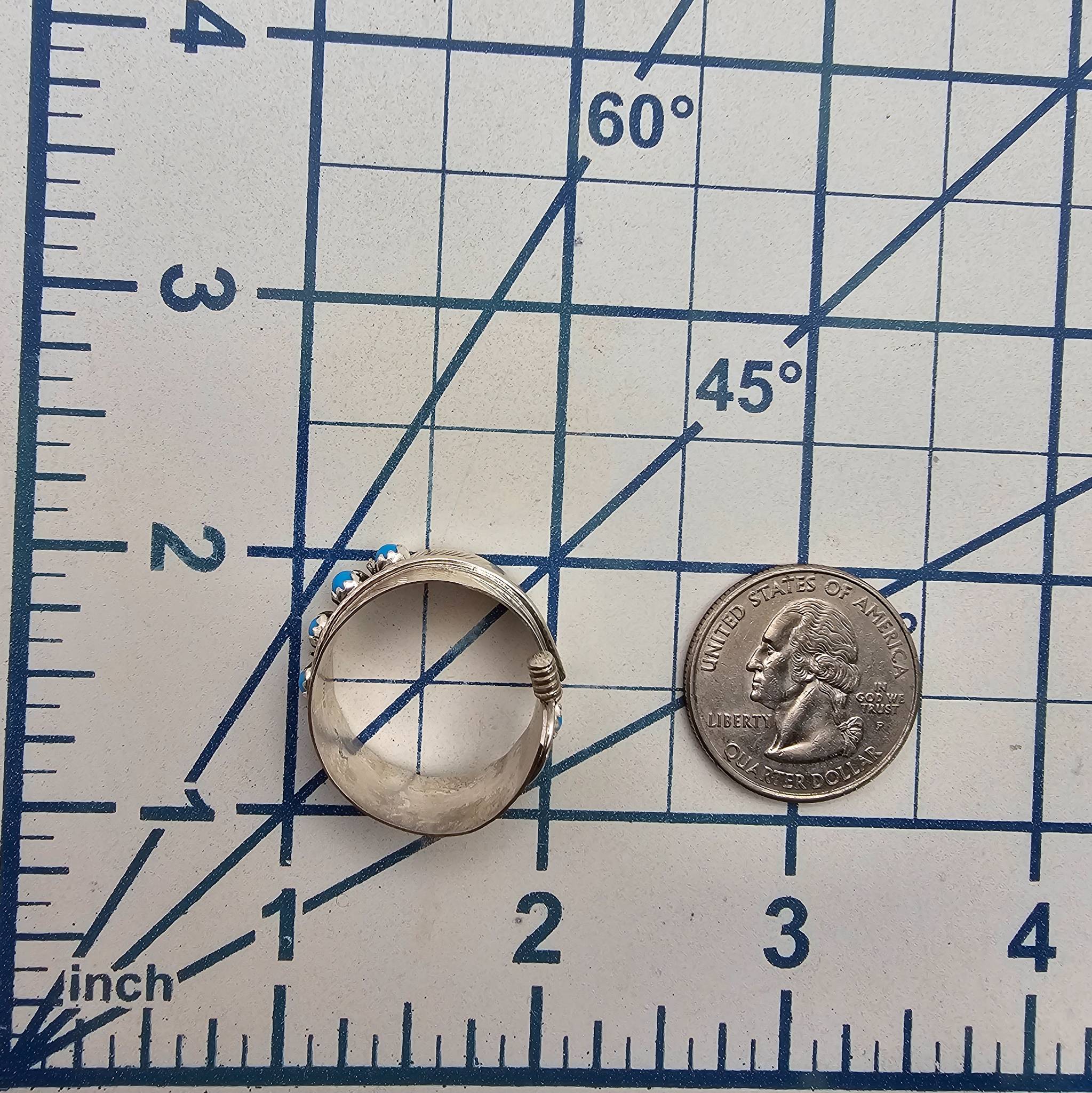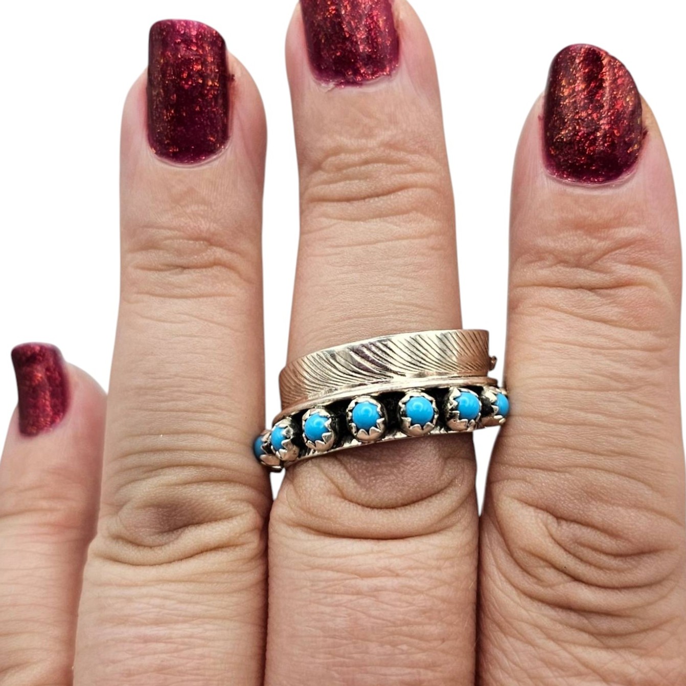 Handmade by Navajo artisan Chester Charley, this sterling silver adjustable ring features Kingman turquoise stones set in a row. The band is intricately detailed with a feather motif and a coiled element. The ring weighs approximately 4.7 grams and is adjustable in size, making it a versatile piece. A notable addition to any Native American or handmade jewelry collection.