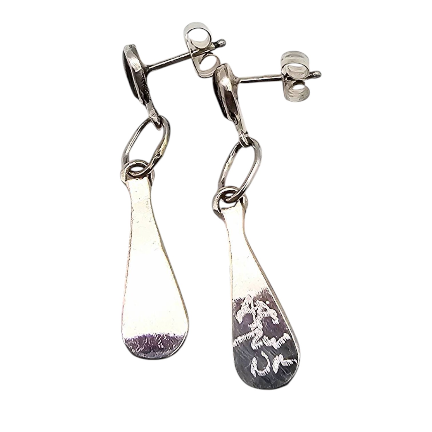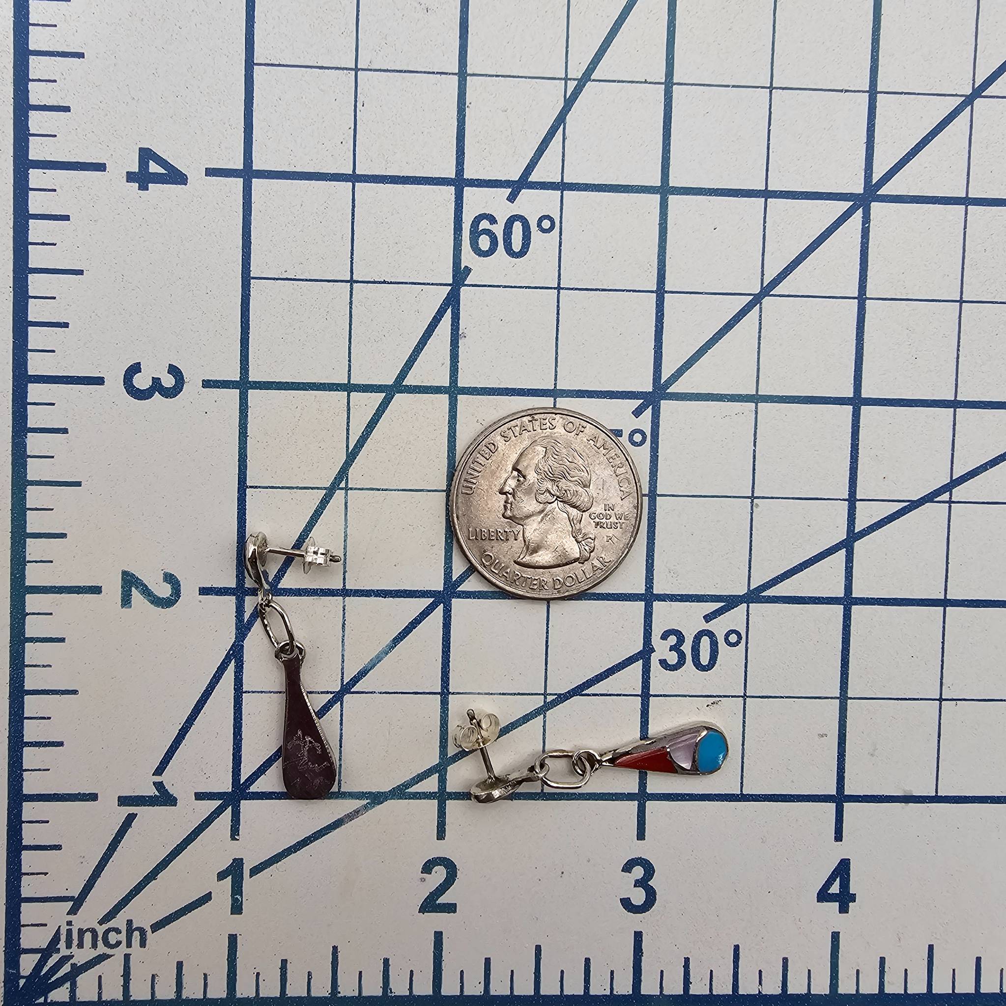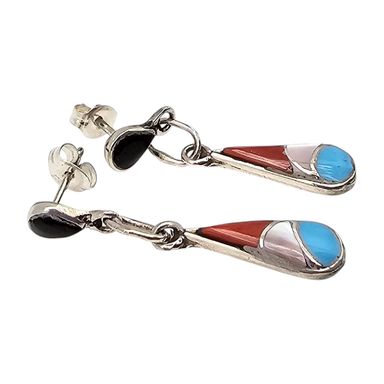 Dangle earrings created by Antionetti Ahiyite from the Zuni tribe. Made from sterling silver with a multicolor inlay featuring turquoise, coral, and onyx. Signed on the back. Each earring measures approximately 1 inch in length and weighs a combined total of 2.4 grams. Includes secure post backs.