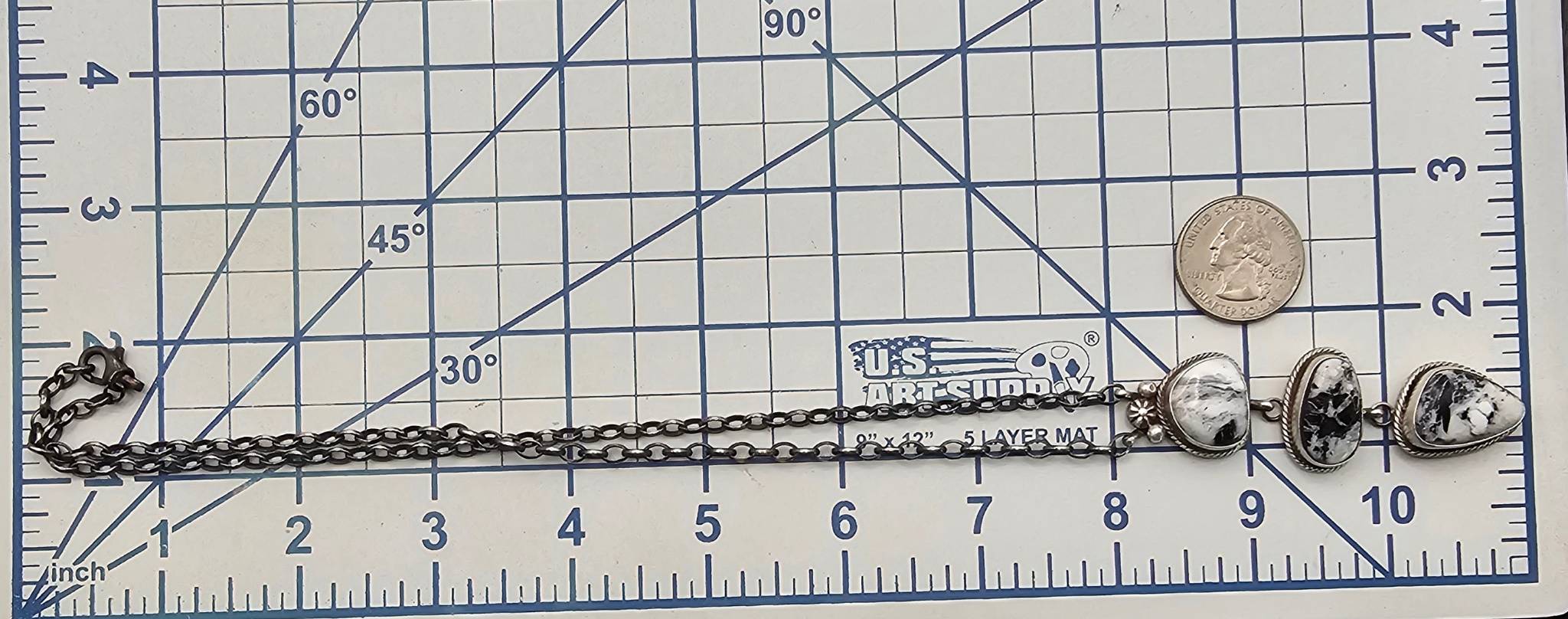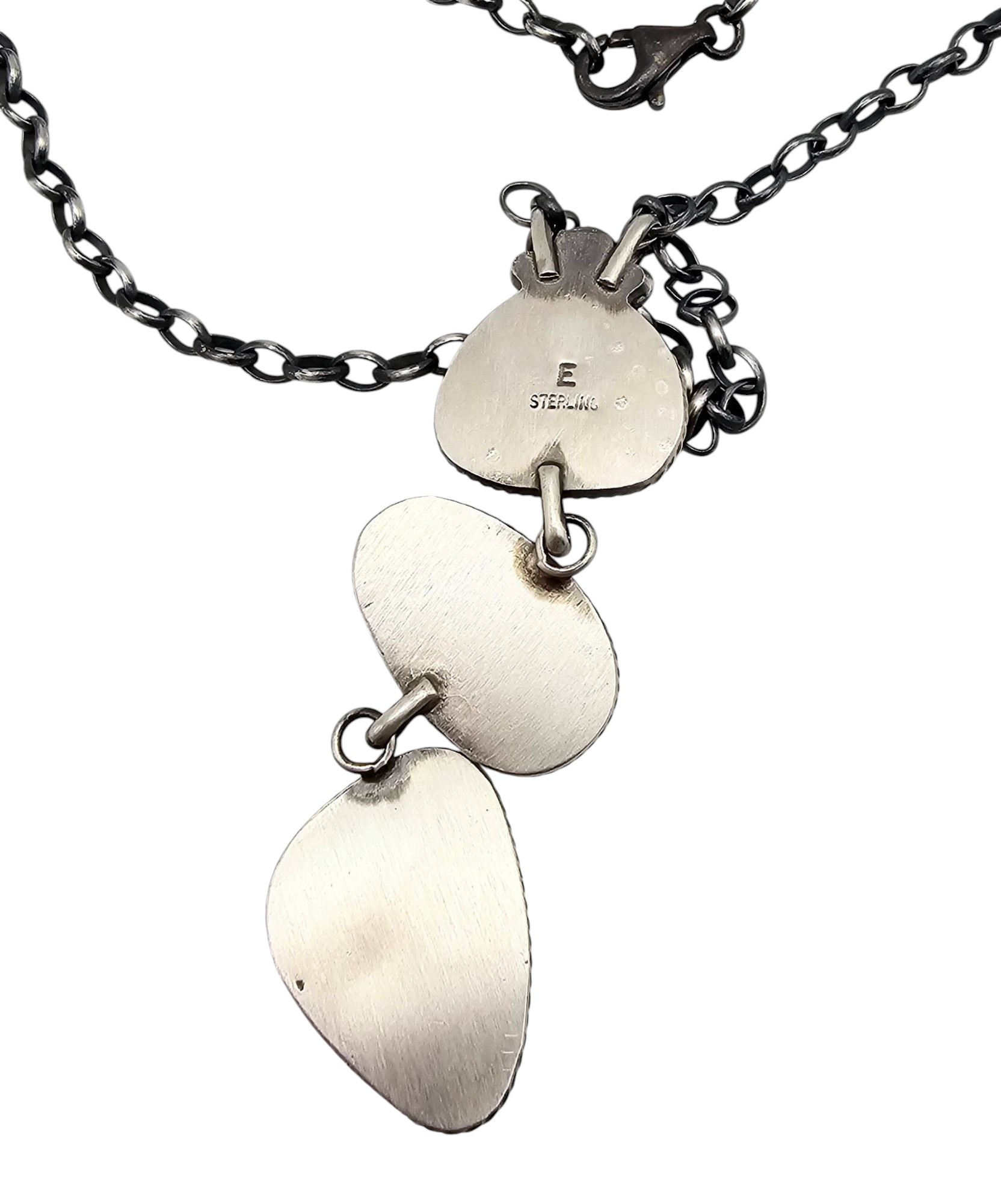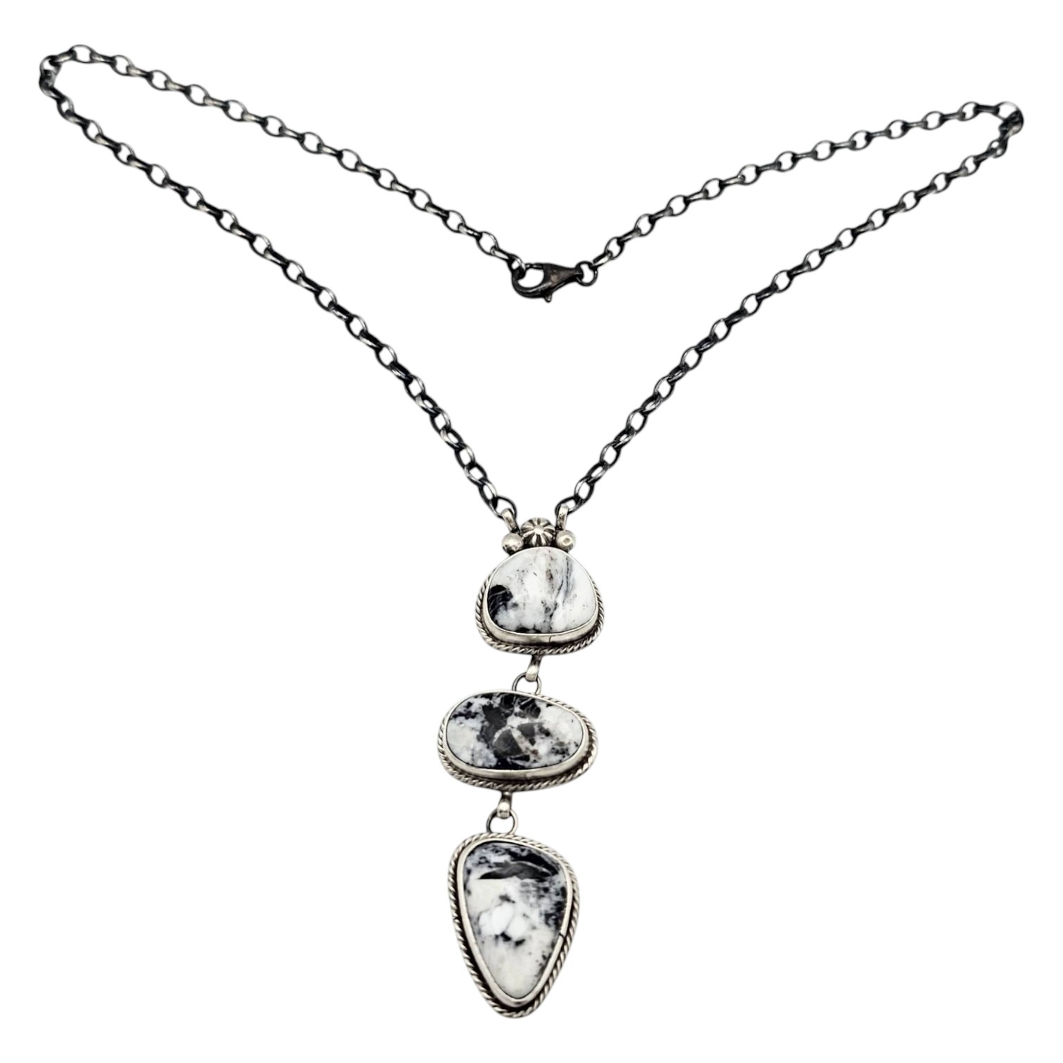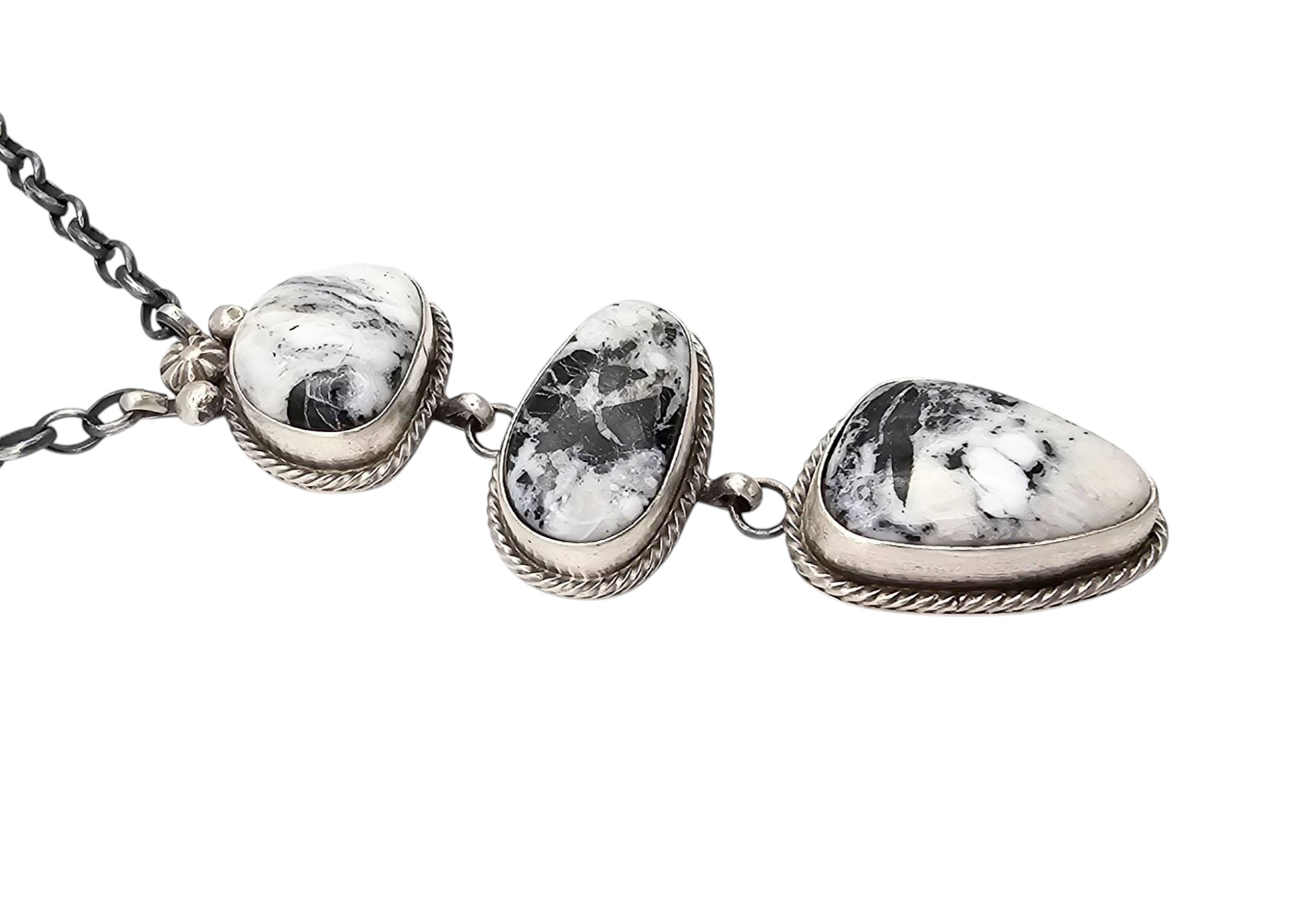 Handmade necklace by Navajo artisan Eli Skeets featuring three White Buffalo stones set in sterling silver. The stones are set in a classic Navajo design with a hand-twisted border and oxidized sterling silver chain. The piece weighs 25.8 grams as shown on the scale and includes a lobster clasp closure. The chain and pendant combined measure approximately 15 inches in length. Stamped with the artist’s hallmark ‘E’ and marked ‘STERLING’ on the back.