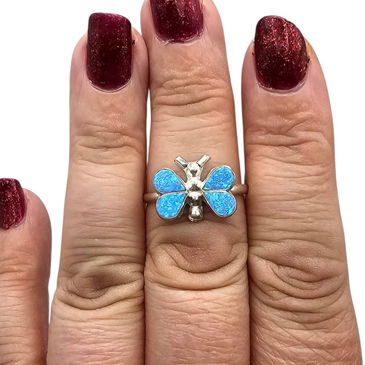 Handmade sterling silver butterfly ring created by Zuni artist Charlie Swain. Features a detailed butterfly design inlaid with vibrant blue opals. The ring is size 8 and weighs approximately 2.1 grams. A unique piece of Native American jewelry craftsmanship.