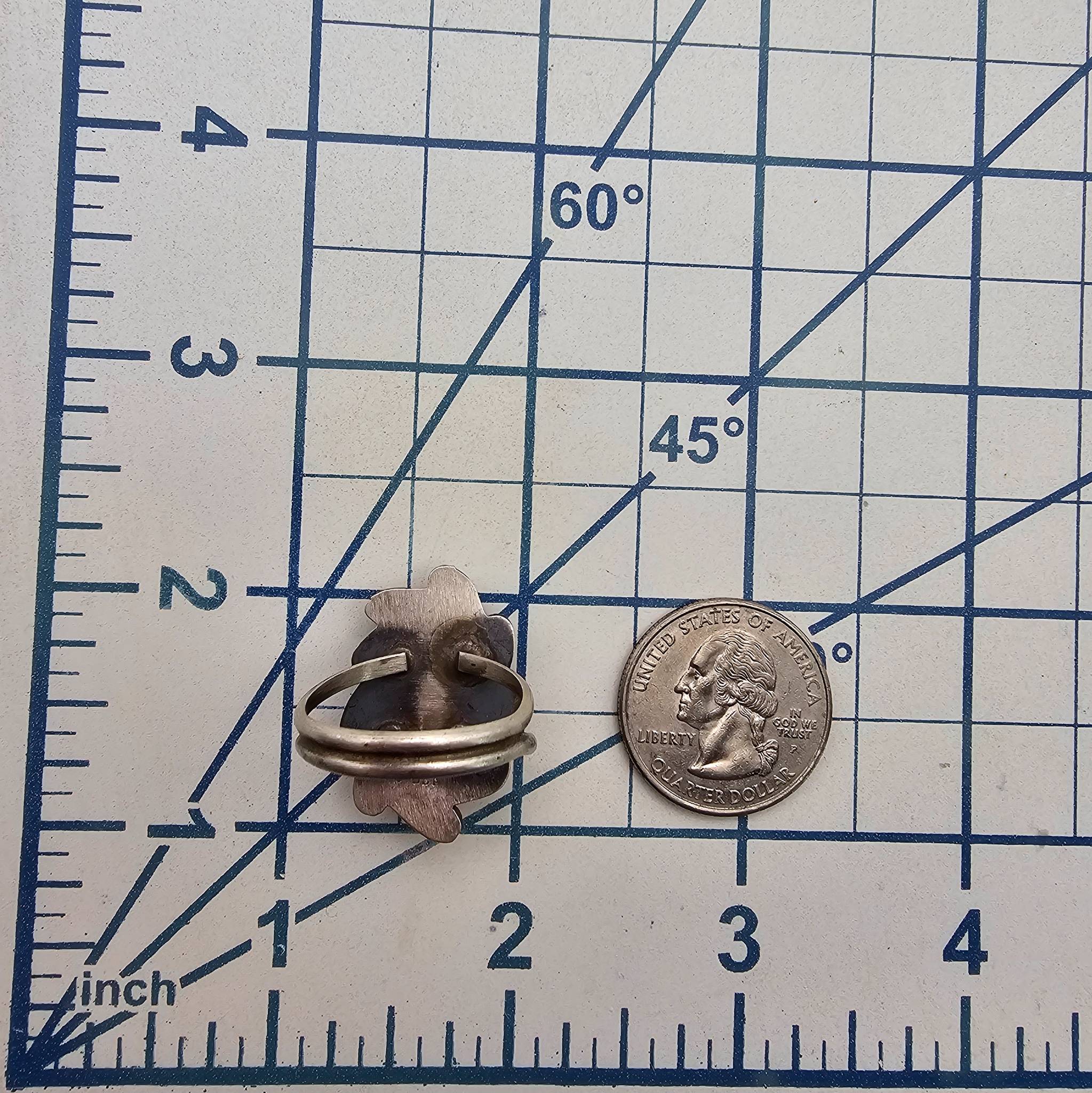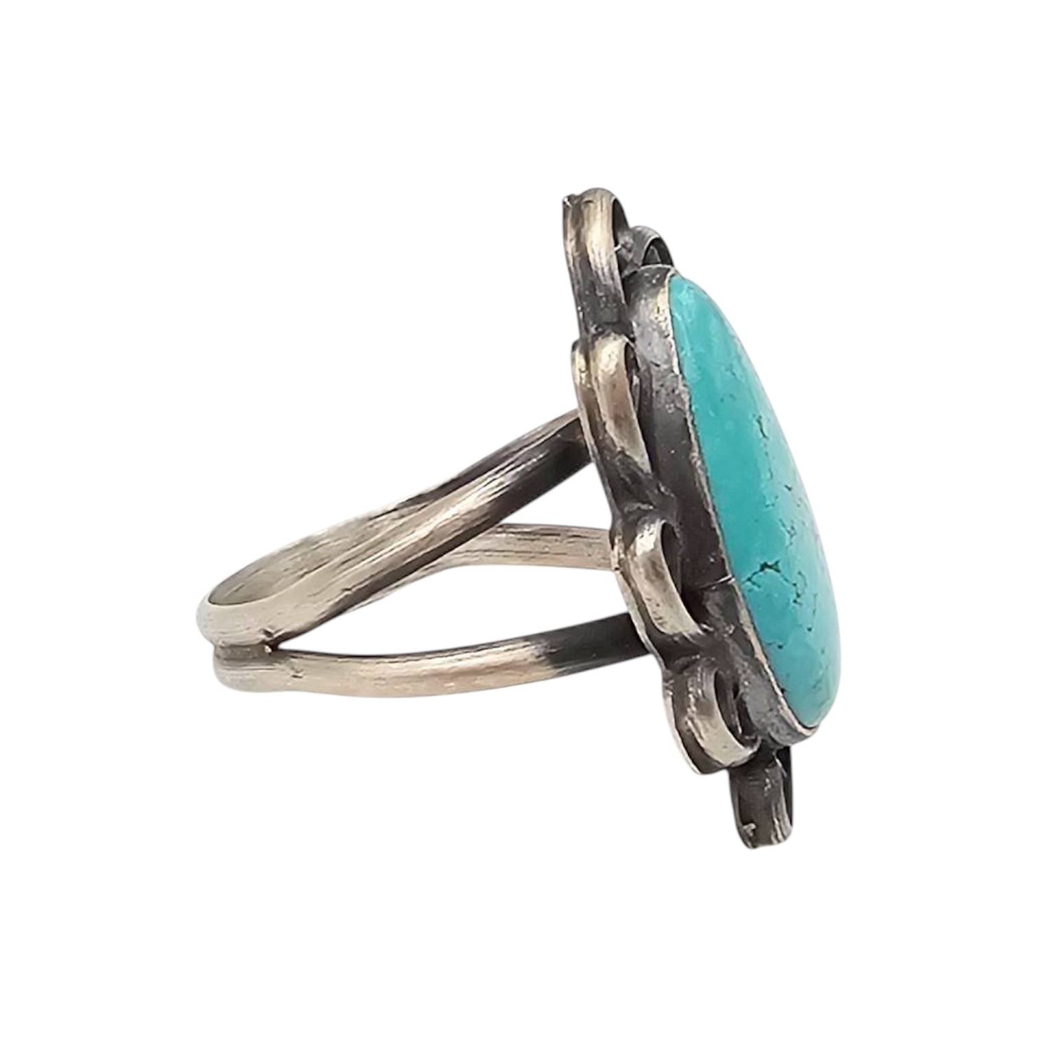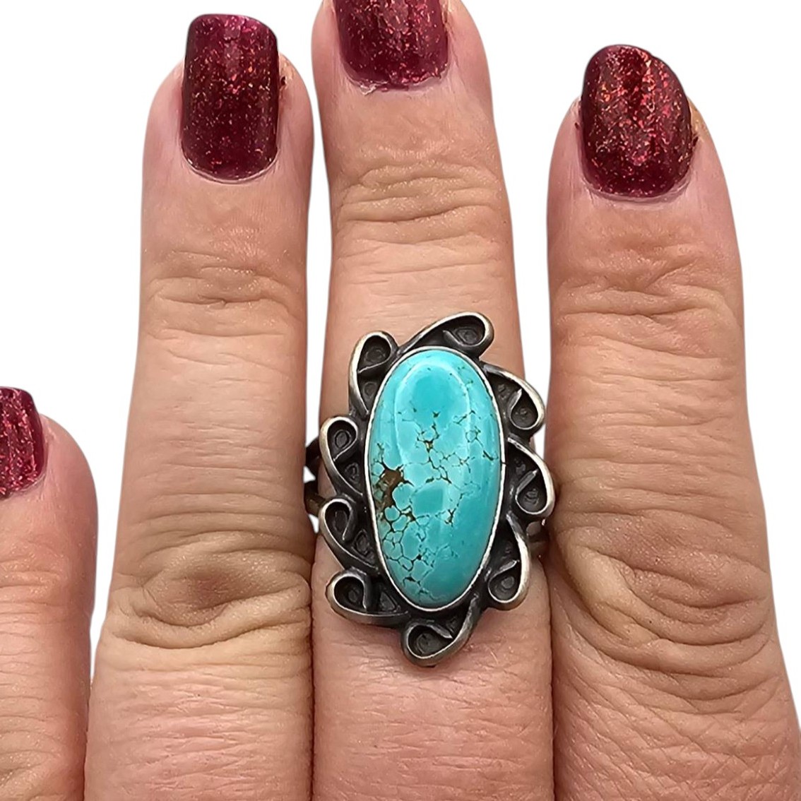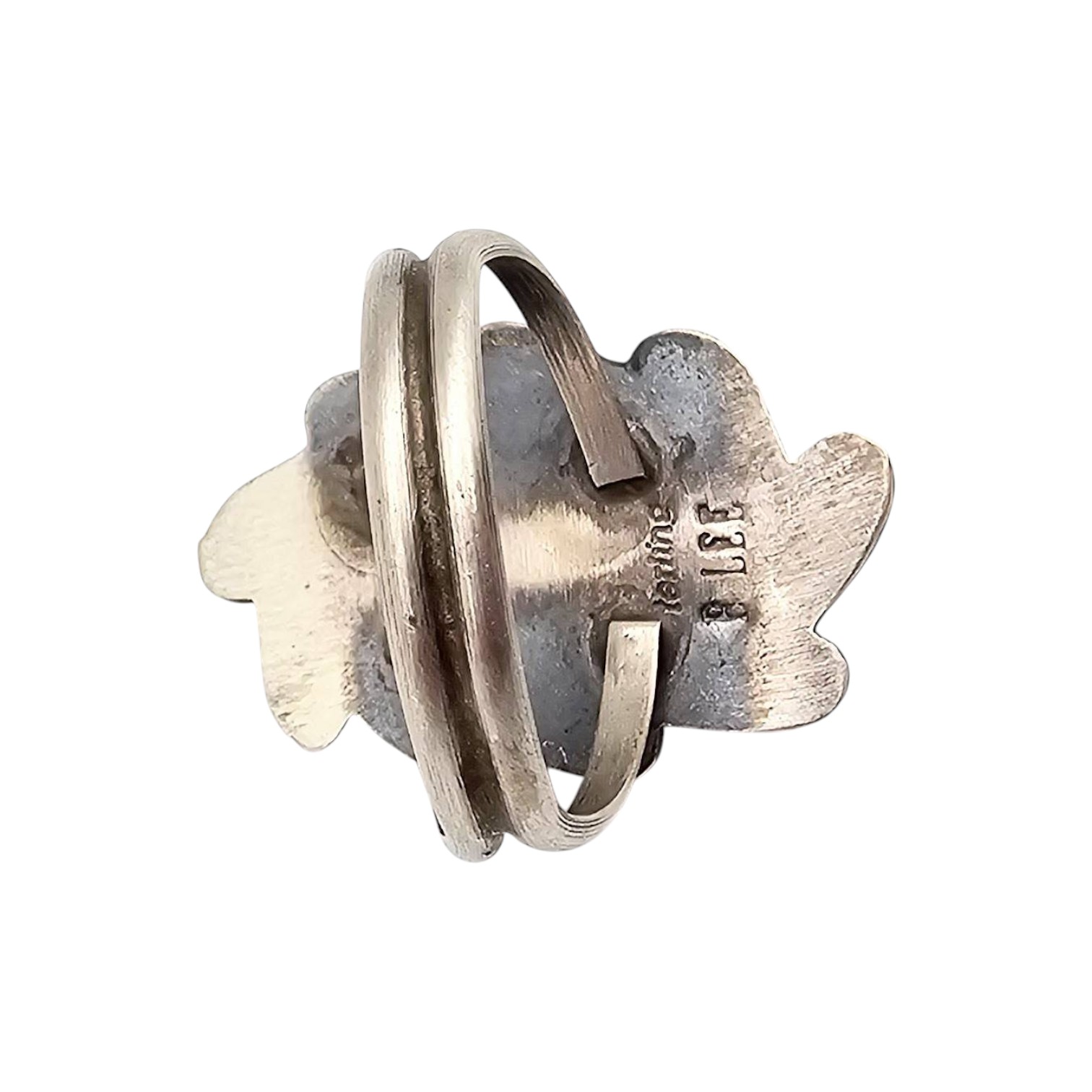 Navajo handmade sterling silver ring crafted by artisan Betta Lee. This size 10 ring features a Pilot Mountain turquoise stone as the centerpiece, surrounded by an intricate sterling silver setting. Stamped with the maker’s hallmark on the underside, the ring weighs approximately 7.3 grams. The turquoise displays a signature veined matrix pattern.