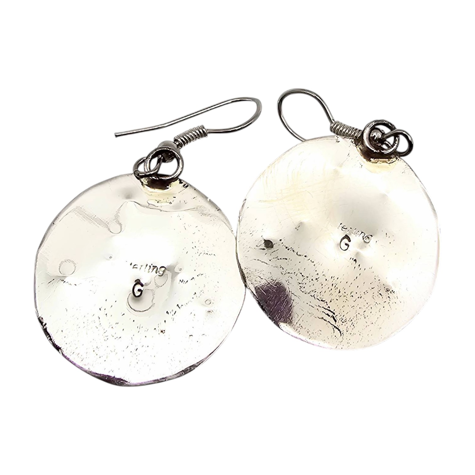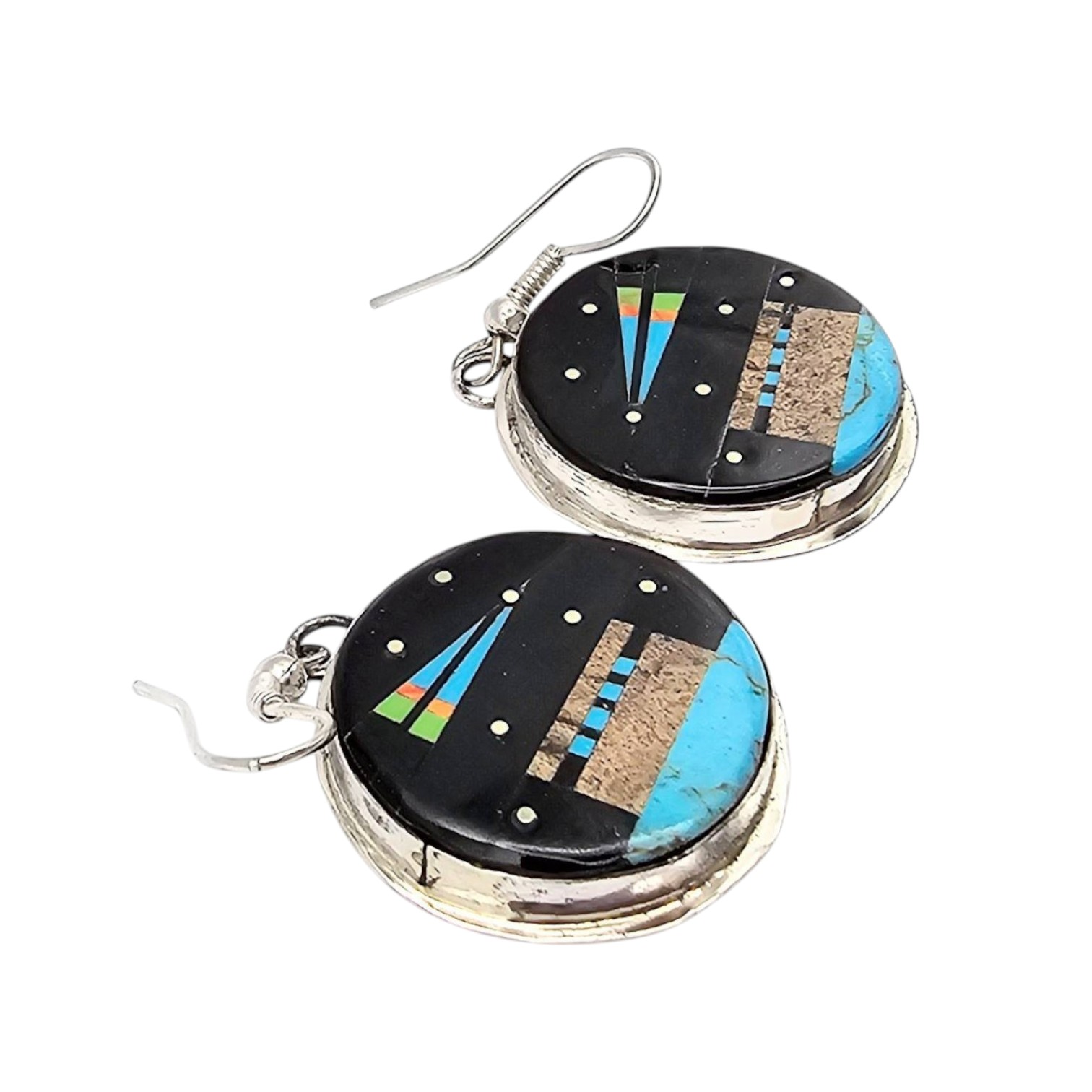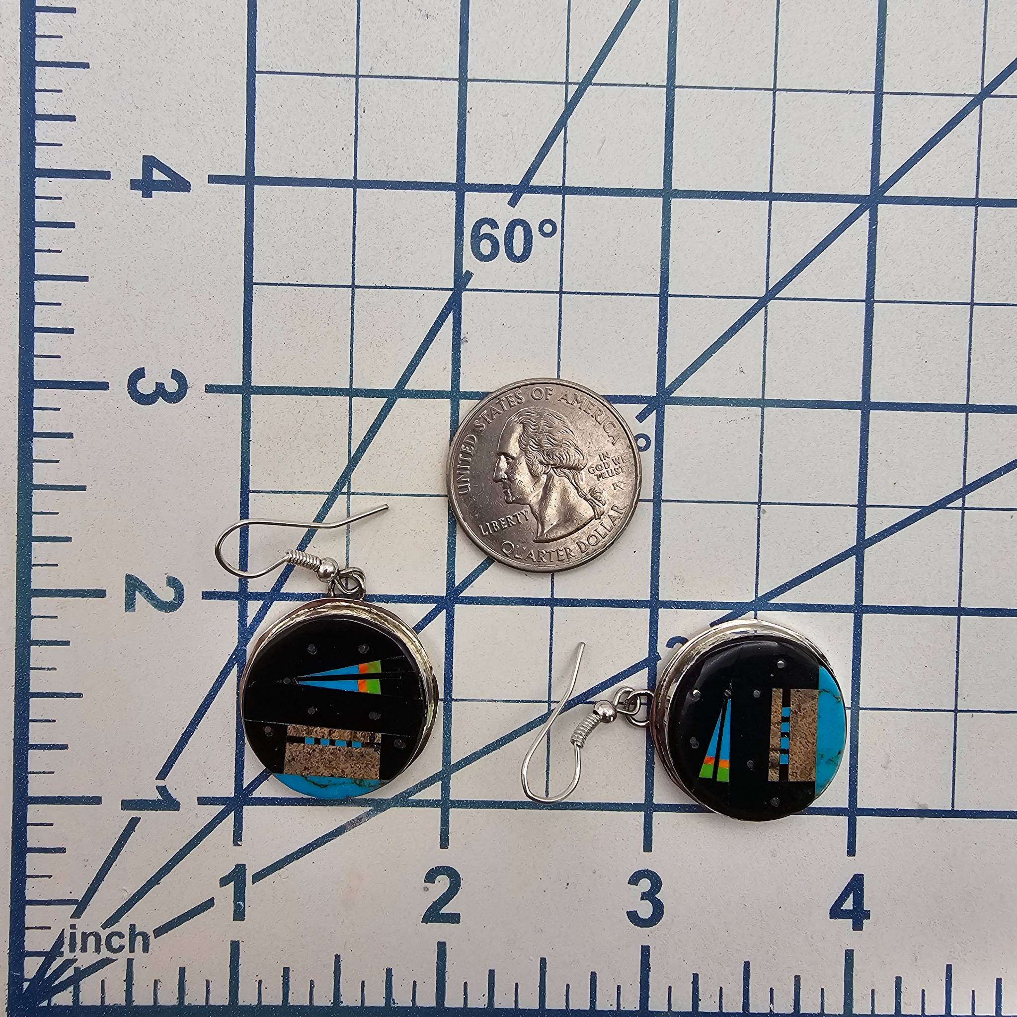 Handmade sterling silver earrings by Navajo artisan Gilbert Smith, featuring a multi-stone inlay design. The earrings are round in shape, with a mix of turquoise and other colored stone accents. Each earring is marked with the artisan’s hallmark on the back. The combined weight is approximately 7.2 grams. Dimensions of the earrings are as indicated in the scale images.