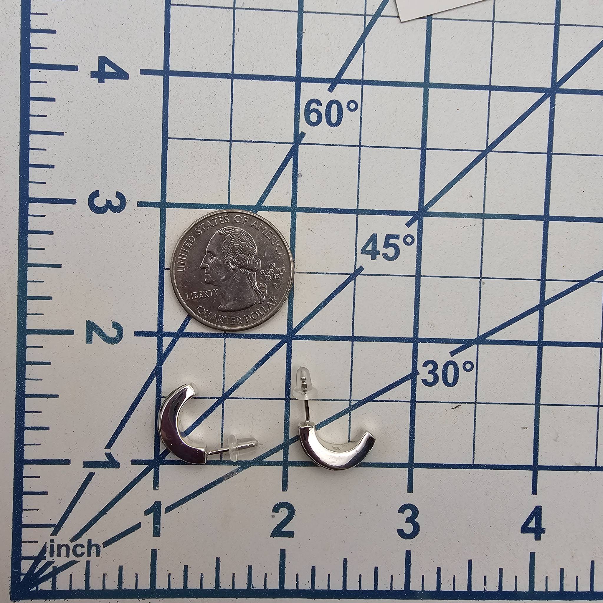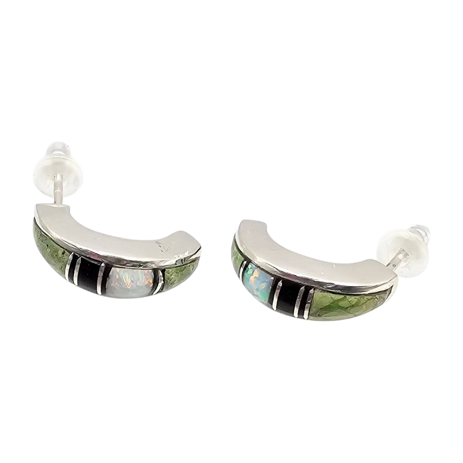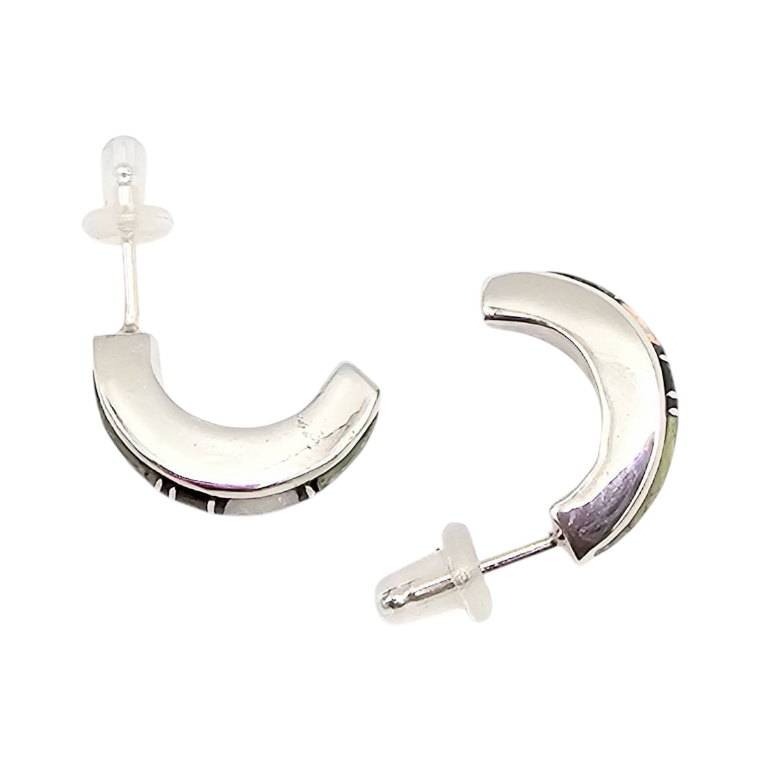 Rick Tolino handmade Navajo earrings crafted from sterling silver. The earrings feature a crescent hoop design with multicolor inlay details and are secured with clear backings. They have a total weight of 3.7 grams as shown on the scale. Earring size is displayed against measurement references in the images.