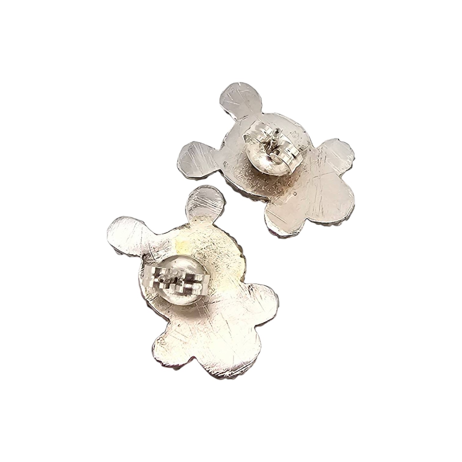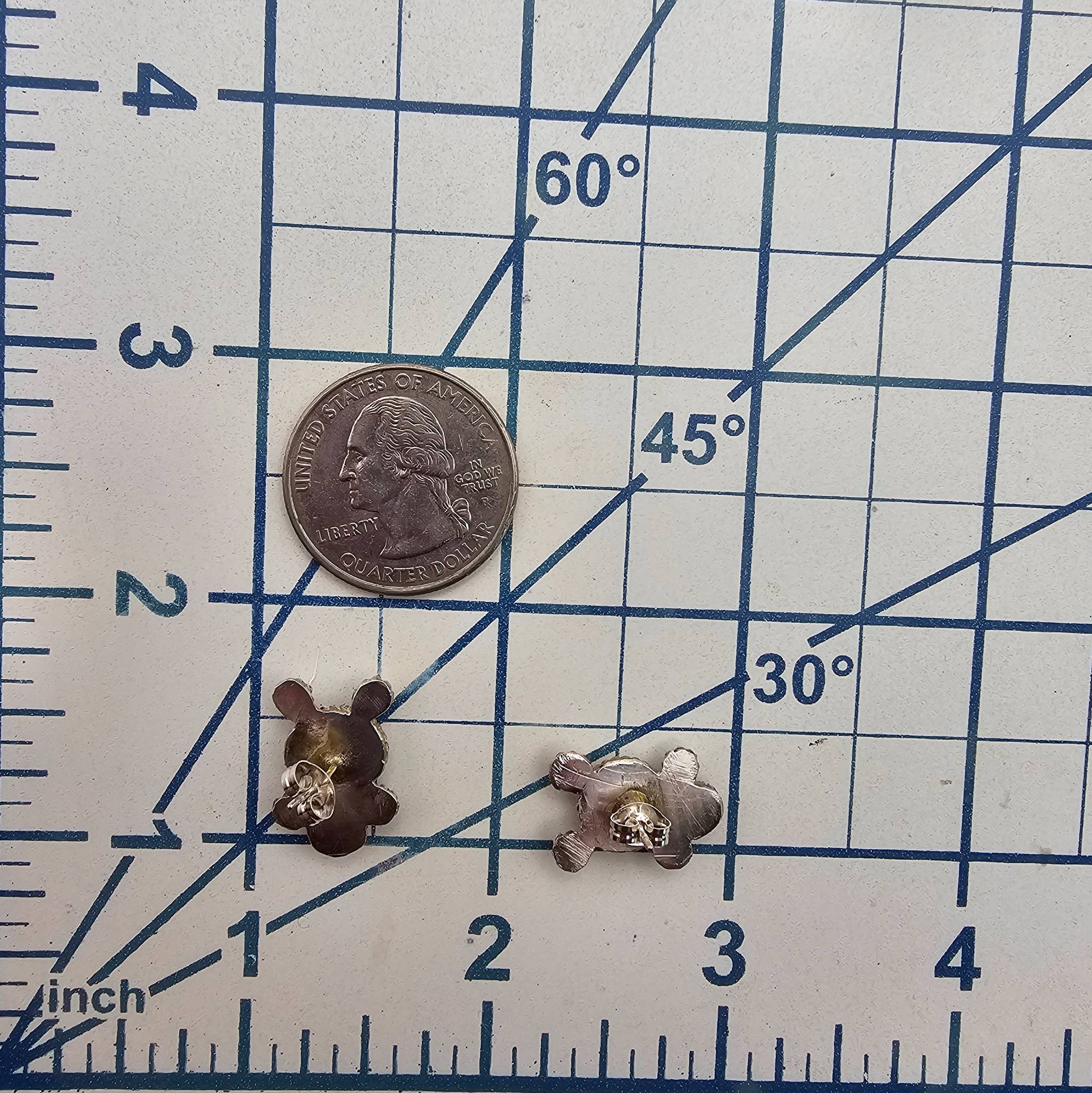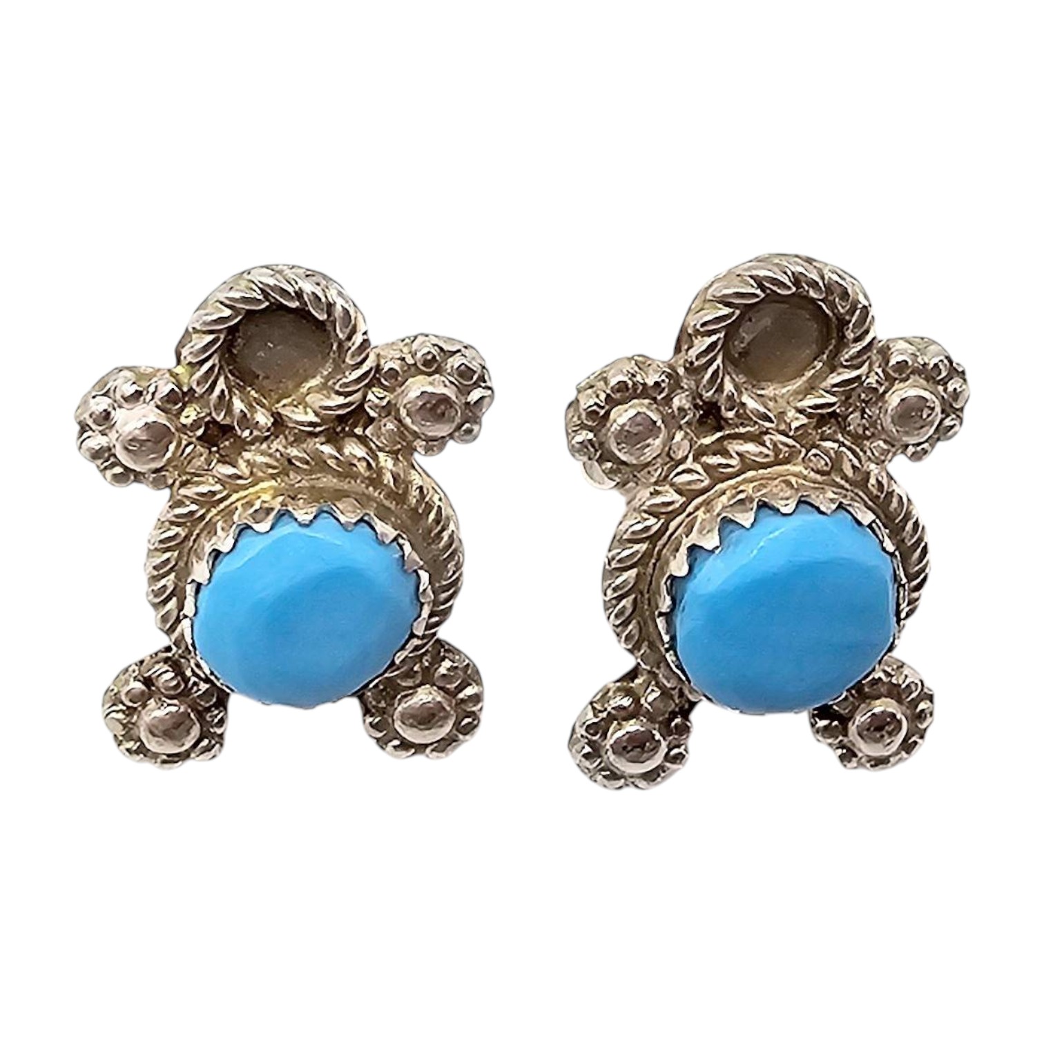 Janette Yatsa Zuni handmade sterling silver earrings featuring Kingman turquoise stones. Turtle-shaped design with intricate silverwork detailing. The earrings weigh approximately 3.9 grams and include secure post-style backings. A fine example of Zuni craftsmanship, perfect for collectors or enthusiasts of Native American jewelry.