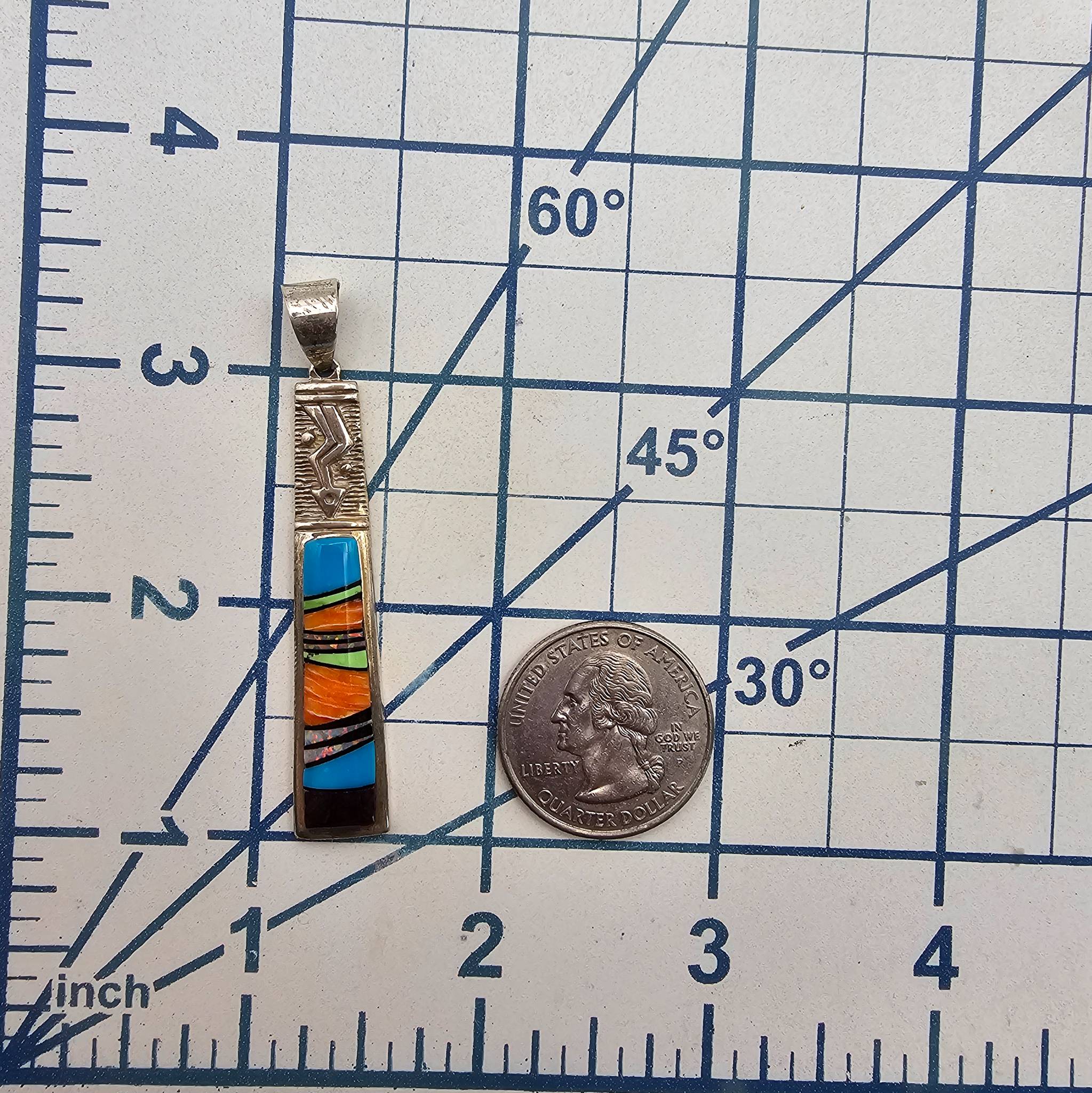 Sterling silver pendant featuring a multi-stone inlay design created by Navajo artist Cordell Brown. The geometric pattern includes vibrant turquoise, coral, onyx, and other stones. The pendant is marked as handmade with intricate decorative silverwork near the bale. Measuring approximately 7.9 grams in weight, it is a fine piece of Navajo craftsmanship.