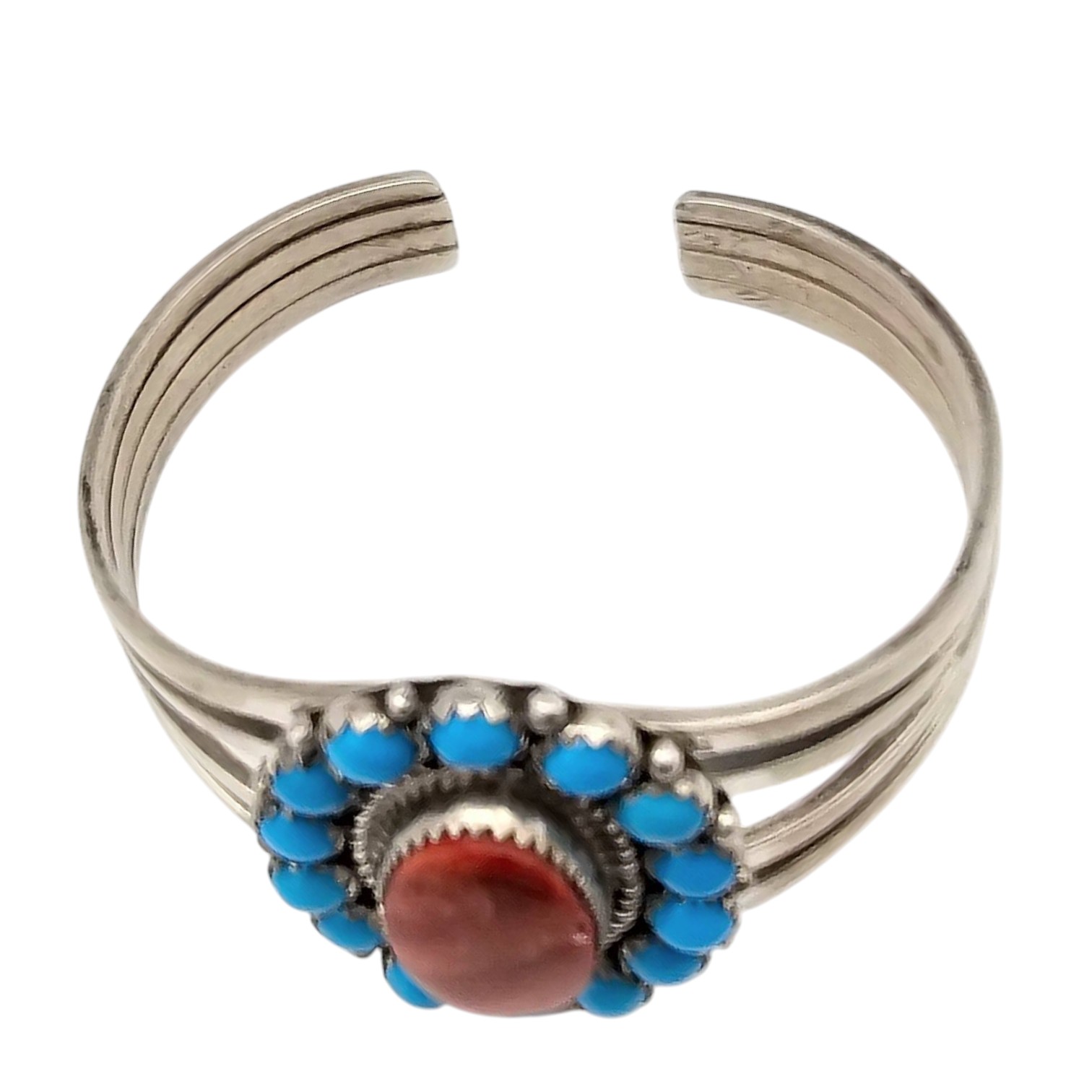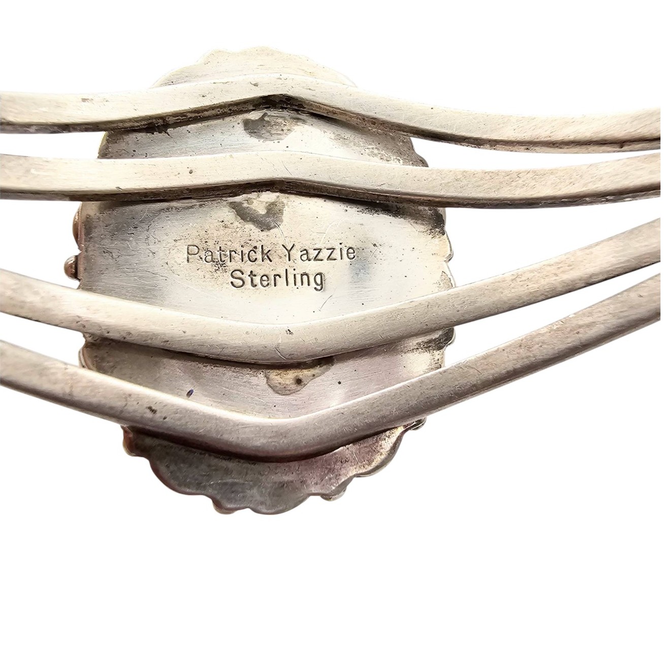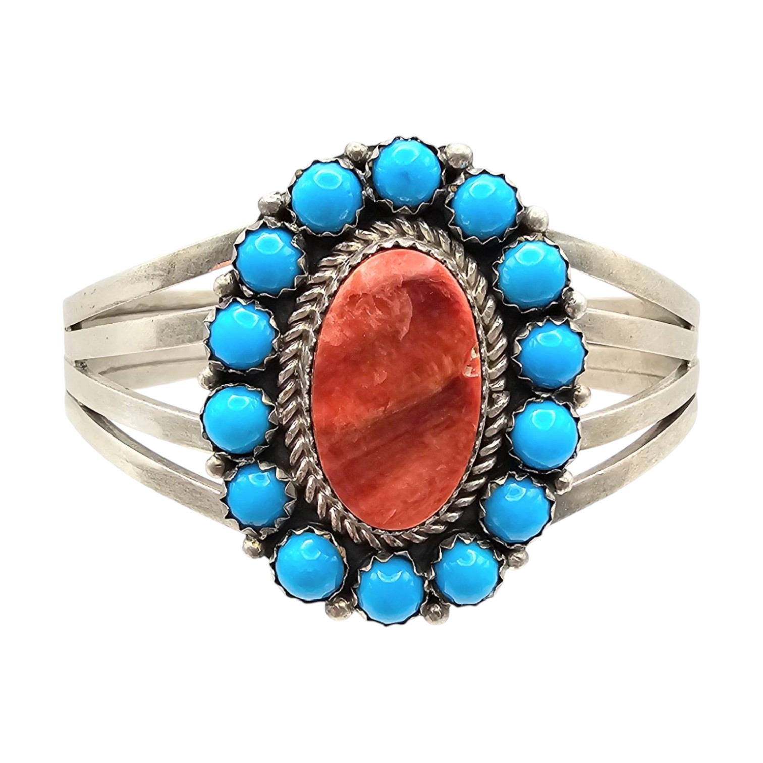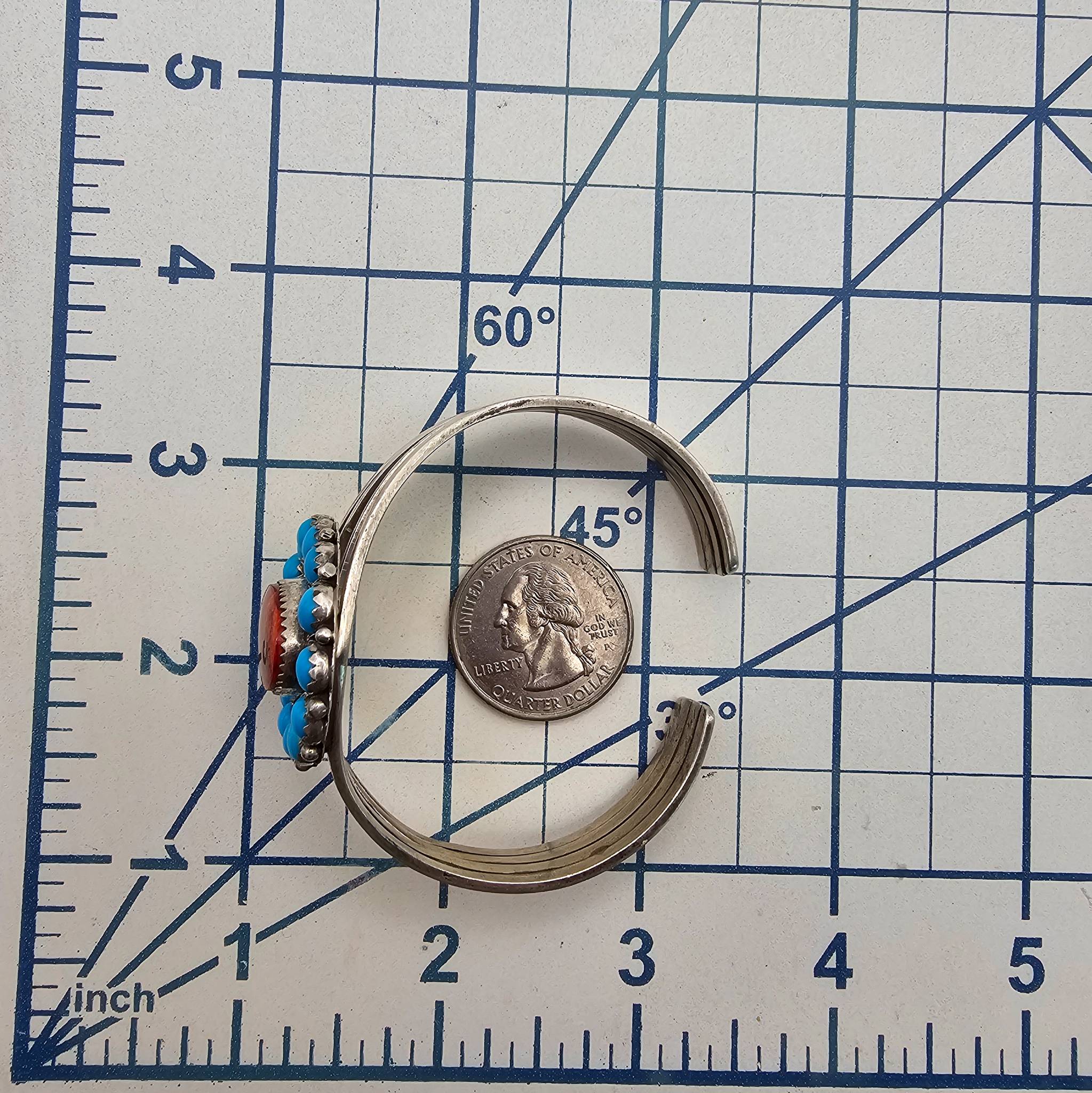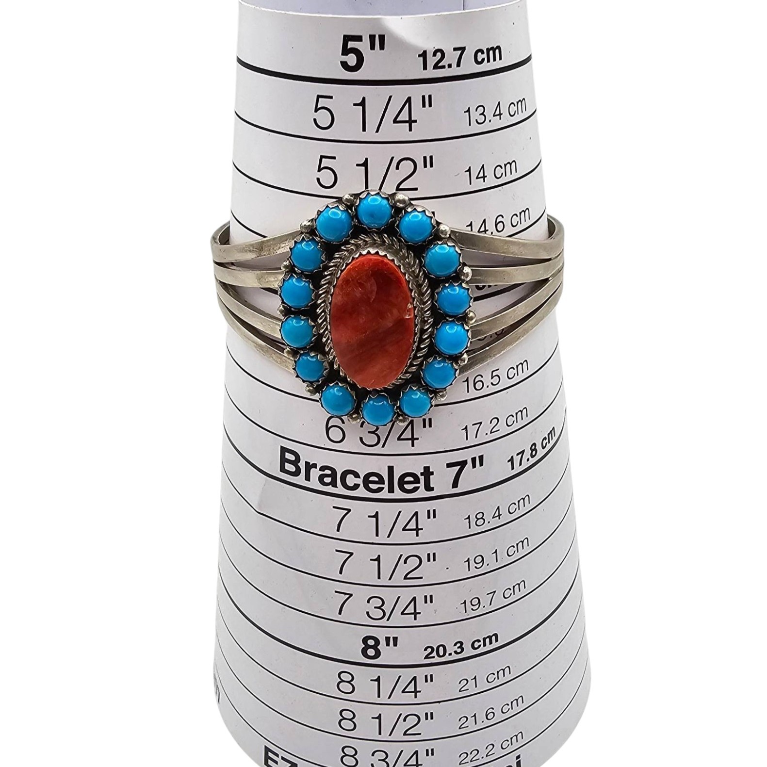 Sterling silver cuff bracelet crafted by Patrick Yazzie, featuring an oval red coral center stone surrounded by round spiney oyster cabochons in a roped and beaded design. The bracelet measures approximately 7 inches in circumference according to the bracelet sizing chart. Total weight is 33.4 grams, as shown on the scale. Marked ‘Patrick Yazzie Sterling’ on the reverse.