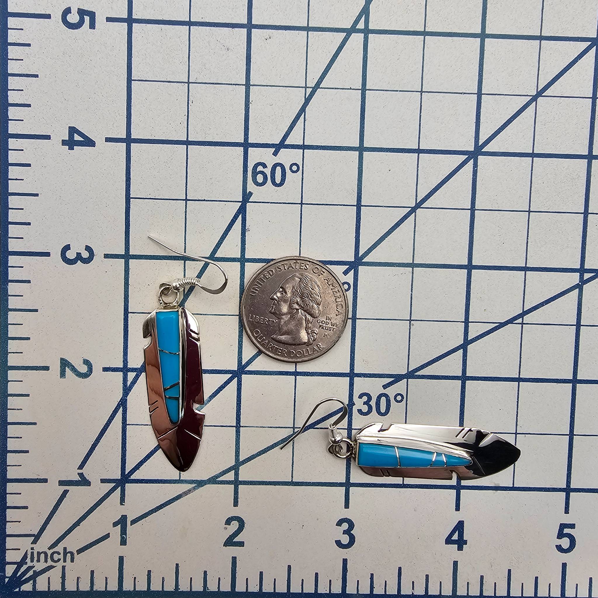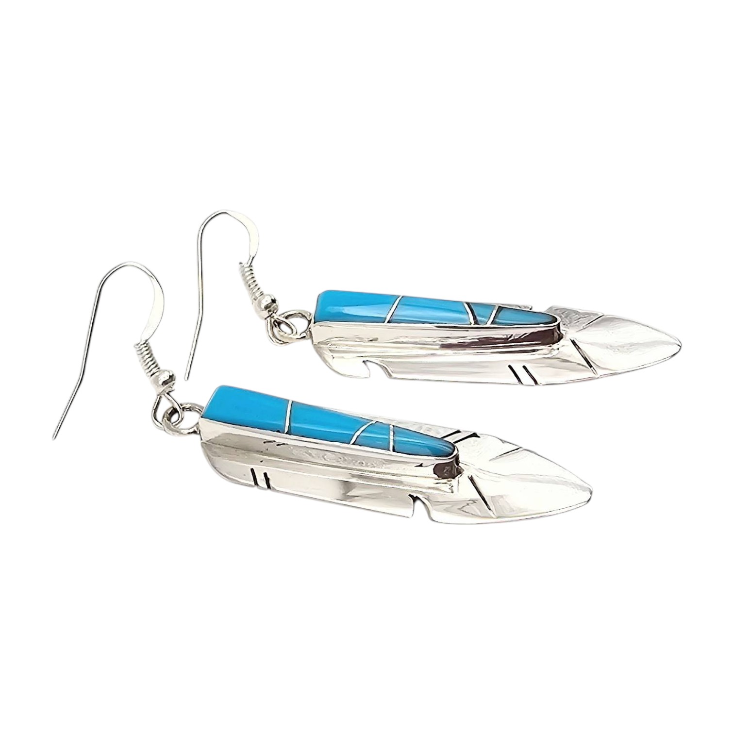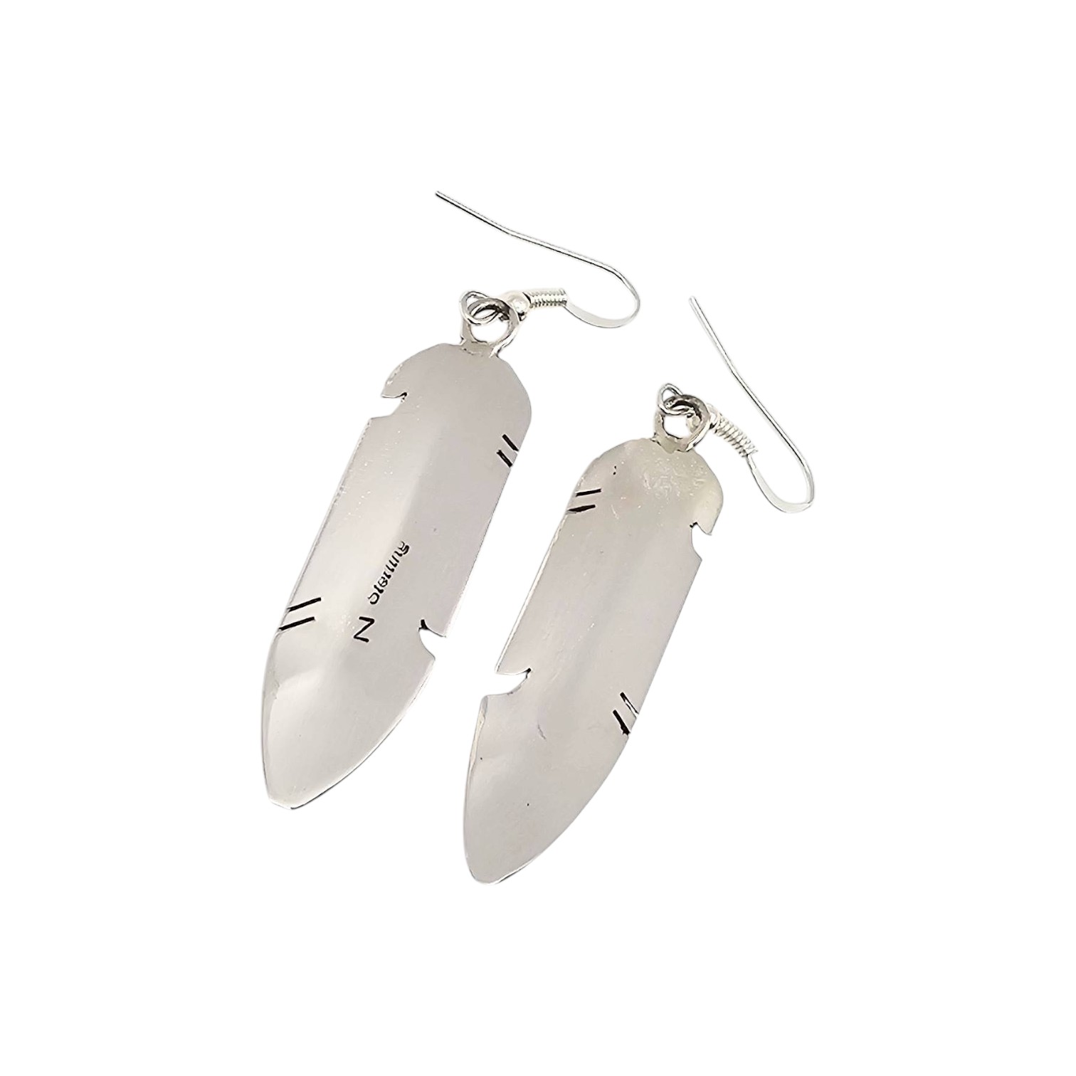 Handcrafted feather-shaped earrings by Navajo artisan Mary Yazzie. Made of sterling silver with inlaid turquoise, they feature a detailed design true to traditional Native American craftsmanship. Weighing 5.2 grams, they measure approximately 2 inches in length. Signed by the artisan on the back.