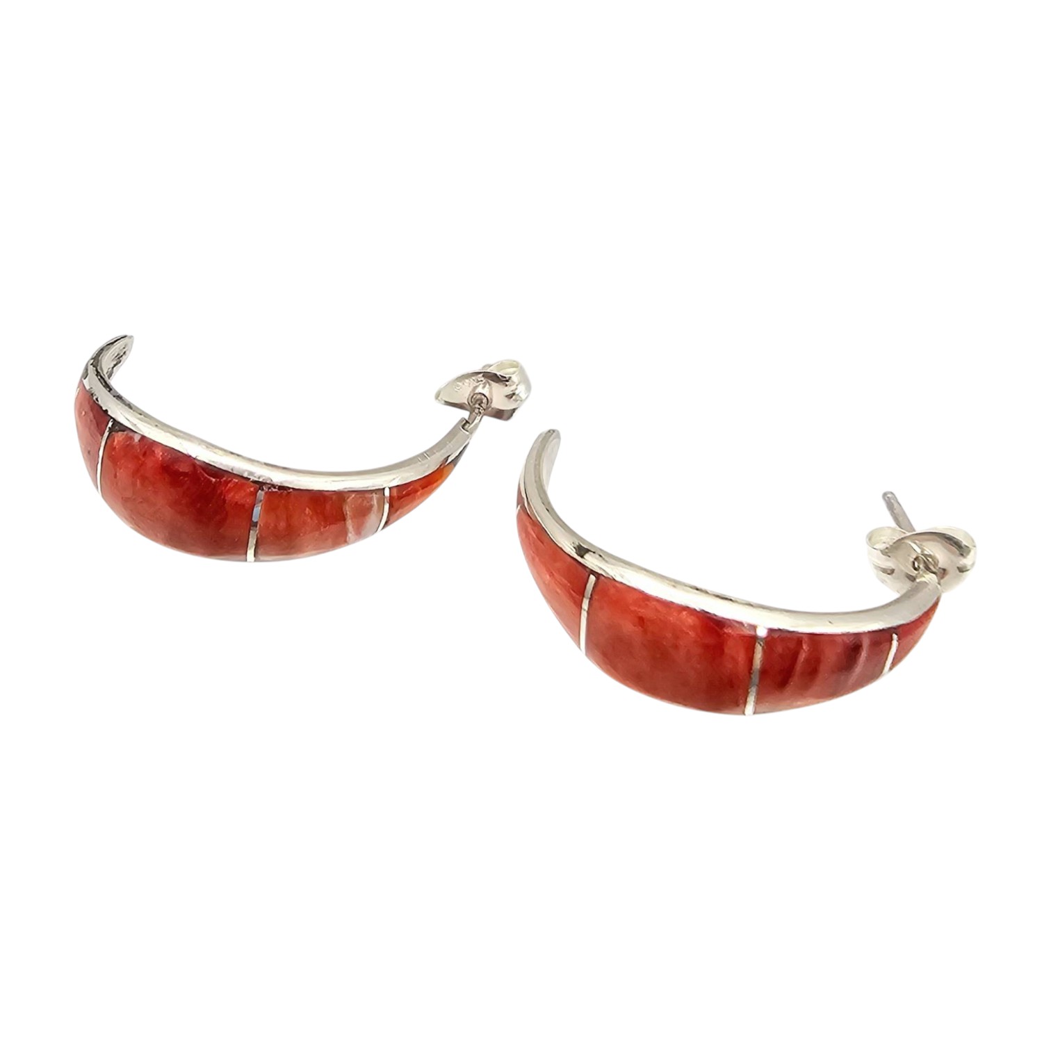 James Kee Zuni artist signed crescent-shaped hoop earrings crafted from sterling silver and featuring spiny oyster accents. Earrings weigh approximately 2.9 grams collectively, as displayed in the image. The design incorporates inlaid spiny oyster pieces separated by silver channels, showcasing traditional craftsmanship. Includes secure post backings.