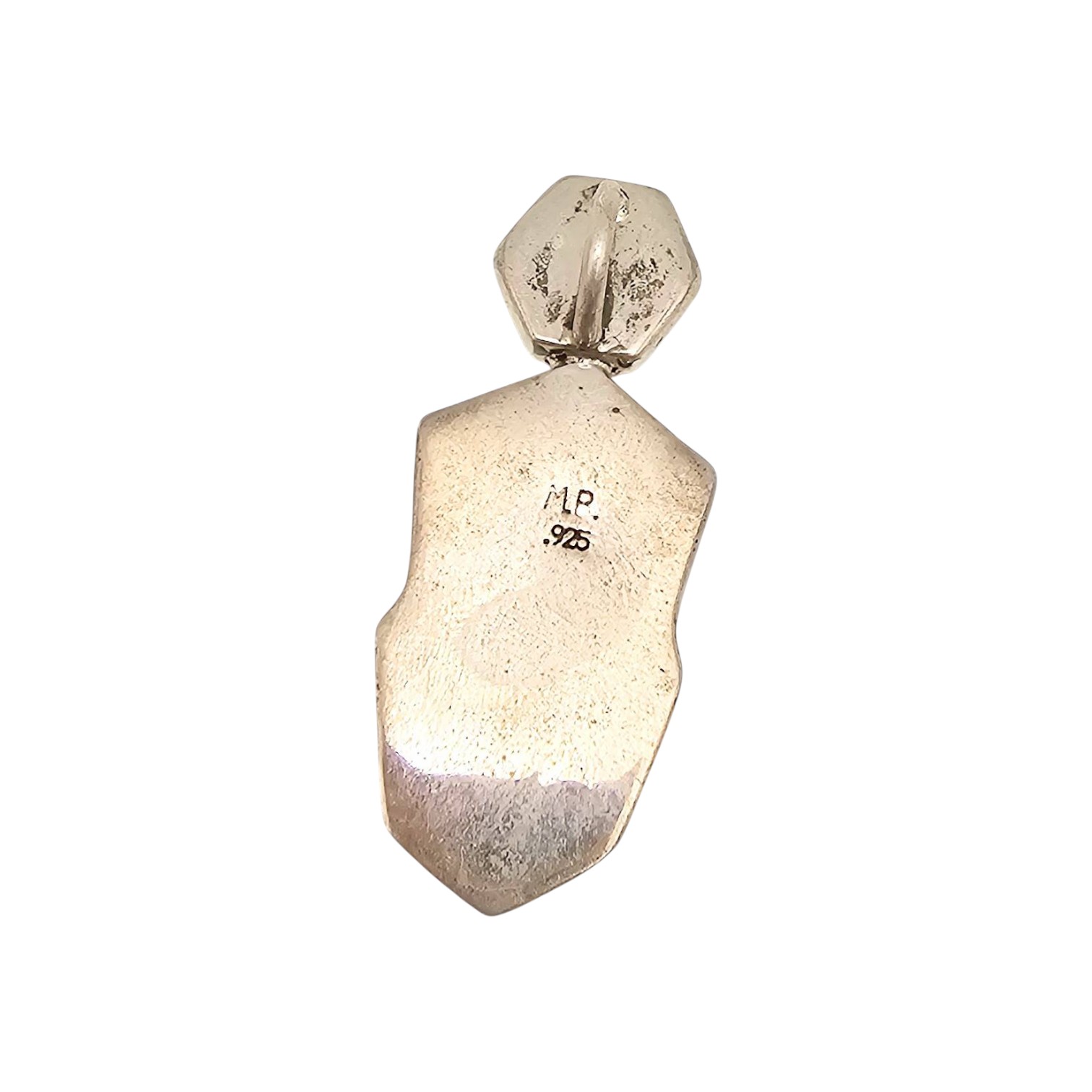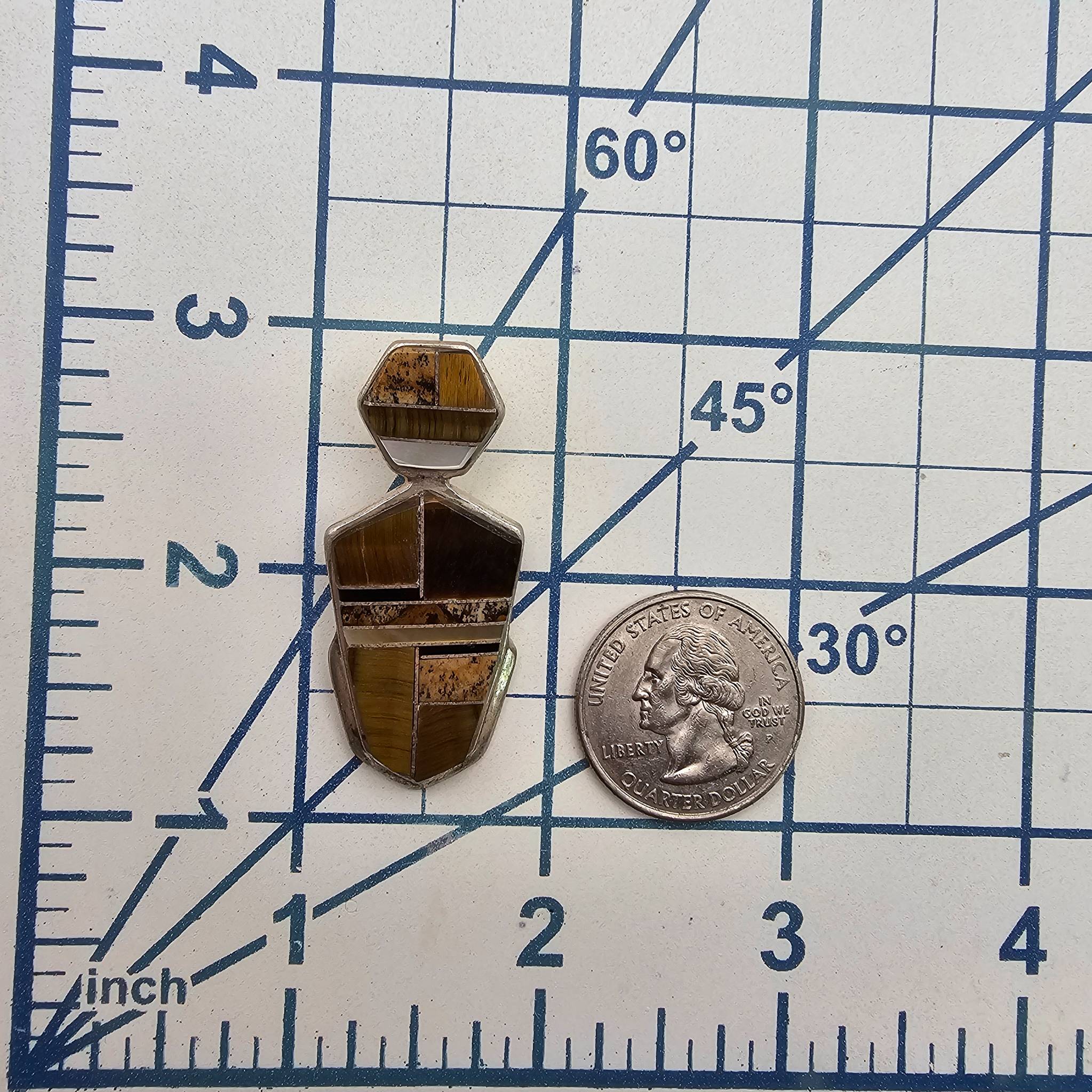 Handmade sterling silver pendant by Wilson Dawes, a Navajo craftsman. Features an earthtone inlay design with Agate, Tiger’s Eye, Mother Of Pearl, and Onyx stone accents in a geometric arrangement. Weighs approximately 10 grams, as shown on scale. Back is stamped “ALP” and “925” indicating sterling silver composition.