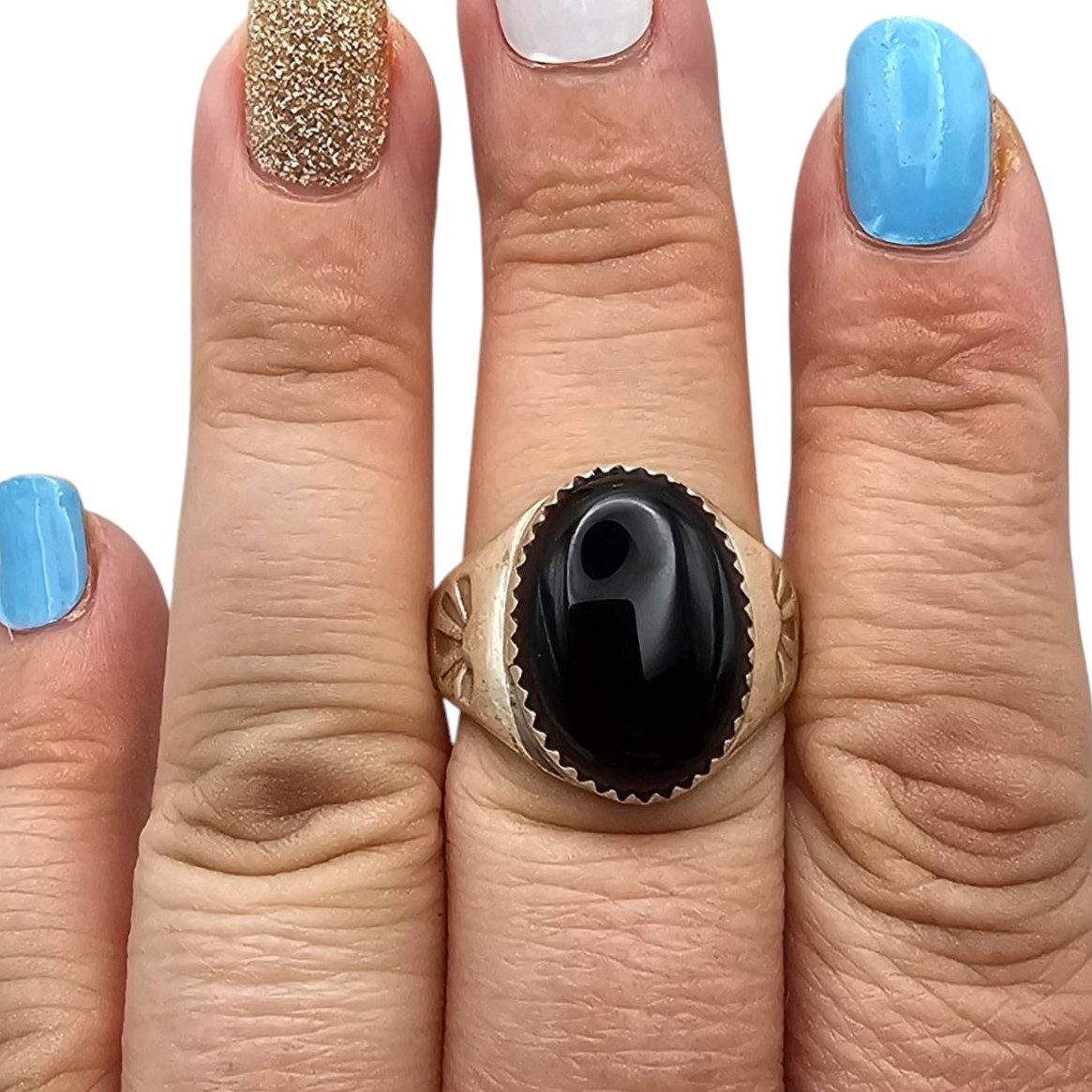 Sterling silver ring featuring a polished black onyx stone. Handmade by Navajo artisan Annie Lincoln, as noted. Ring size is 9.5, weighing 10.0 grams as confirmed on a scale. Intricate hand-engraving on the silver band adds artisan detail. Includes maker’s mark and material information.