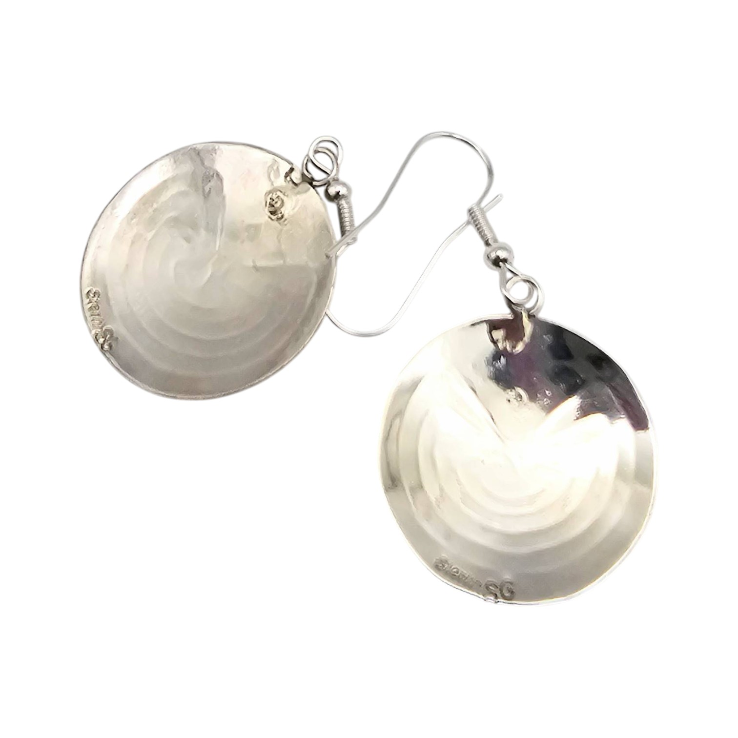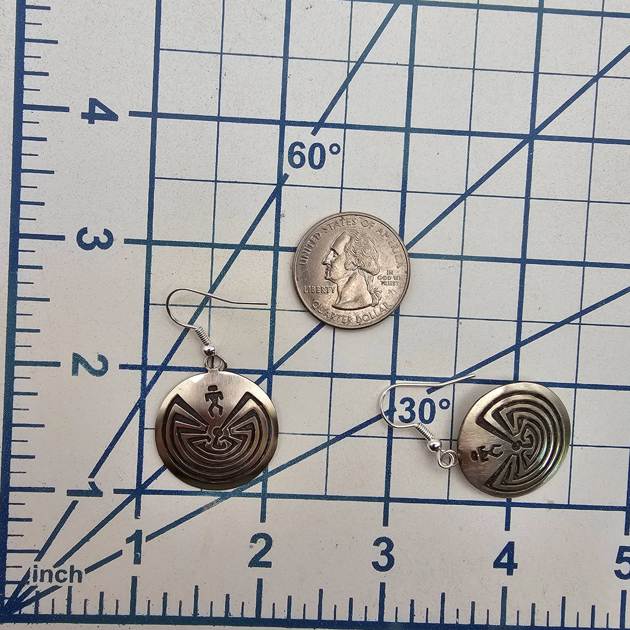 Handcrafted sterling silver earrings by Stanley Gene, a Navajo artisan. Featuring a maze design representing the path of life, these earrings weigh approximately 4.1 grams. Each earring has a round shape with sterling silver fishhook ear wires, suitable for pierced ears. The back is polished, marked with the artisan’s initials and sterling stamp.