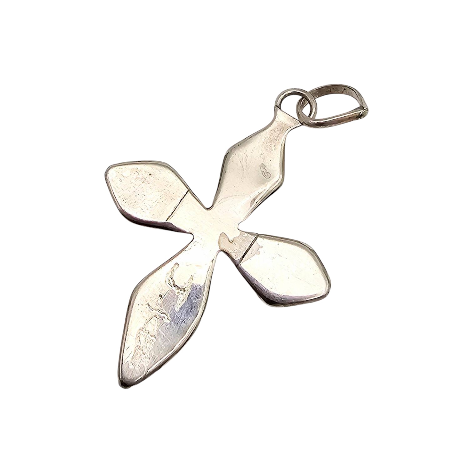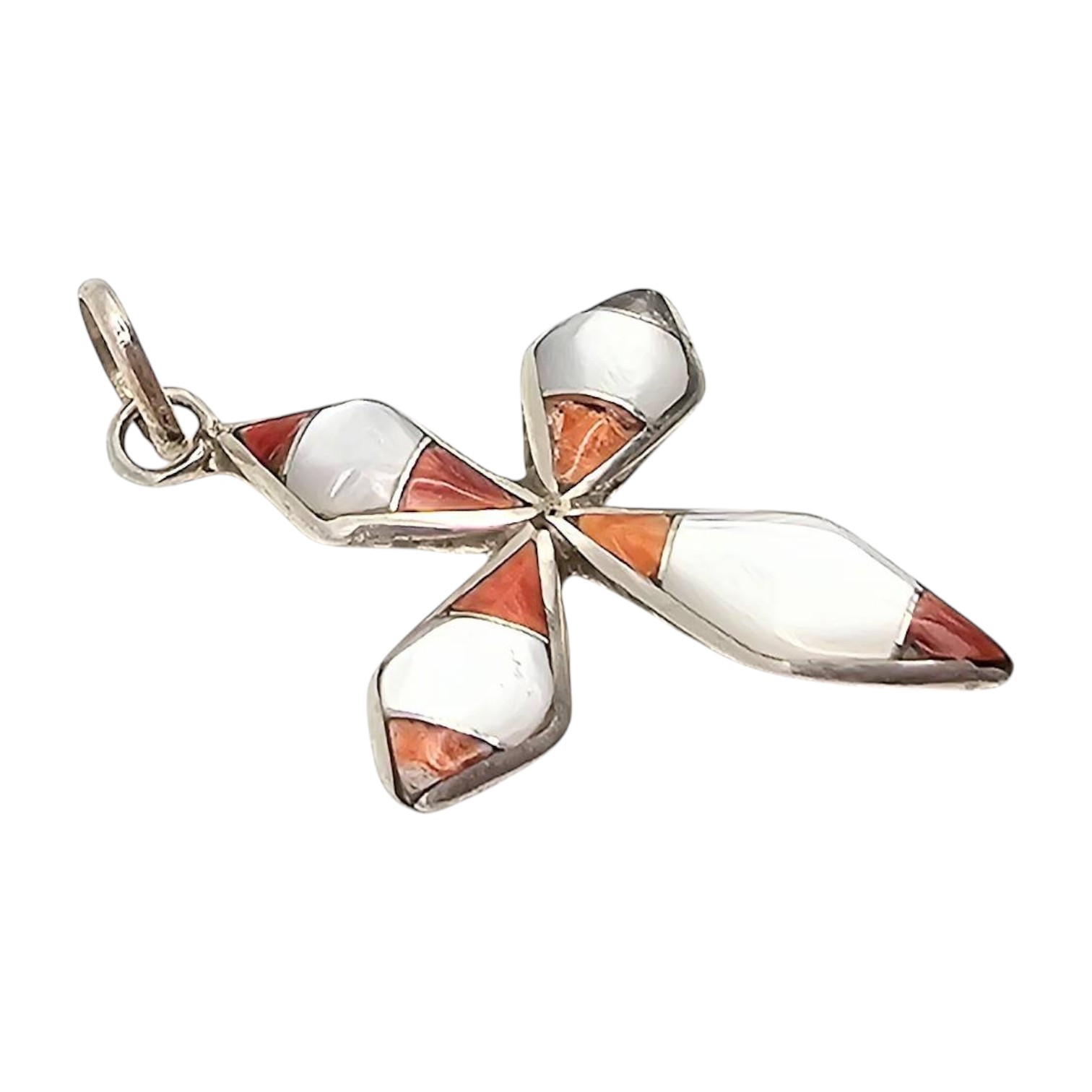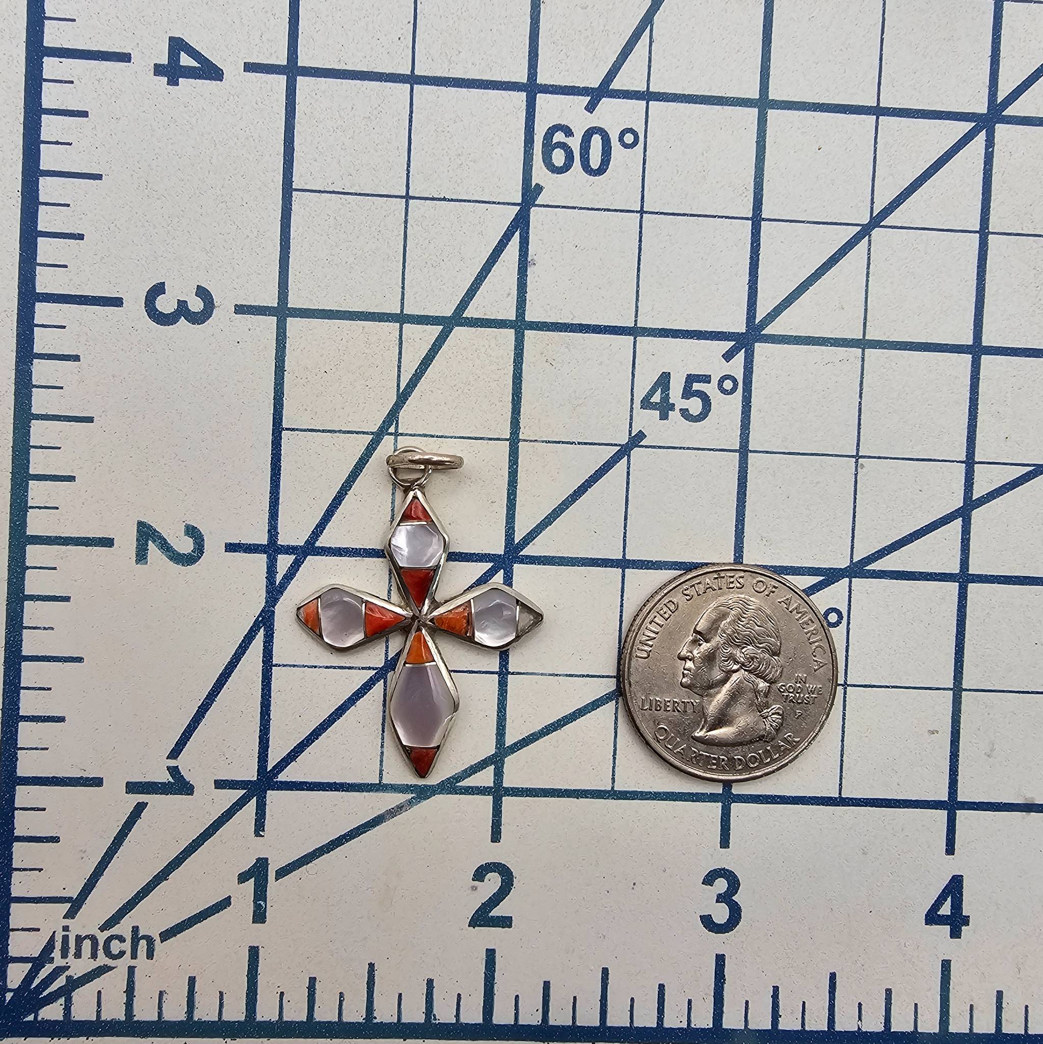 James Kee Navajo handmade sterling silver cross-shaped pendant features mother of pearl and coral inlay. The piece weighs 2.2 g and is approximately 1.5 inches in length, as indicated by the included scale and ruler.