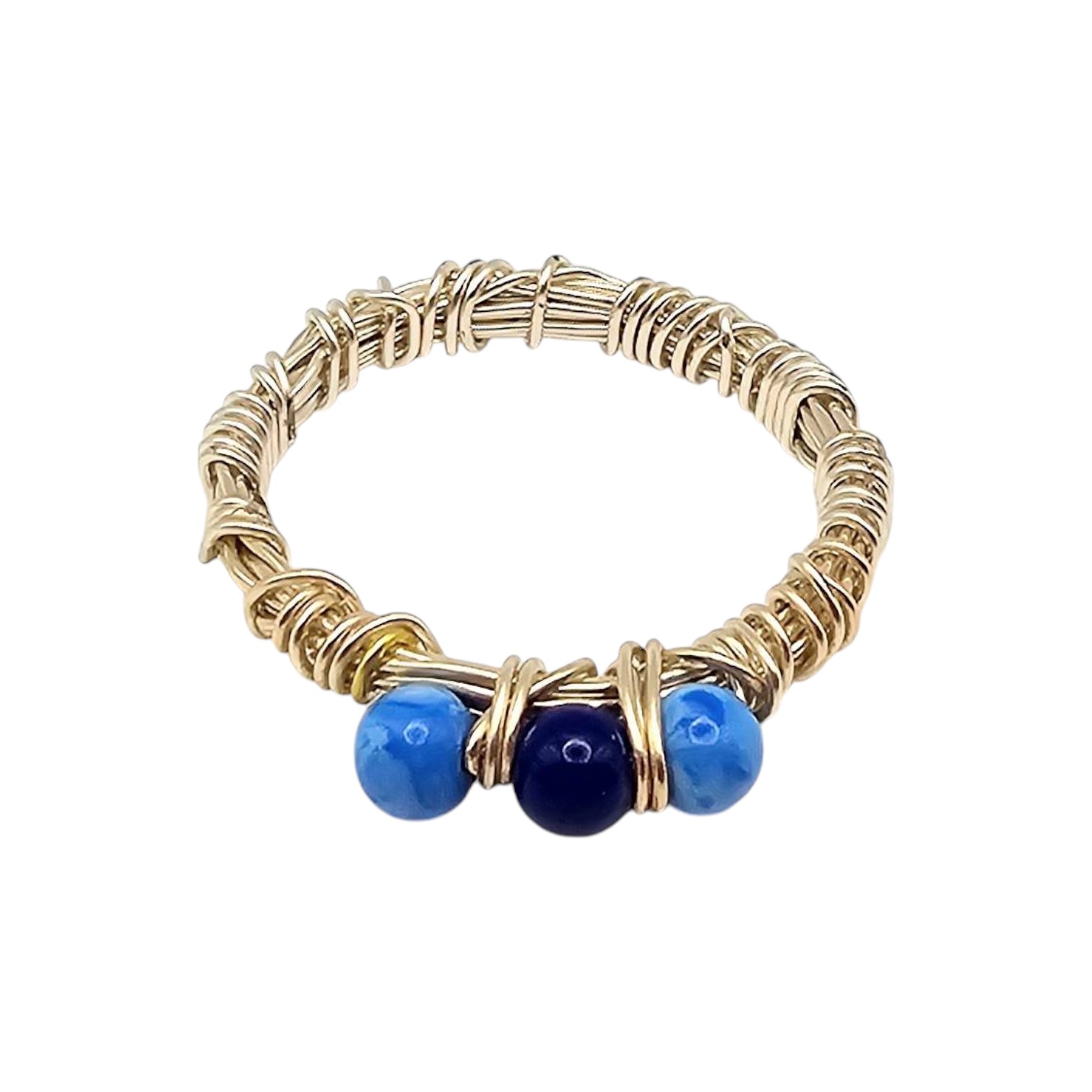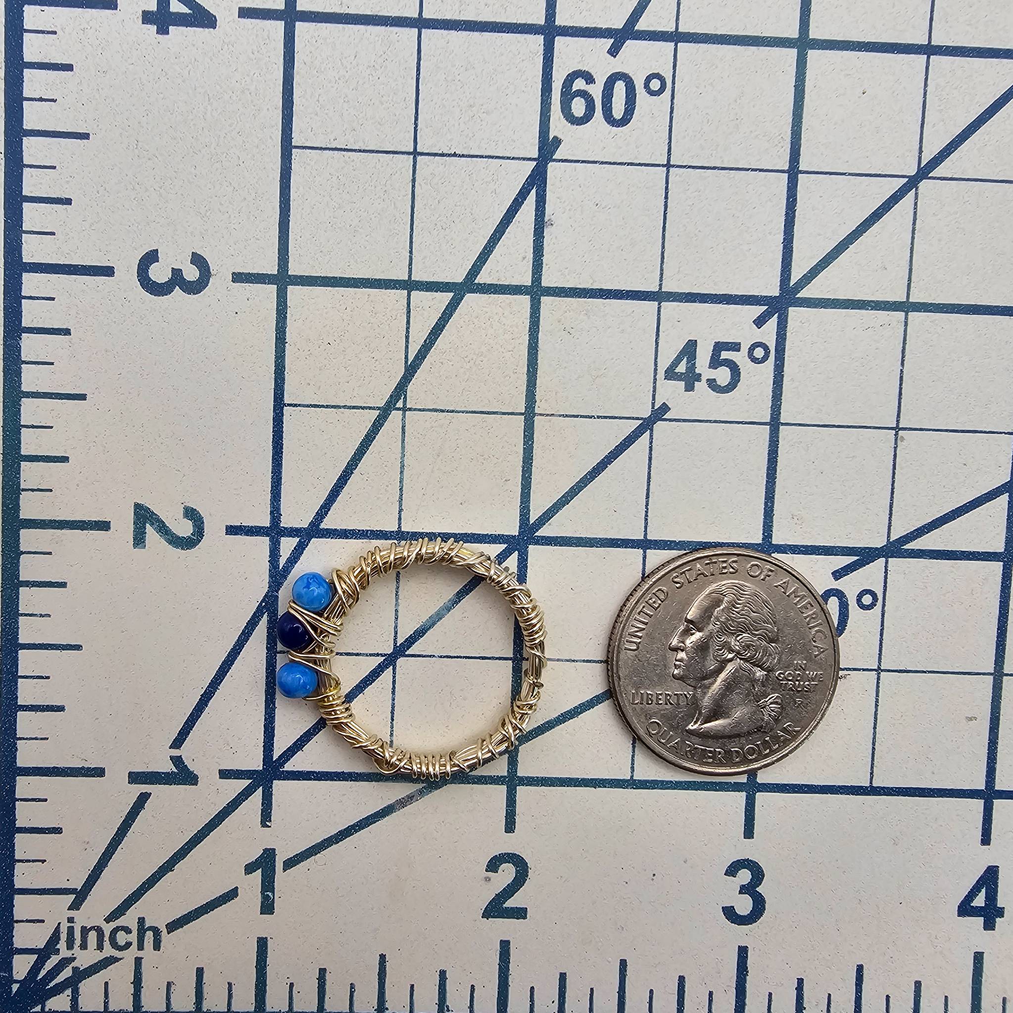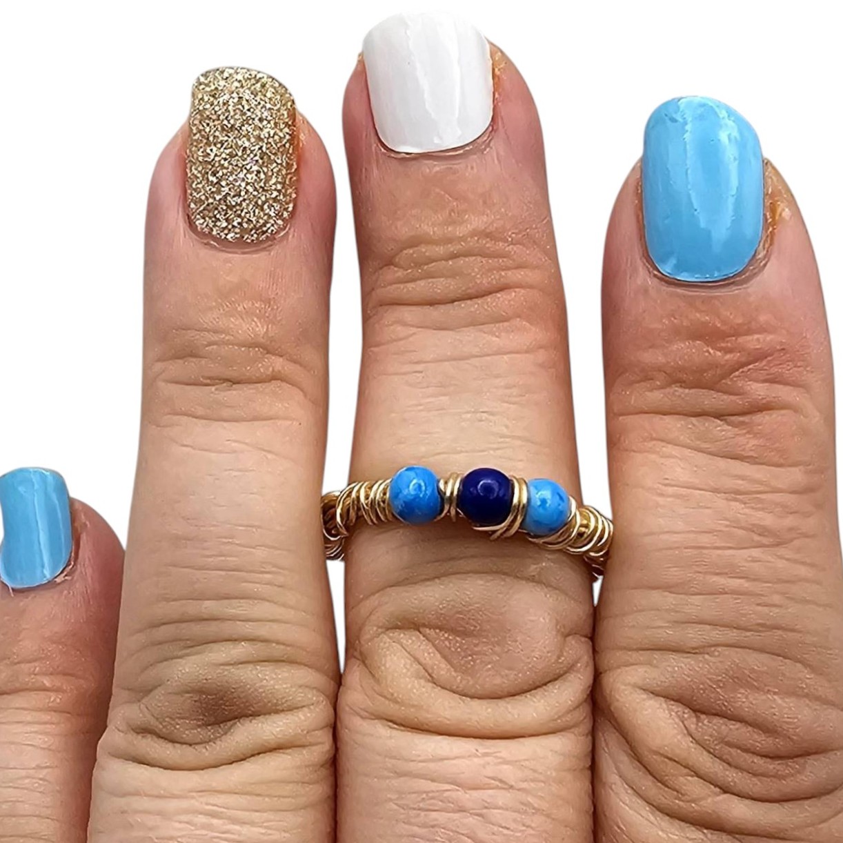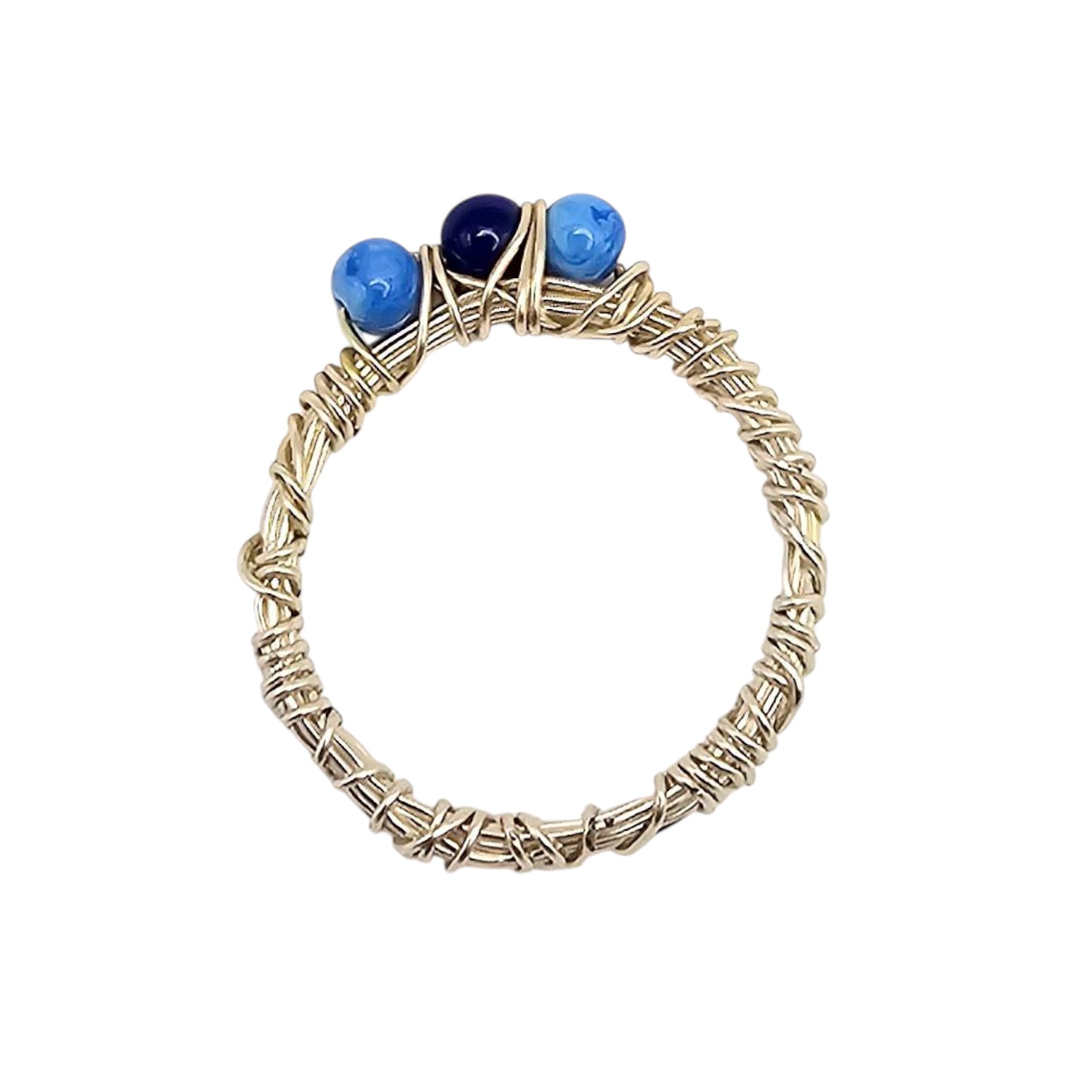 Handmade silver twist wire ring by Navajo artisan Linda Yazzie. Made with sterling silver and adorned with one lapis and two sodalite beads. Weighing approximately 2.3 grams. Ring size is 9.25. The design highlights traditional craftsmanship and contemporary simplicity.