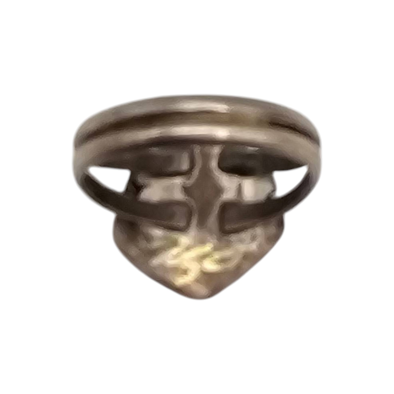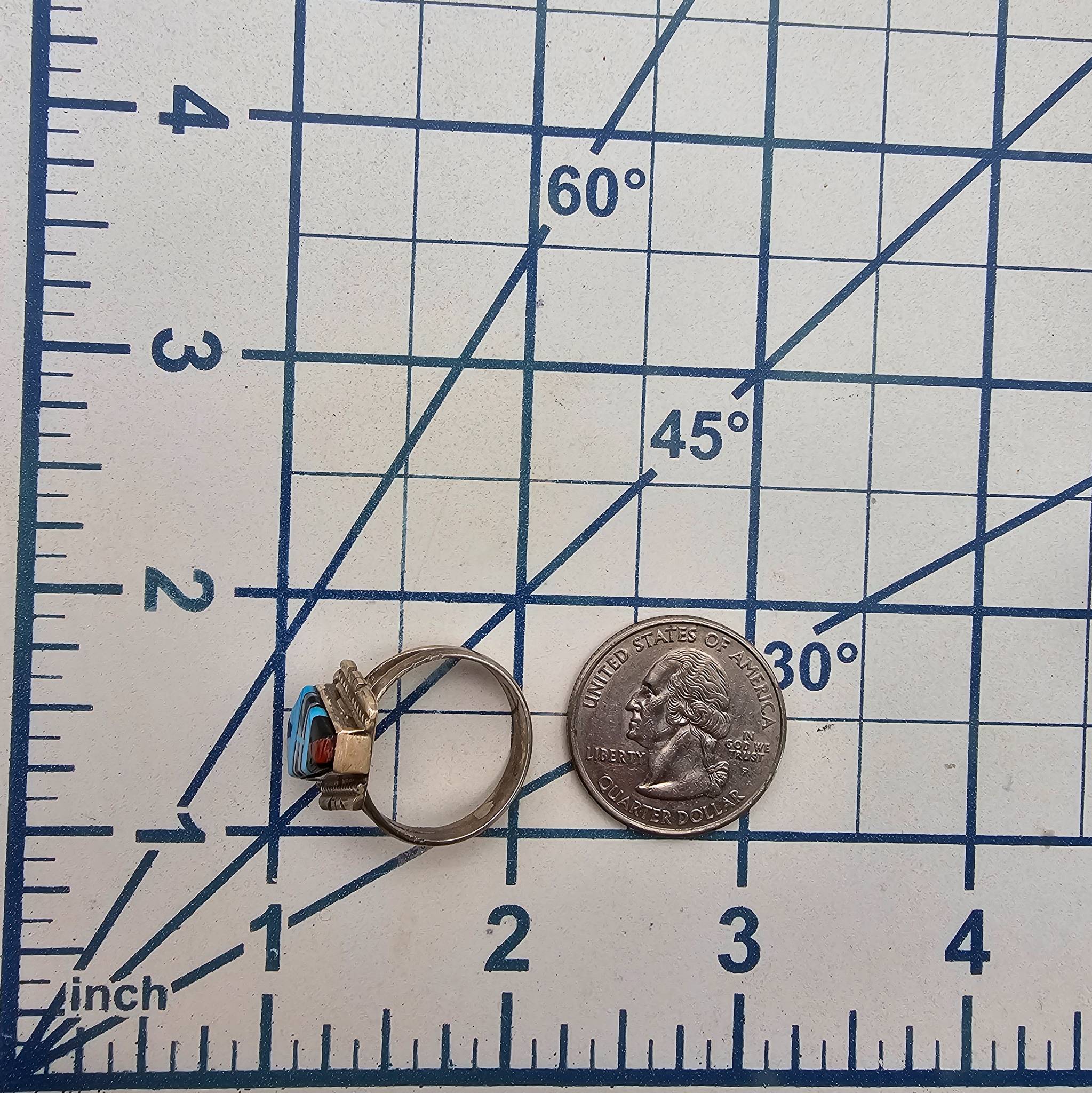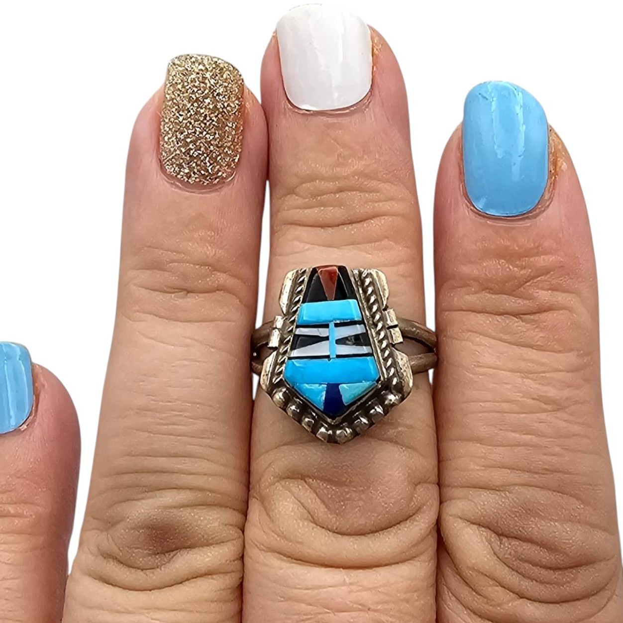 Sterling silver handmade ring by Navajo artisan Evelyn Platero, featuring a multi-color inlay design with turquoise, coral, and other stones. The ring is size 7.5 and weighs approximately 4 grams. The design showcases a distinctive geometric inlay set in a traditional Navajo style. Excellent craftsmanship and attention to detail.