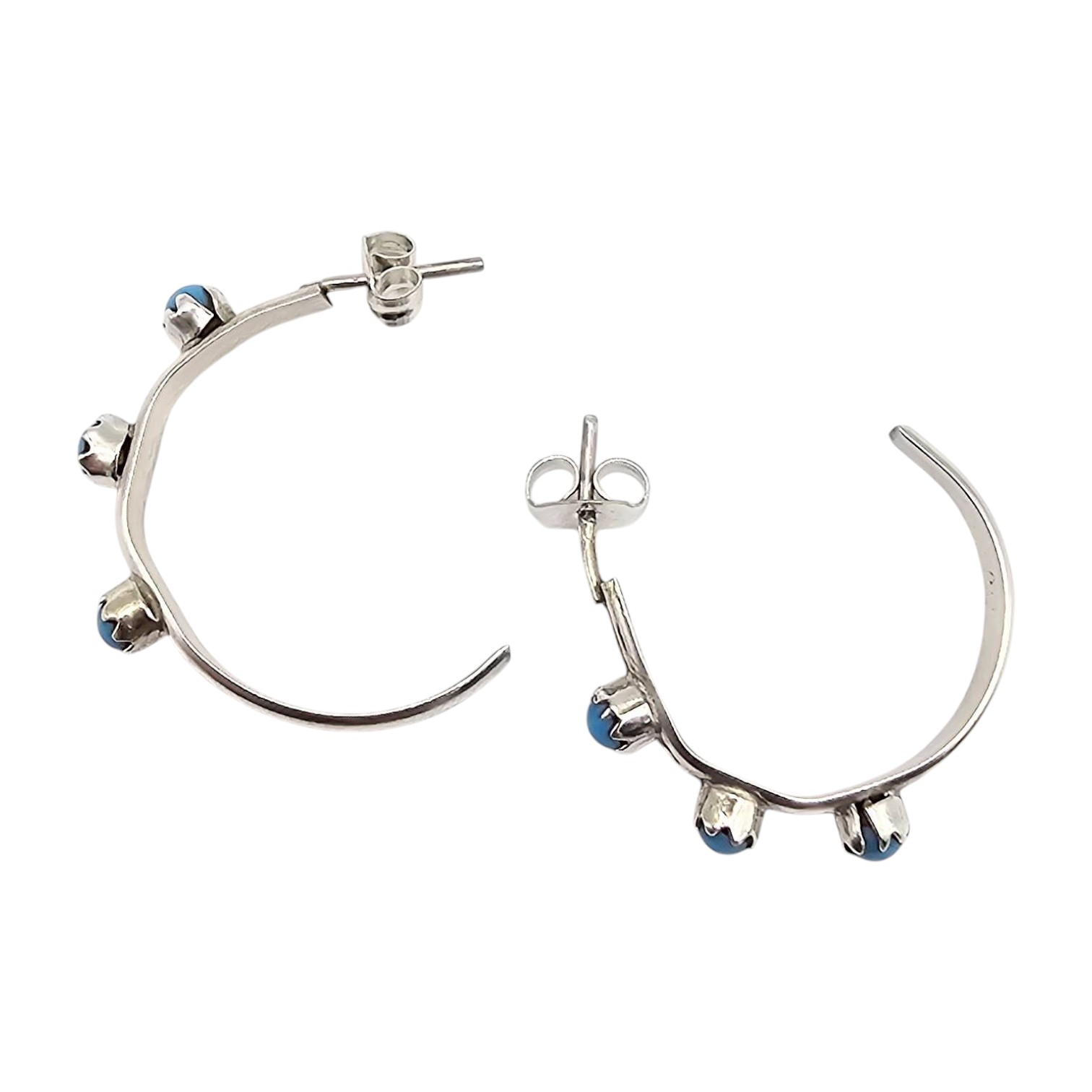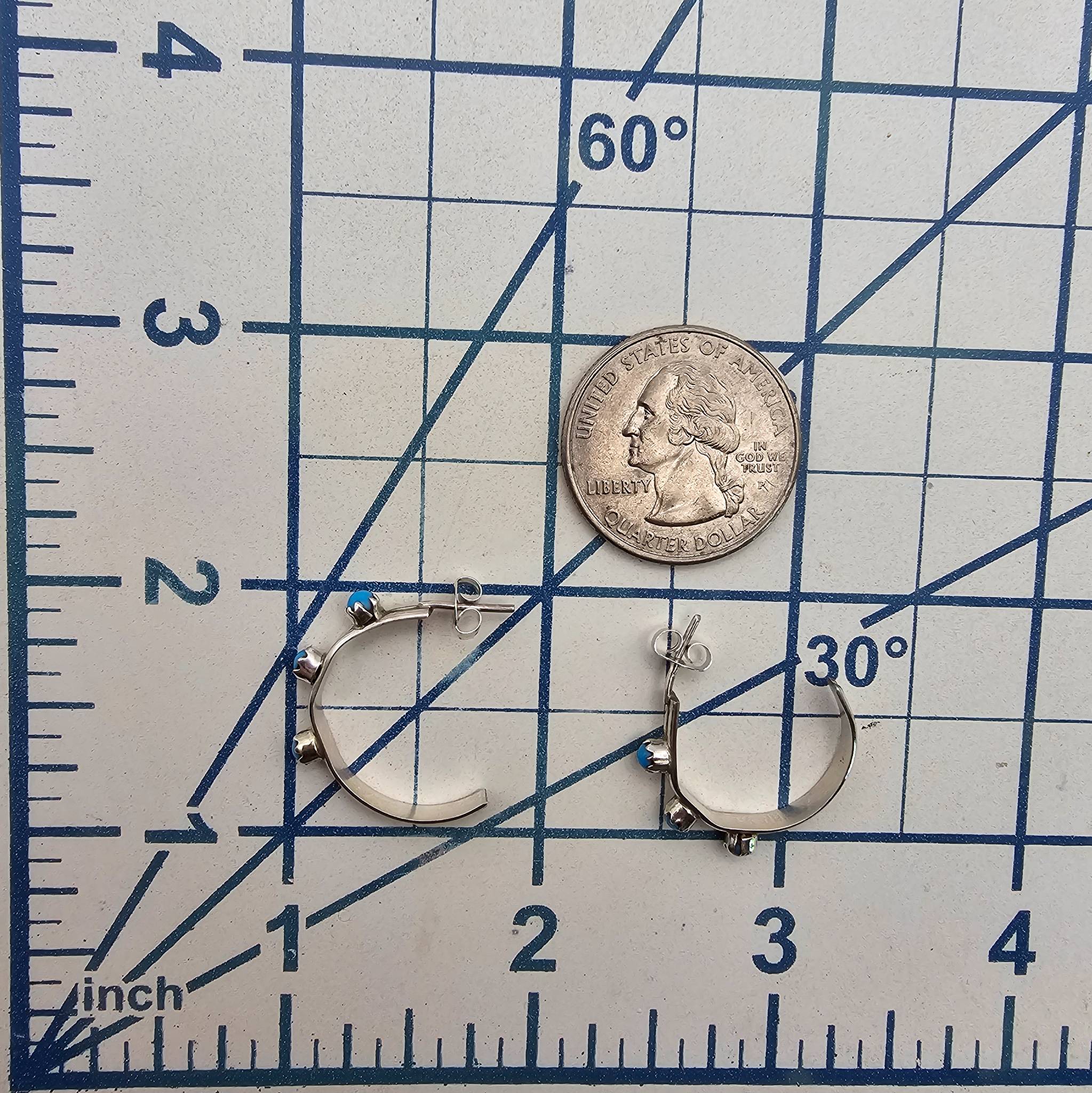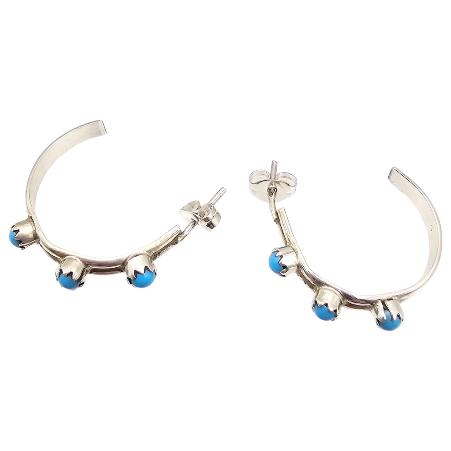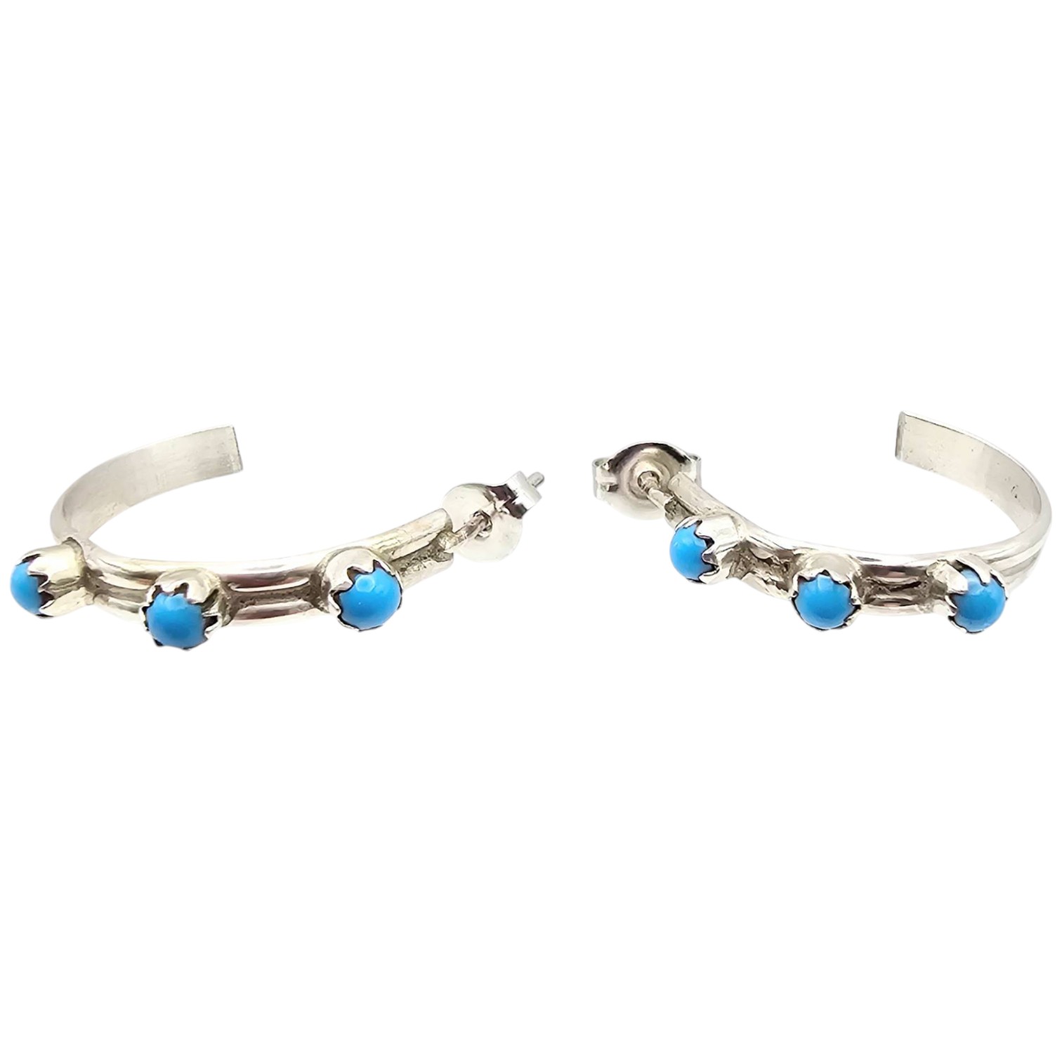 Marie Chee handmade Navajo earrings crafted in sterling silver and set with Kingman turquoise stones. The earrings feature a curved hoop design with three round turquoise accents on each earring. They weigh approximately 2.4g and measure less than an inch in diameter. Classic Navajo craftsmanship by a noted artisan.