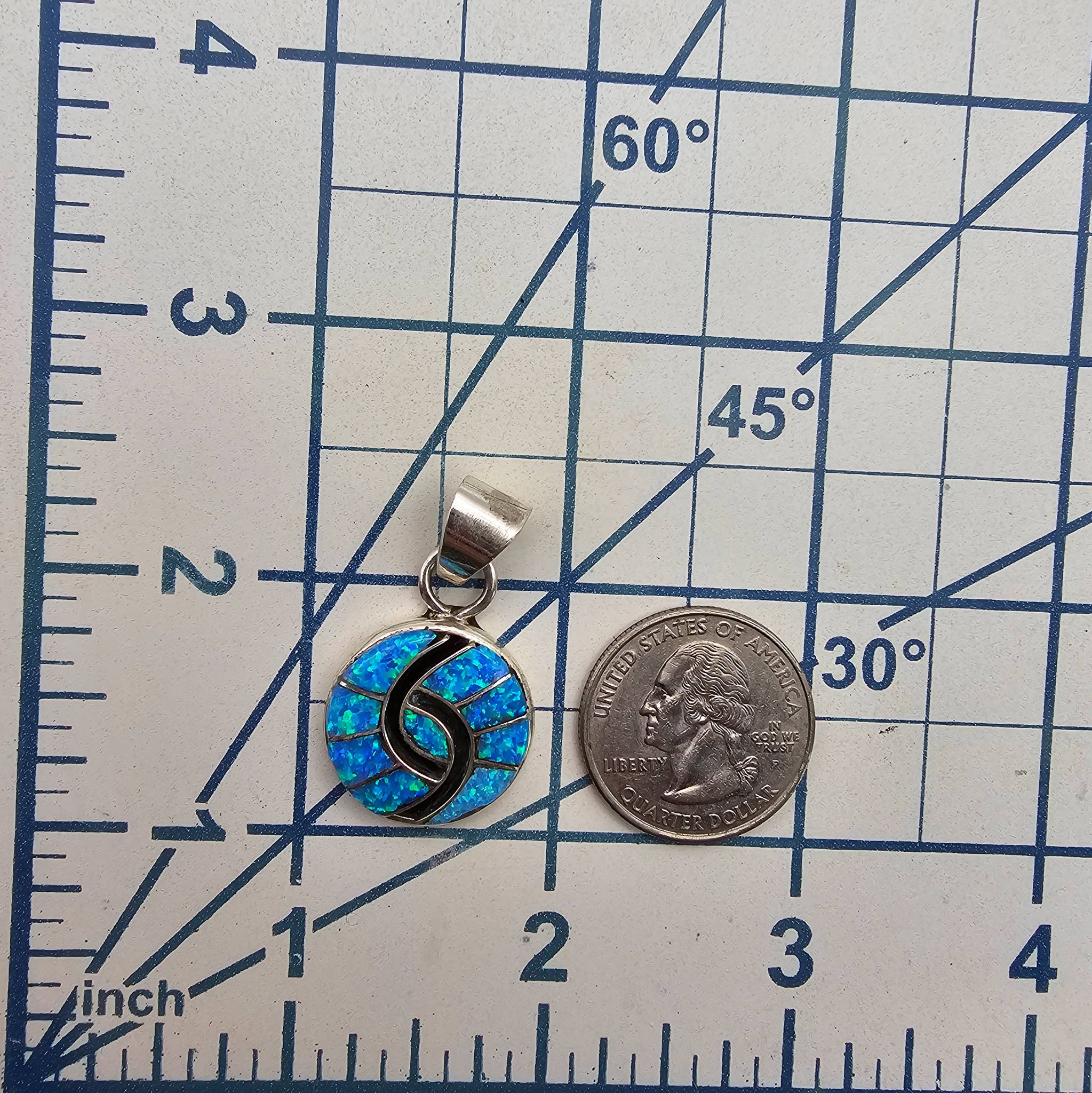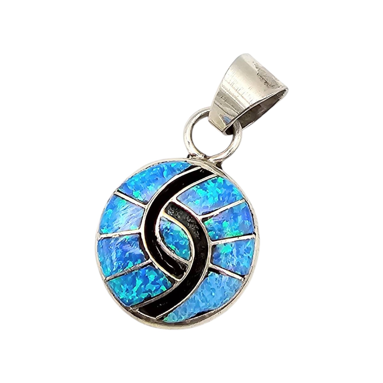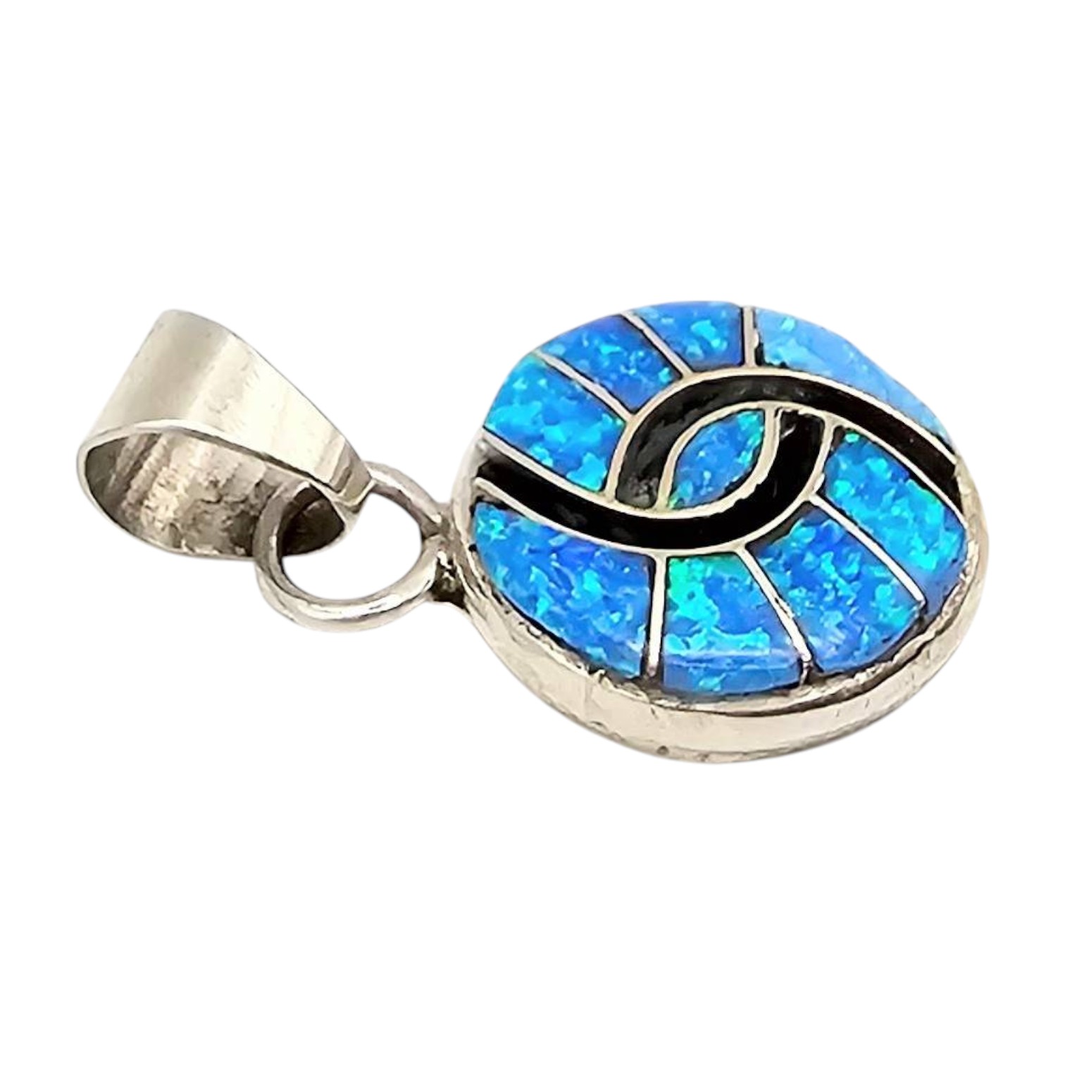 Handmade by Zuni artisan Amy Locasio, this pendant features sterling silver construction and vibrant blue opal inlay forming a striking design. The reverse is stamped “Zuni.” The pendant weighs 6.9 grams and has a height comparable to a U.S. quarter as shown. Originally priced at $275.