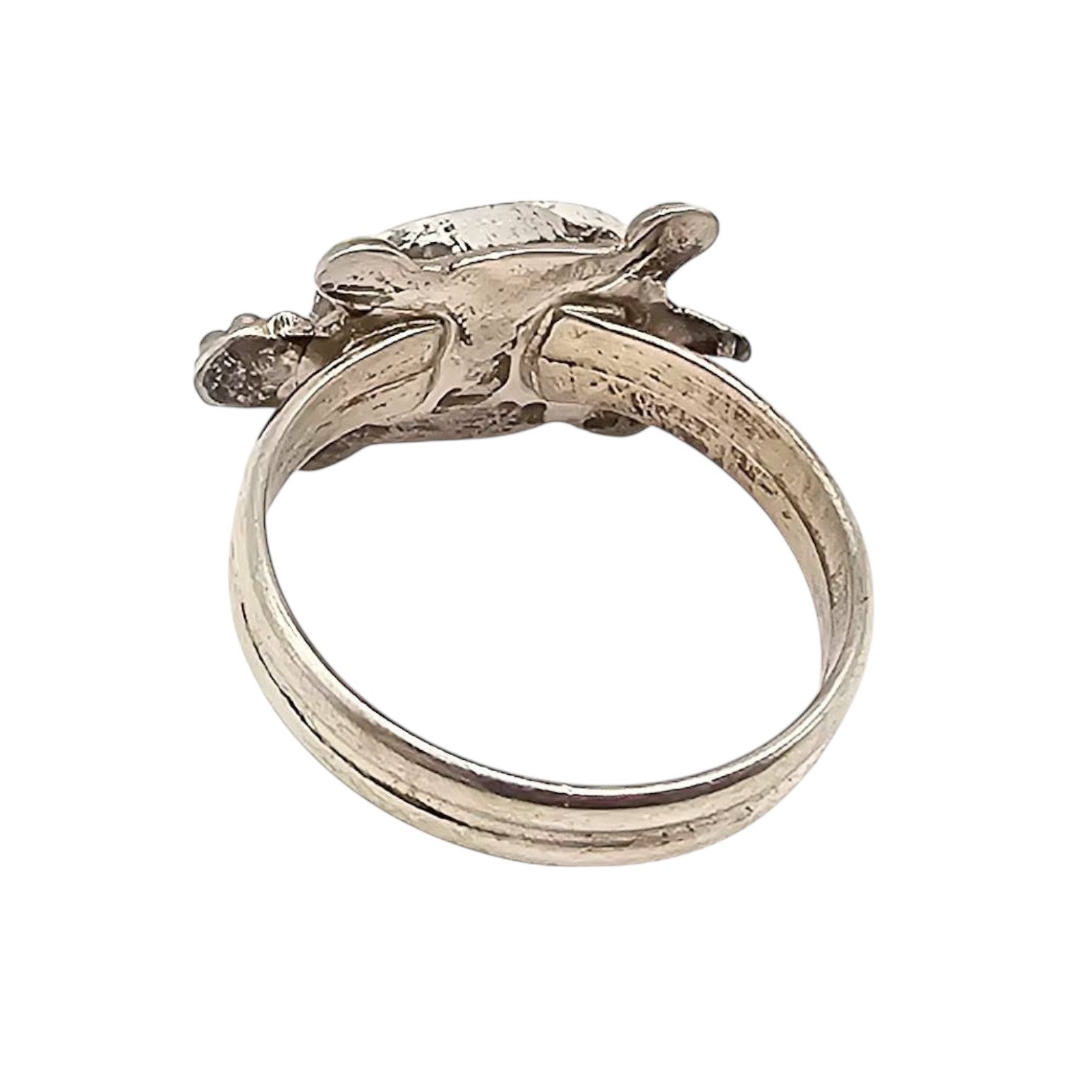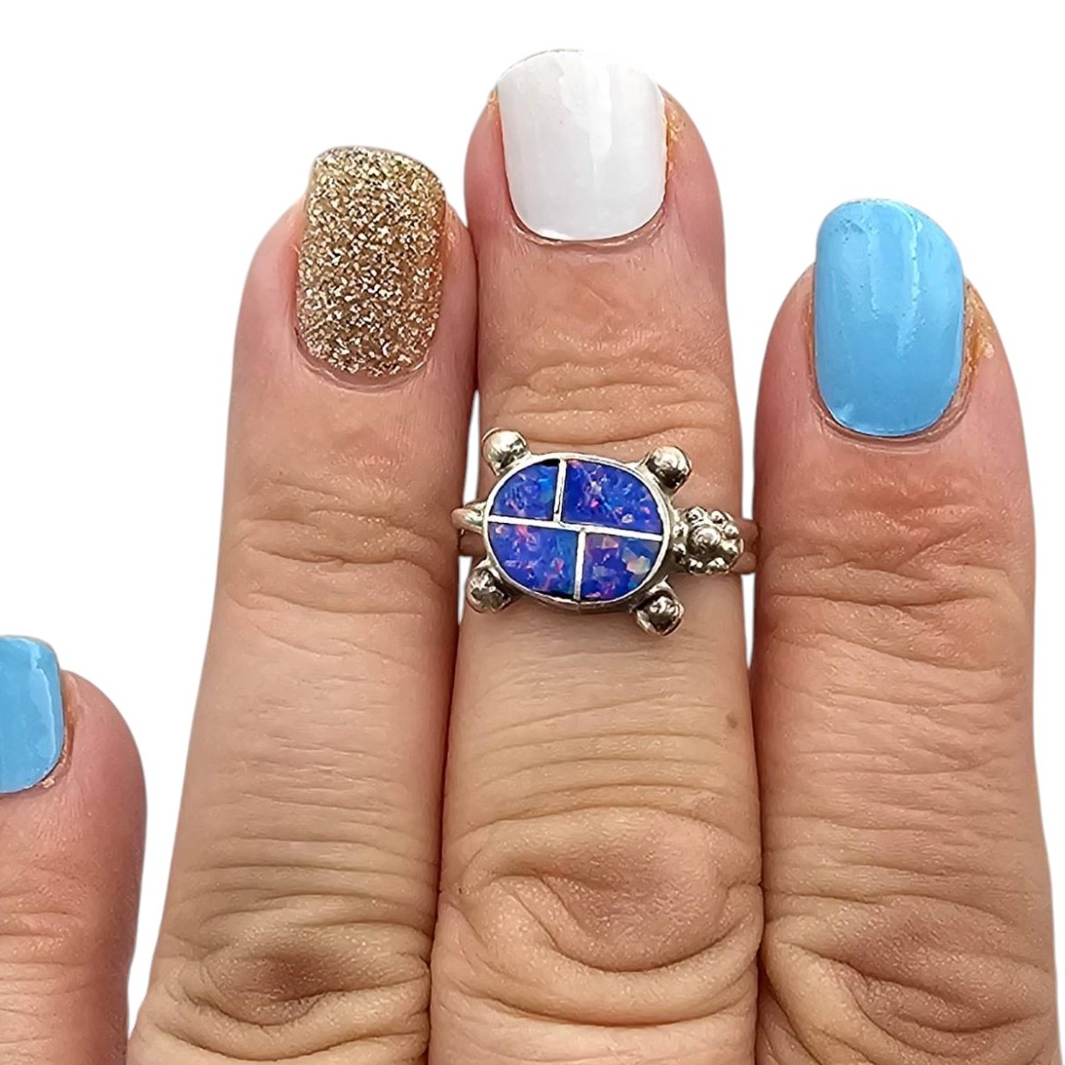 Sterling silver handmade turtle-shaped ring by Charlie Swain, a Zuni artisan, featuring an opal inlay of blue tones. The ring is sized as 6, weighs 2.7 grams, and exhibits fine craftsmanship. The attached tag lists the price at $85 and identifies the artist and material. The piece combines cultural artistry with unique design.
