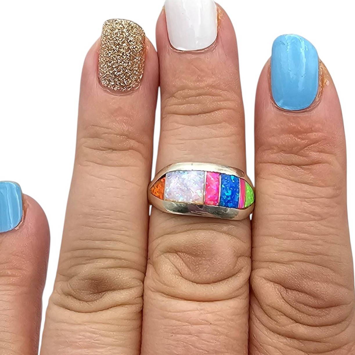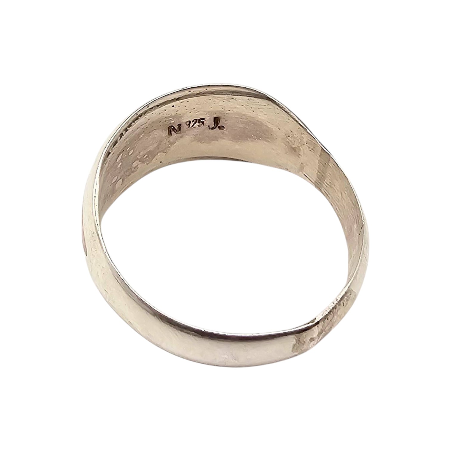 A Navajo handmade sterling silver ring by Norvin Johnson, featuring multi-colored inlaid stones. Sized at 8, stamped with ‘NJ’ the ring weighs approximately 2.5 grams. The inlay consists of colorful stones in pink, green, blue, purple, and orange hues. Overall, this piece reflects traditional Navajo craftsmanship.