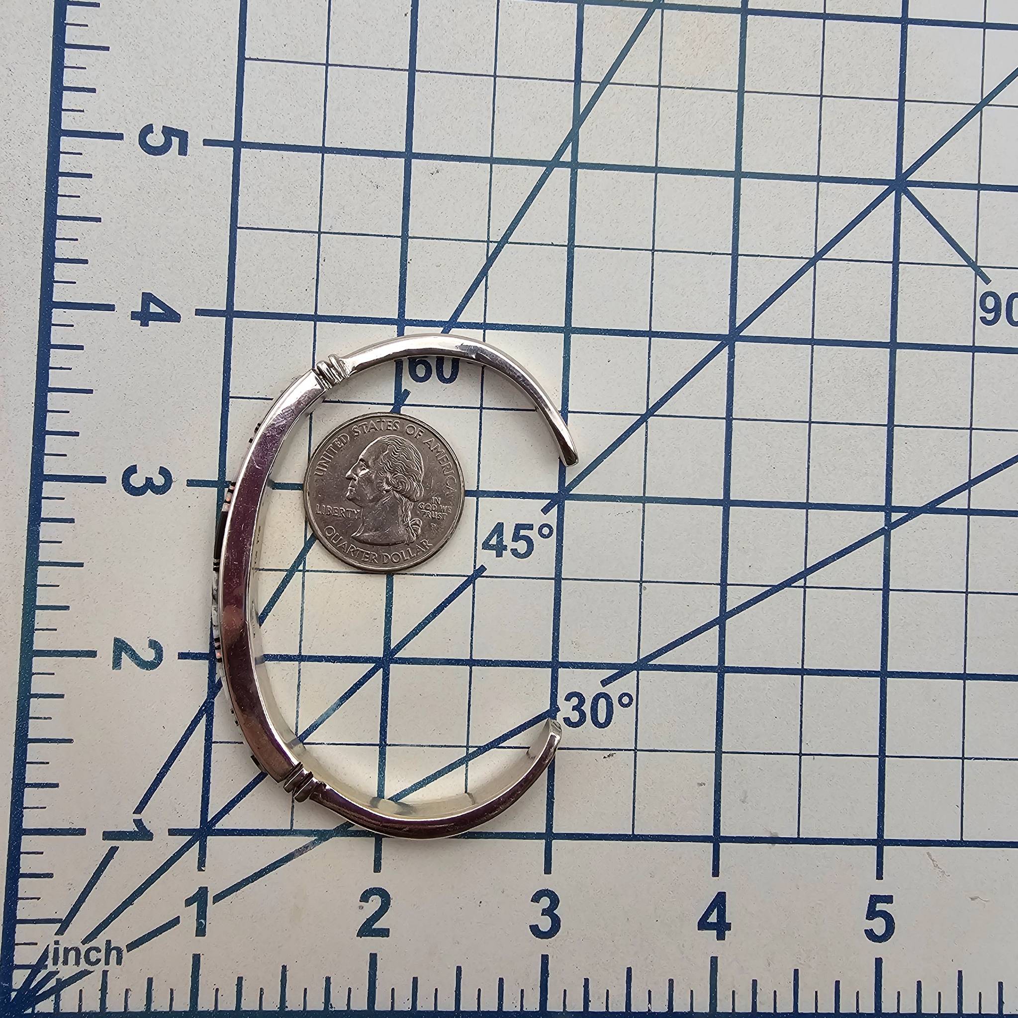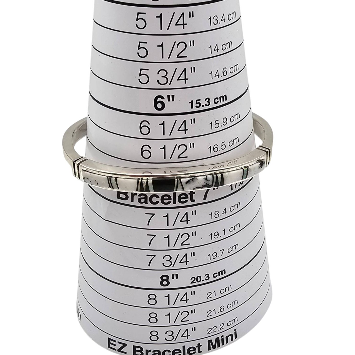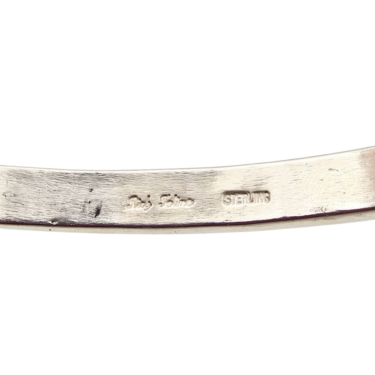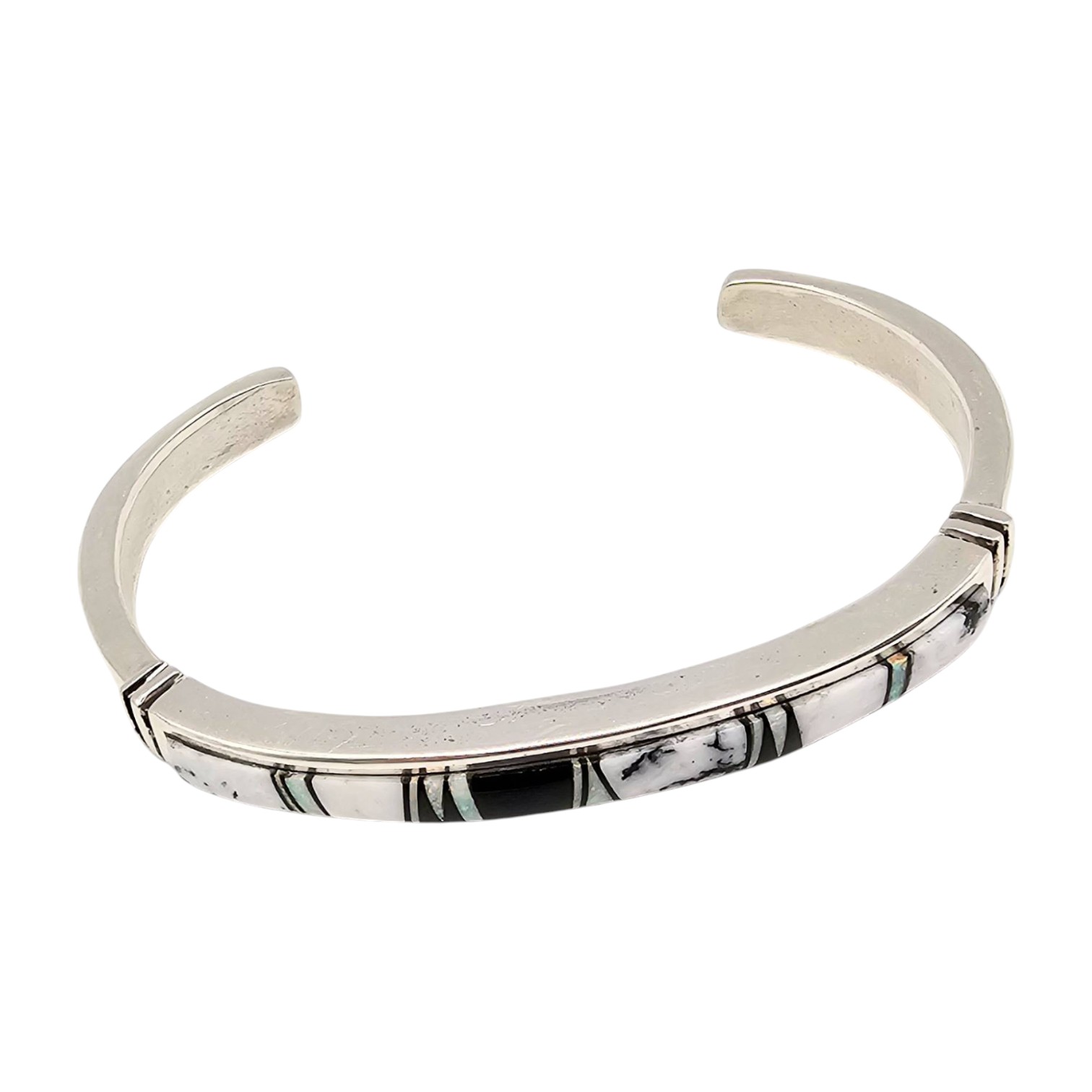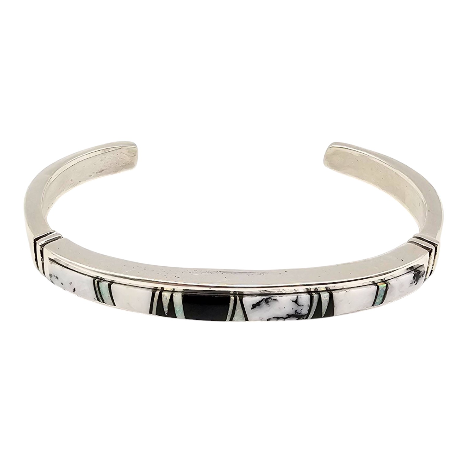 Handcrafted sterling silver cuff white buffalo turquoise and opal bracelet by Rick Tolino, a Navajo artisan. Features inlaid multi-stone details in a modern design. Stamped ‘Rick Tolino’ and ‘Sterling’. Weighs approximately 30.2 grams. Fits wrist sizes around 6 1/4 inches. Includes stones in neutral tones and turquoise accents.
