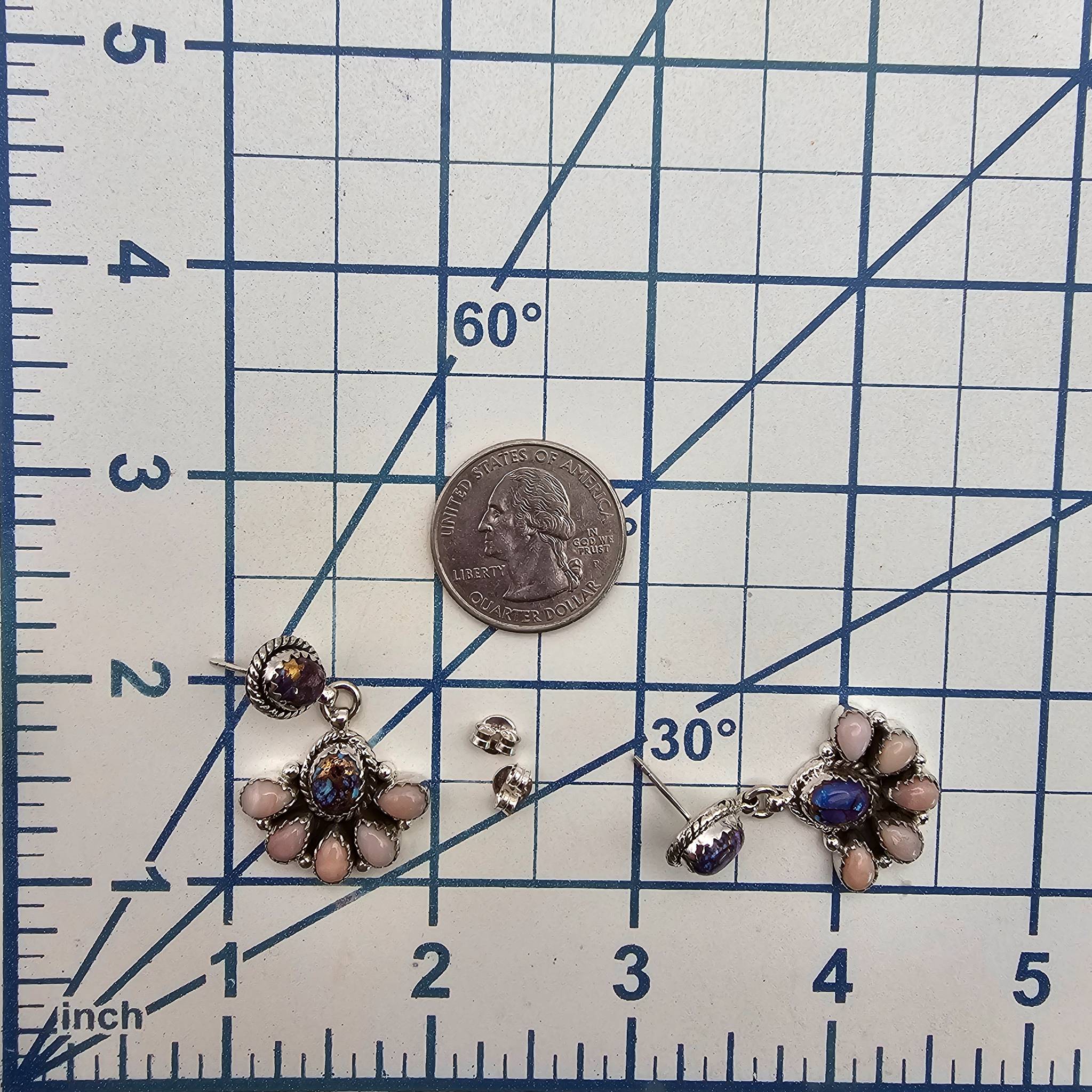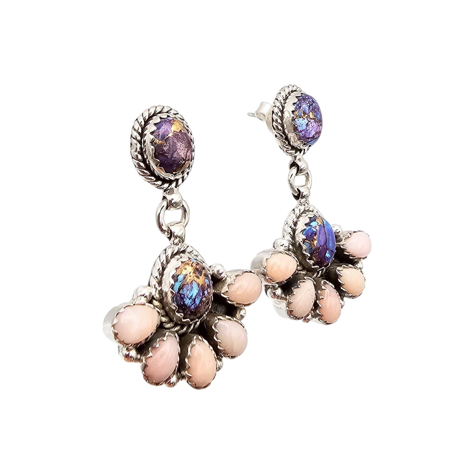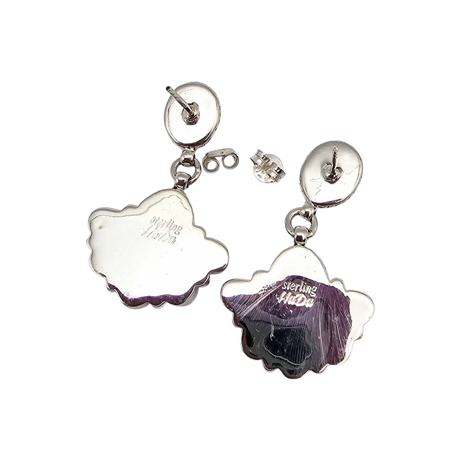 Sterling Silver earrings from the Hada Collection featuring pink and purple Mohave stones. The earrings display an intricate design with the central stones showcasing vibrant hues surrounded by pink accents. Total weight is 12.3 grams. Marked ‘Sterling Hada’ on the reverse. Includes secure post backings.