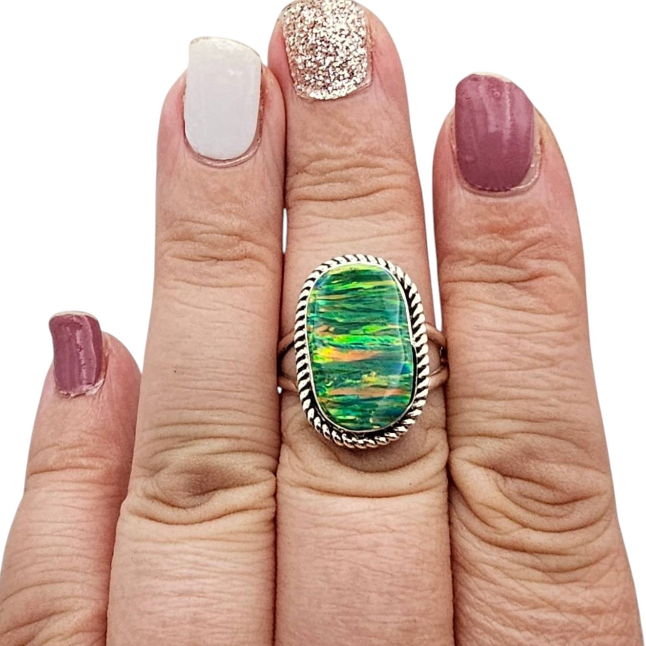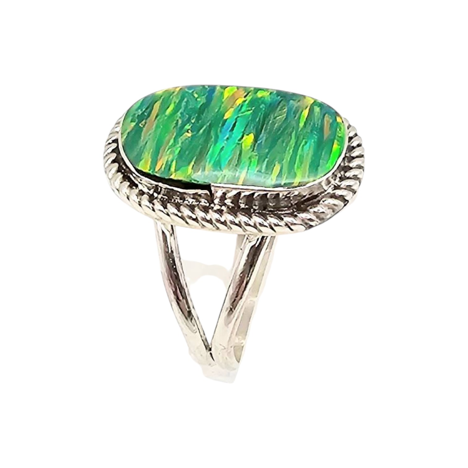 Sterling silver ring featuring an oval opal stone with vibrant green and iridescent hues. The ring is size 8.5, handcrafted by Victor Thompson, a Navajo artisan. Weighs approximately 4.3 grams. The band has a traditional design with a twisted rope-style bezel surrounding the opal. Handmade craftsmanship and Native American artistry.