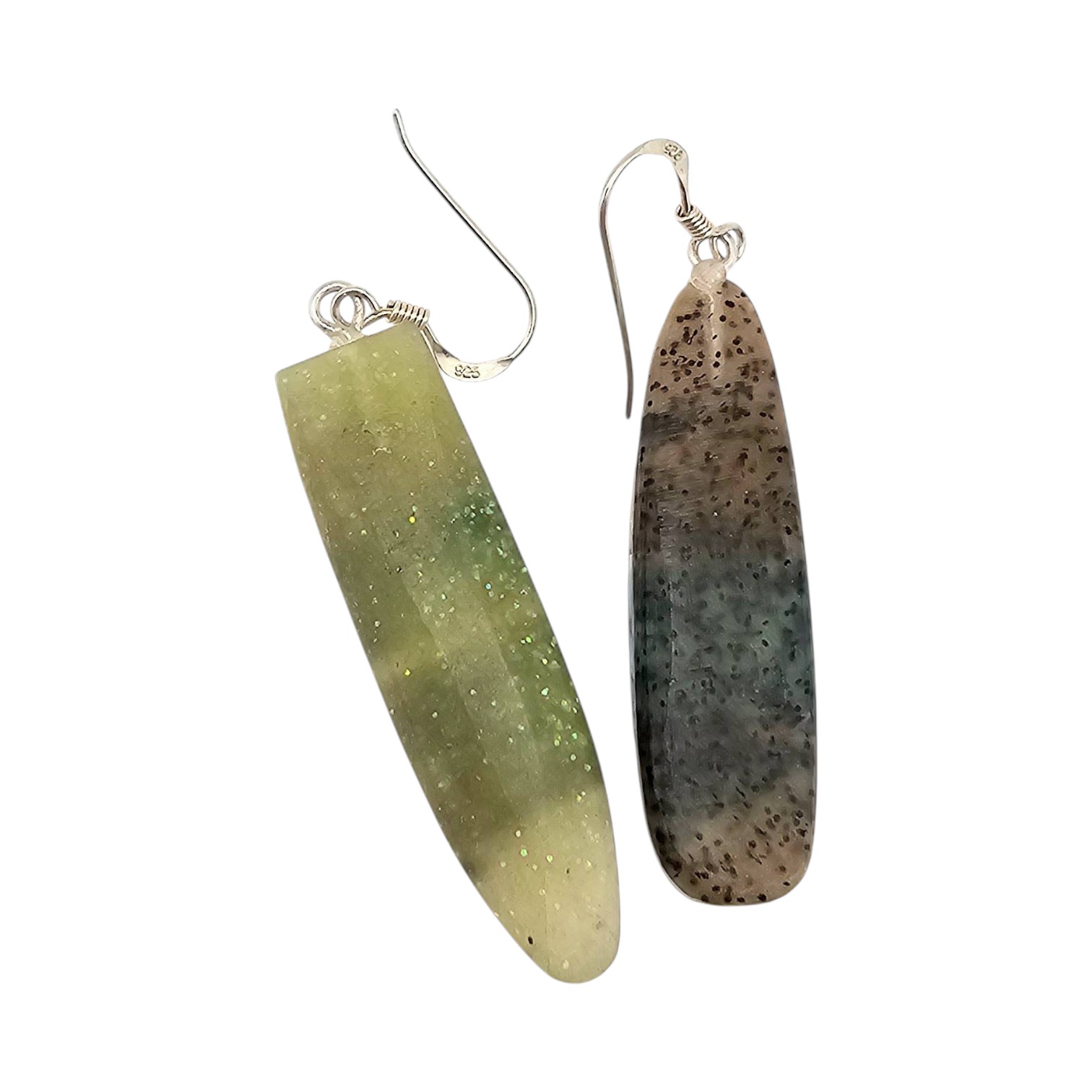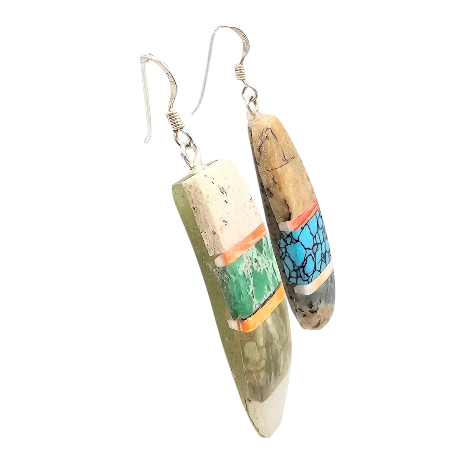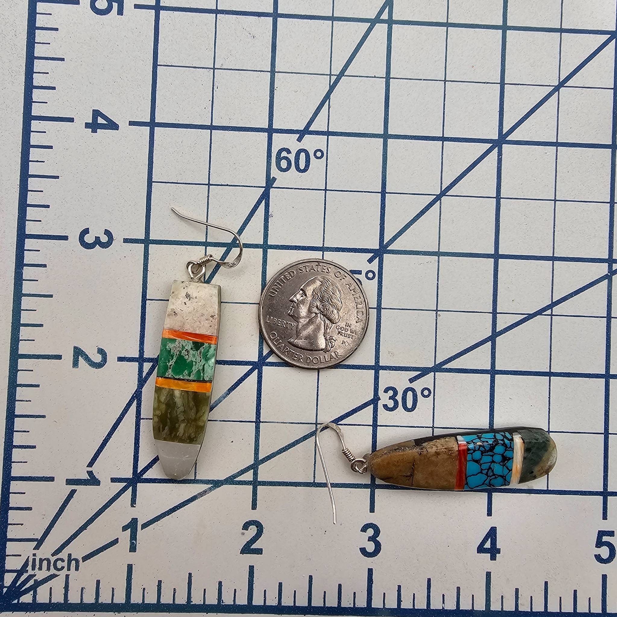 Multicolor handmade earrings by Navajo artisan Allison White. Features inlaid stones including turquoise and other materials, showcasing a vibrant and earthy design. Set on silver earring hooks. Total weight is 9 grams. Measurements on the scale indicate approximate size relative to a coin grid in the images.