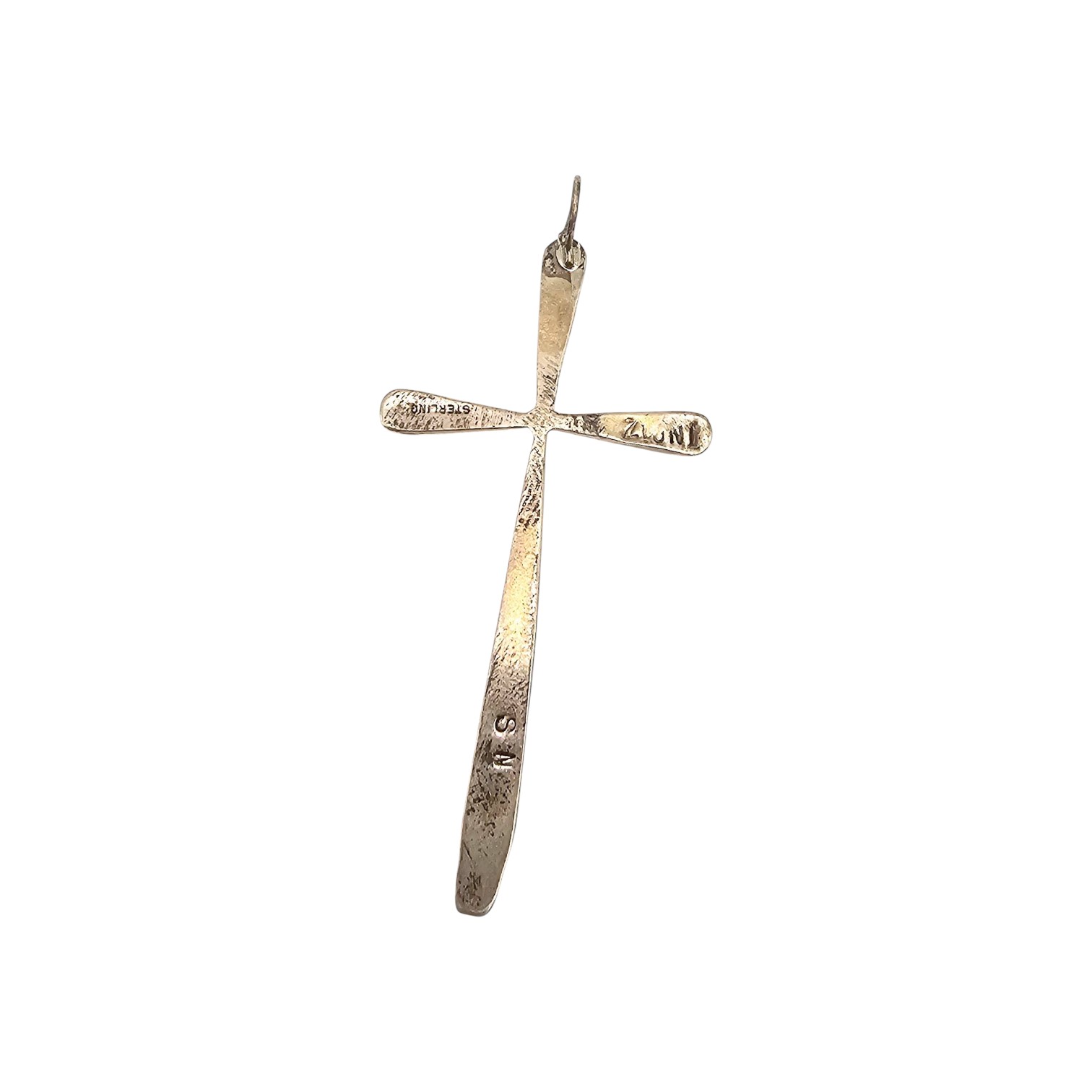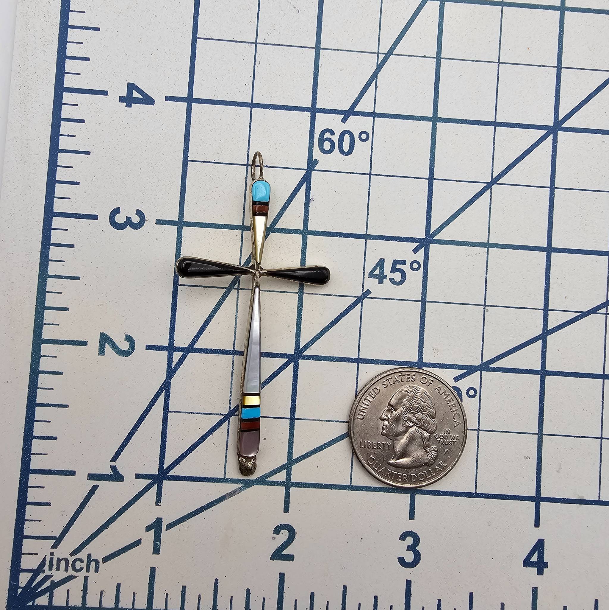 Sylvester Noeche Zuni handmade sterling silver cross pendant featuring inlaid multicolor stones, including turquoise, mother-of-pearl, onyx, and other materials. The pendant weighs approximately 2.7 grams and measures about 2.5 inches in height. The back is stamped with ‘S/S’ and ‘ZUNI’.