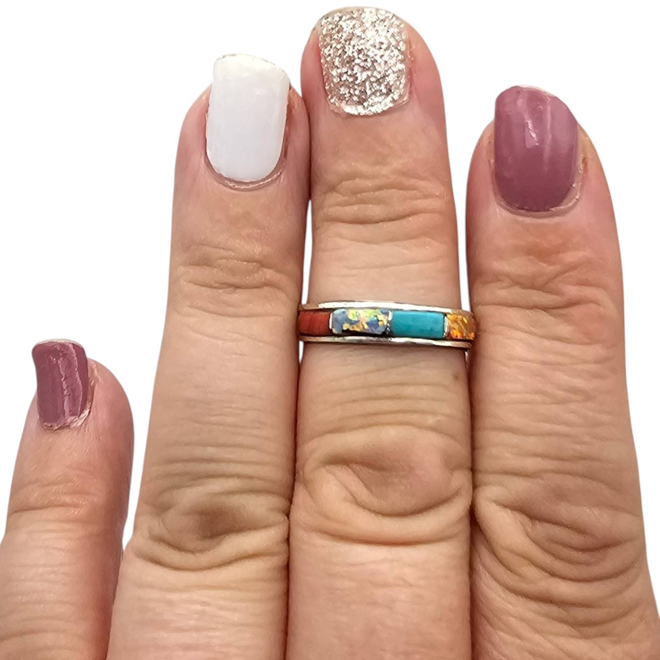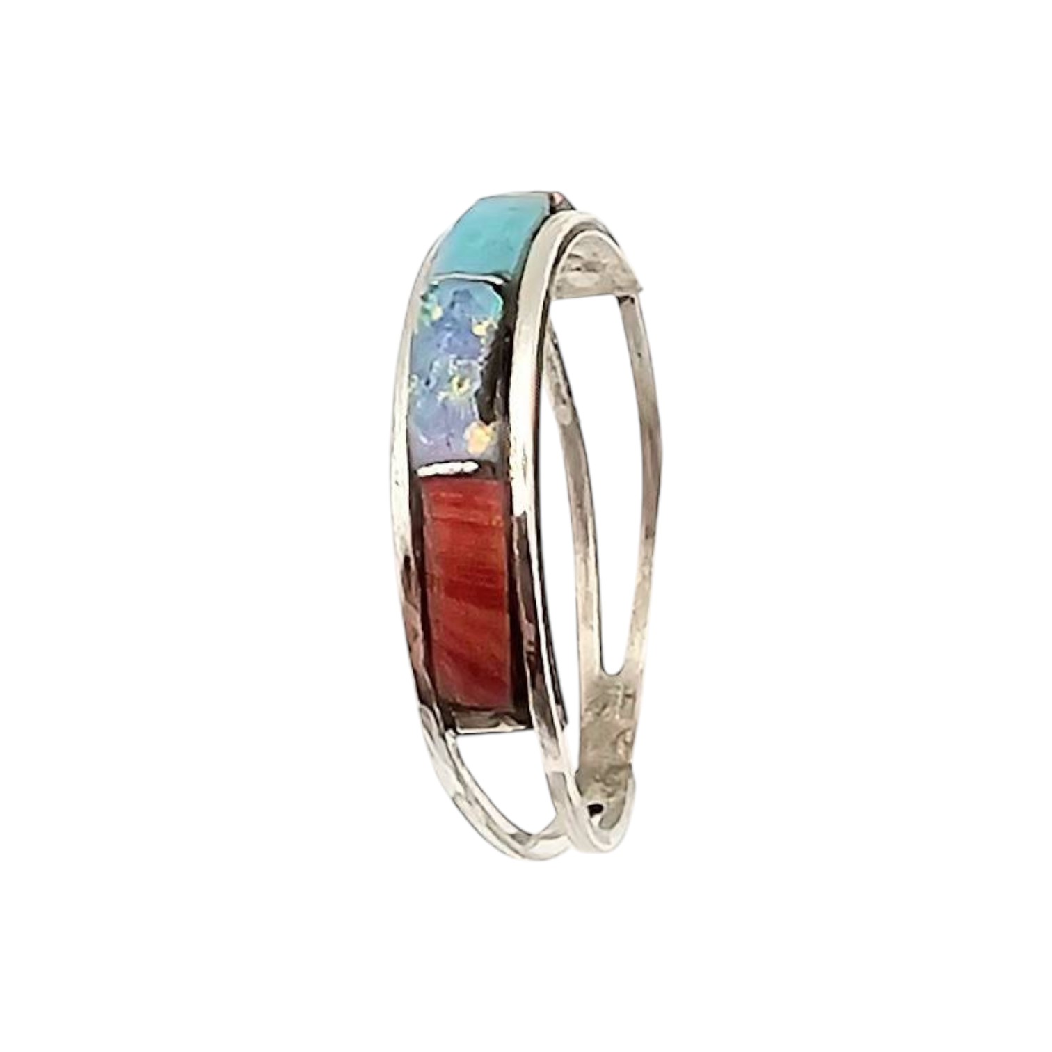 Handmade Navajo sterling silver ring by Debbie Livingston featuring a multi-stone inlay design with stones including turquoise, red coral, and opal. The ring is marked as size 7.5 and weighs 1.1 grams. It is an excellent example of Native American craftsmanship. Original tag denotes an $85 retail price.