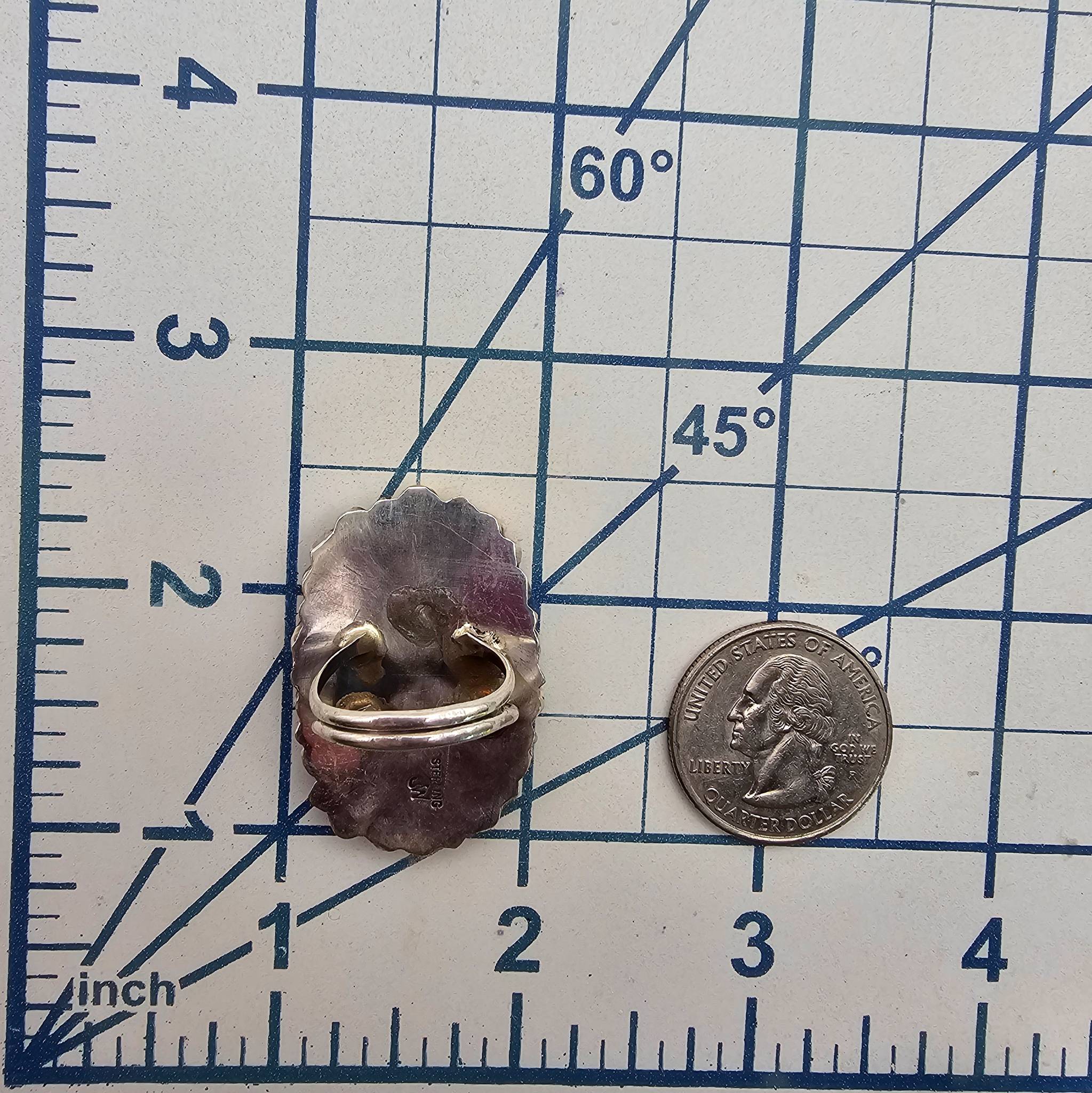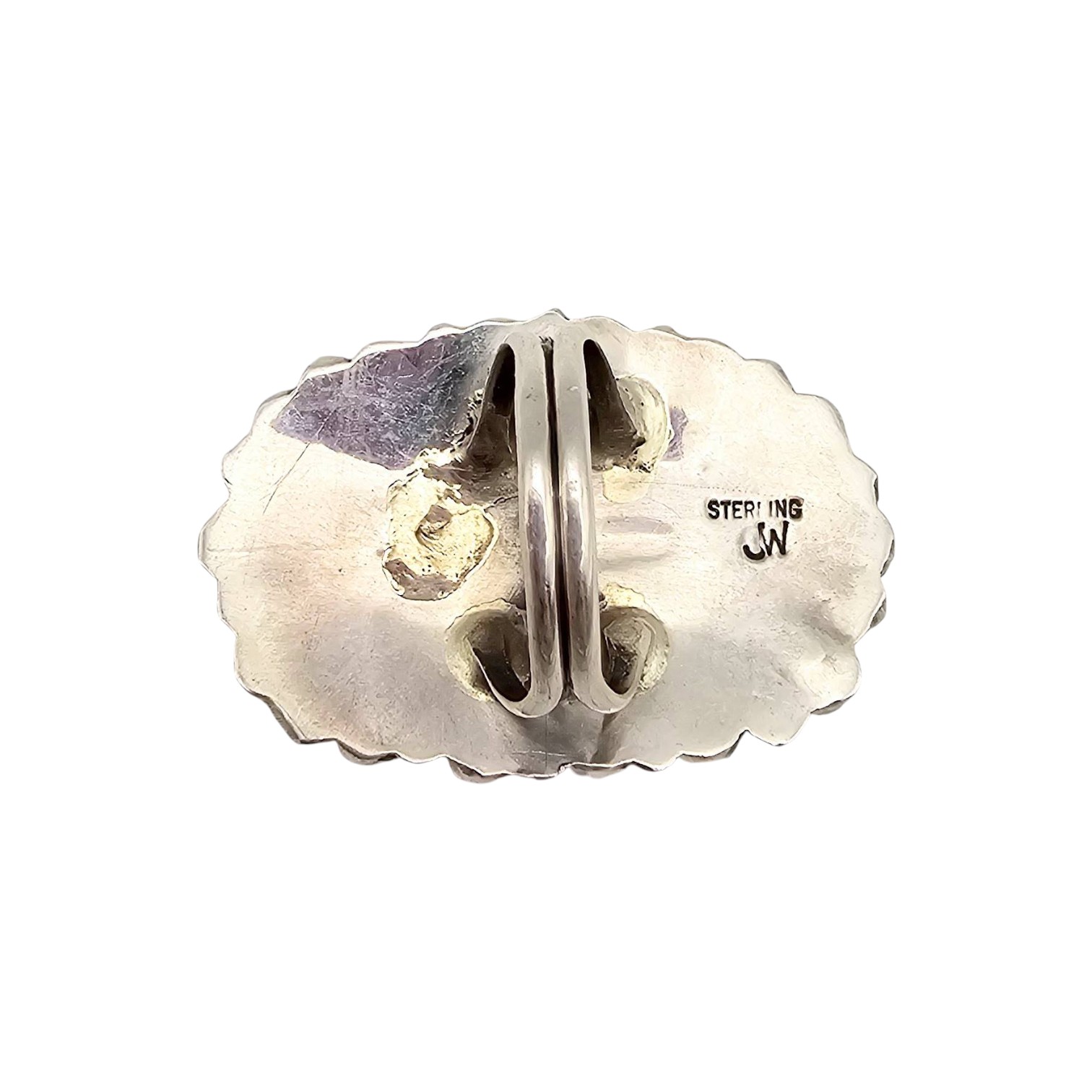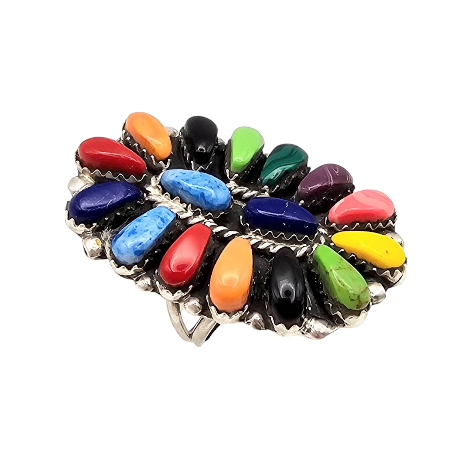 Sterling silver Navajo handmade ring by Juliana William, featuring a multi-stone design with vibrant colors. This oval-shaped ring showcases intricate craftsmanship with a detailed setting for each colored stone. Stamped ‘STERLING’ and ‘JW’ on the back. Ring size is 6.5, and it weighs approximately 8.2 grams. Perfect for collectors of Native American jewelry.
