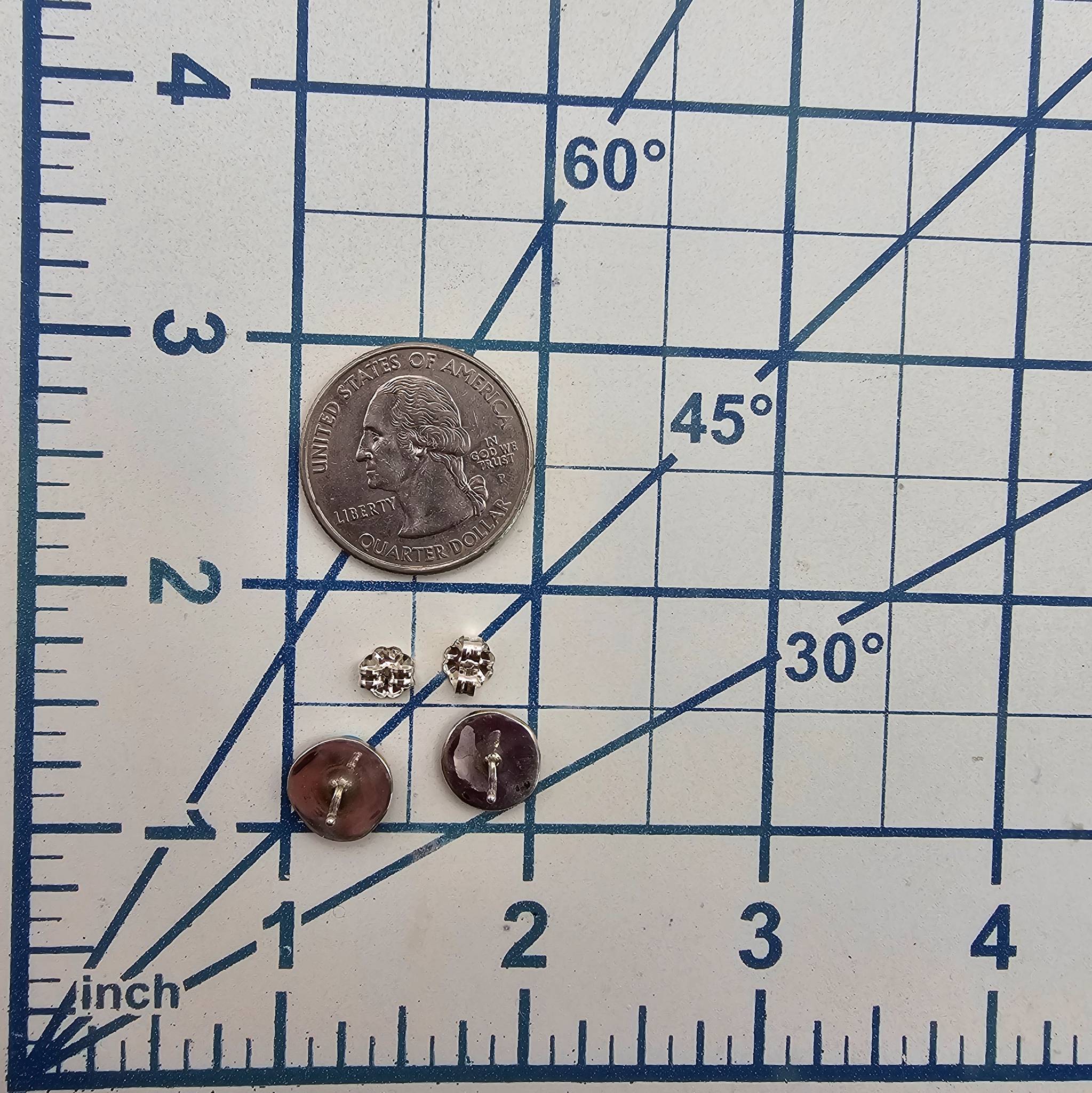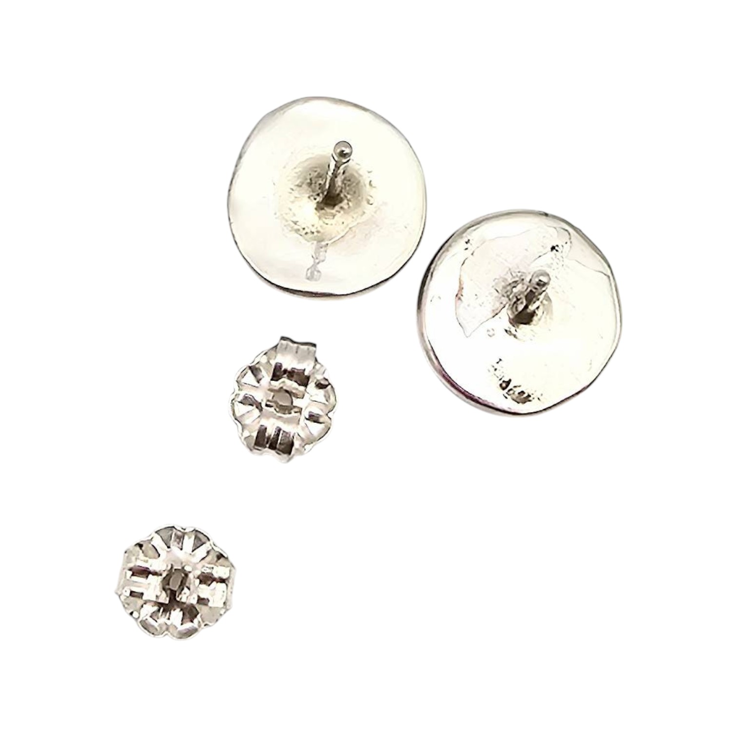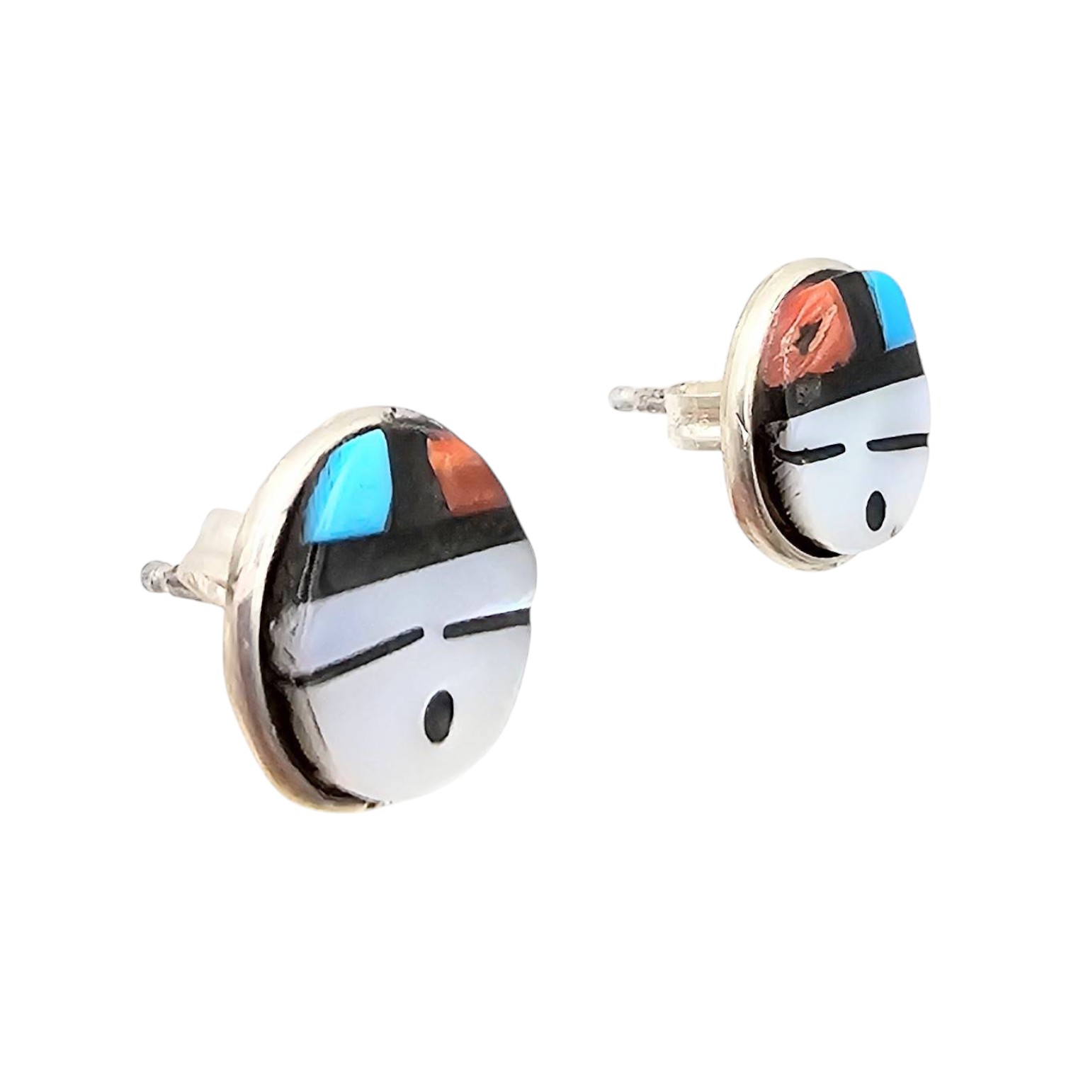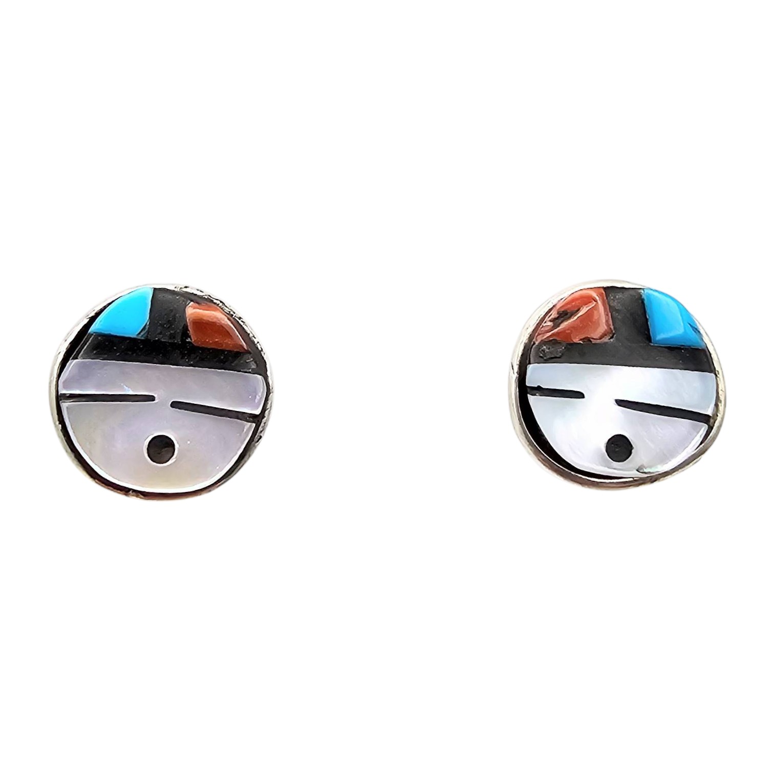 Handmade Zuni stud earrings by Janice Spencer featuring multiple inlaid stones, including turquoise, coral, and mother of pearl. Crafted in sterling silver (SS) with a smooth back and sterling silver butterfly backs. Weighs 1.5 grams. These circular earrings showcase traditional Zuni craftsmanship with precise inlay work.