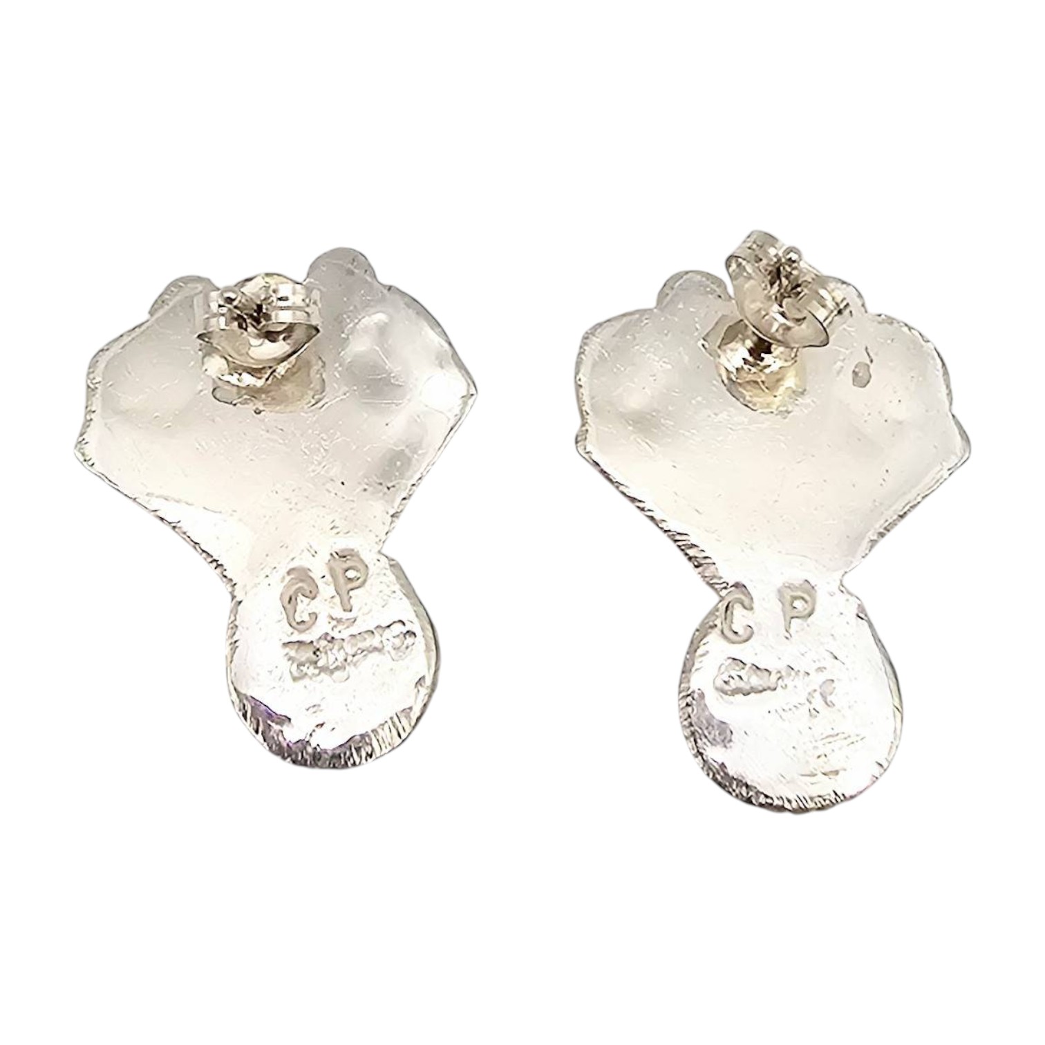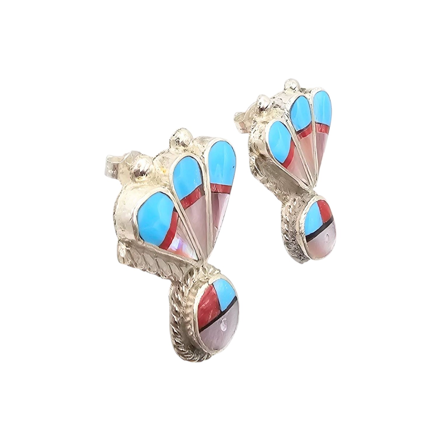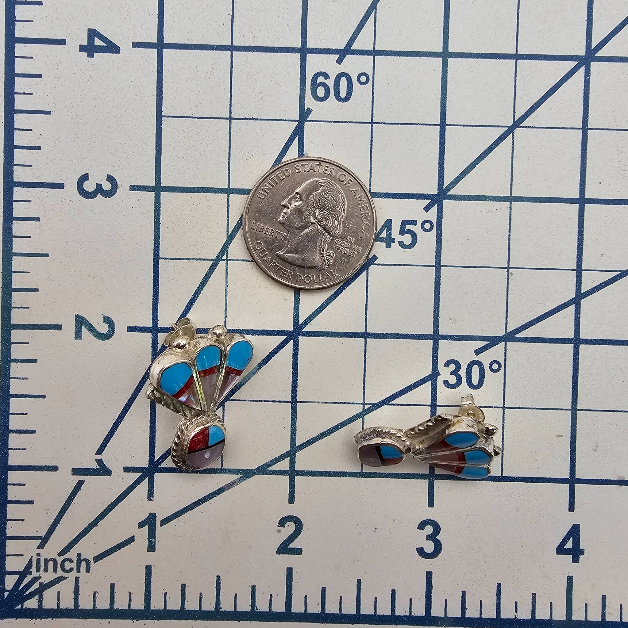 Handmade sterling silver earrings by Zuni artisan Clarence Pedro featuring a Sunface design. The earrings showcase vibrant inlays of turquoise, coral, and mother of pearl. Each earring is marked ‘CP’ on the back. Total weight of the pair is 7.1 grams. Dimensions in reference to image include approximately 1 inch in width and height.