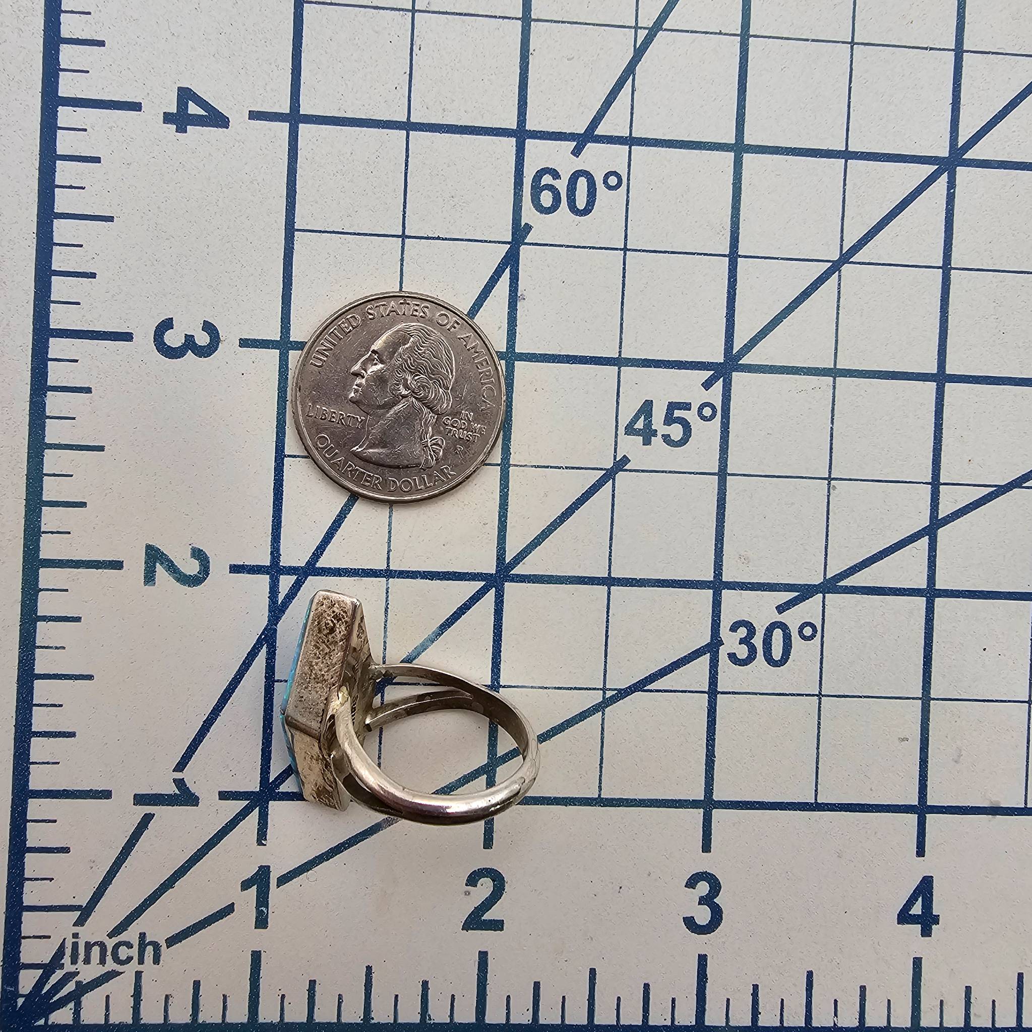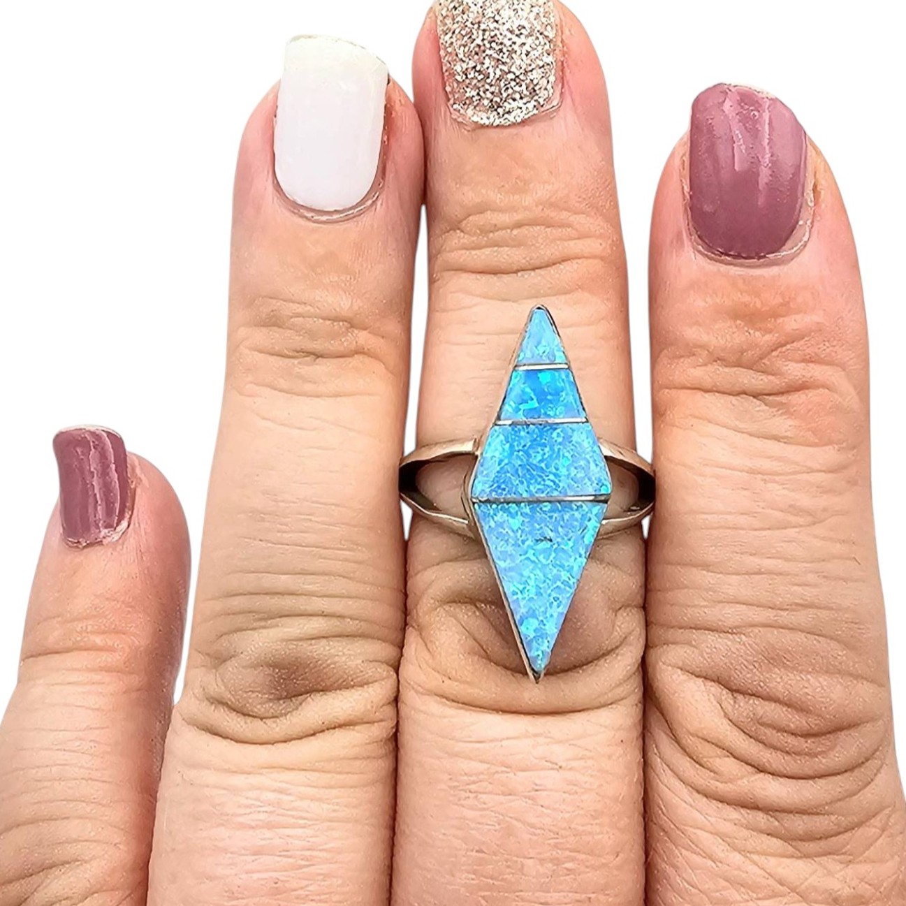 A handmade Navajo sterling silver ring crafted by Avery Norton featuring a triangular opal inlay with geometric cuts for a unique design. Size 7.5, with a weight of 4.4 grams. The intricate craftsmanship highlights the rich tradition of Navajo jewelry. The label notes an original price of $125.