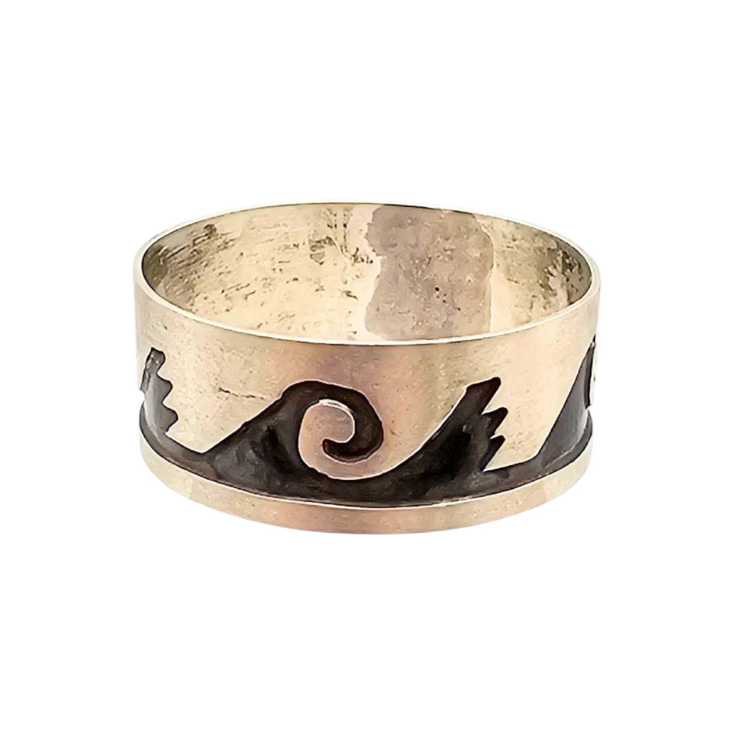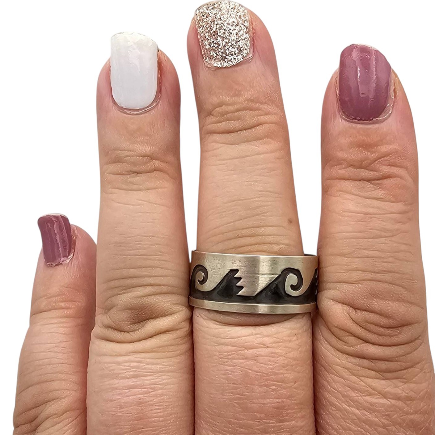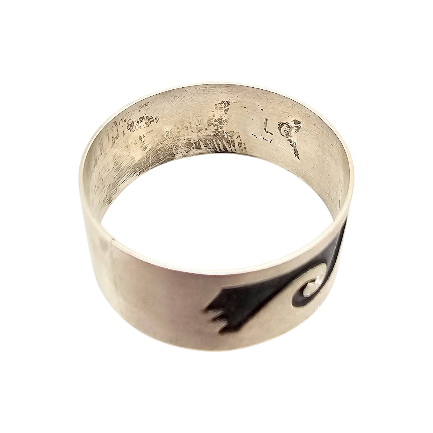 Sterling silver overlay ring handcrafted by Navajo artisan Stanley Gene. Features a black overlay design with geometric and wave-like motifs. Marked as size 12 and weighs 2.5 grams. Made of sterling silver, as indicated on the label.