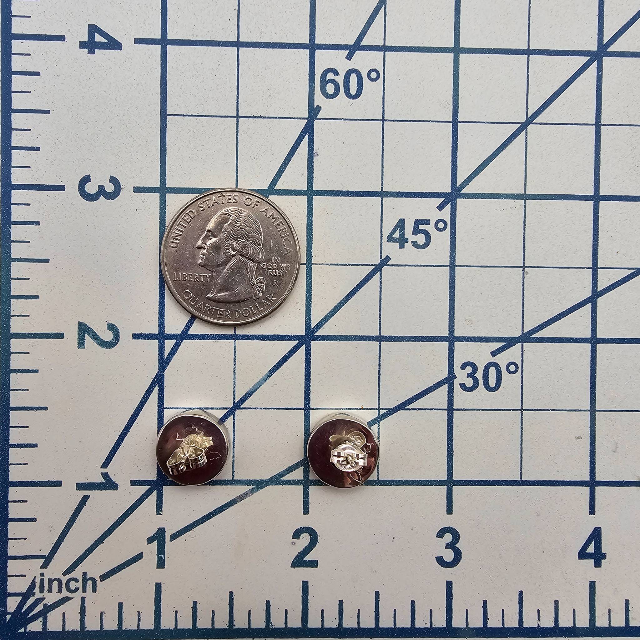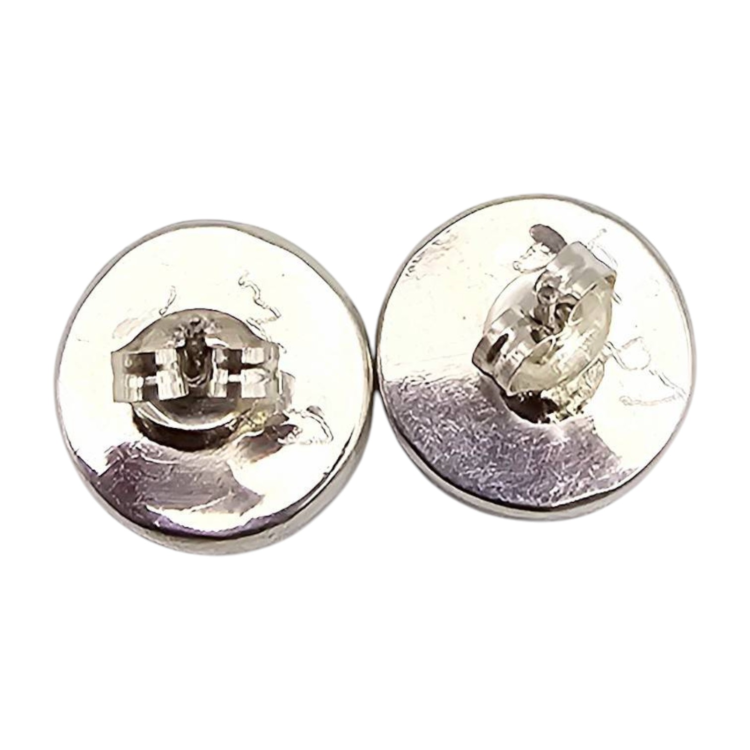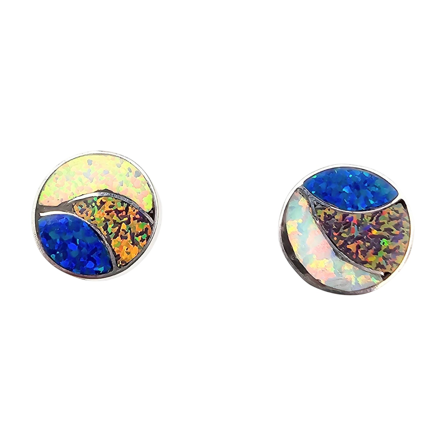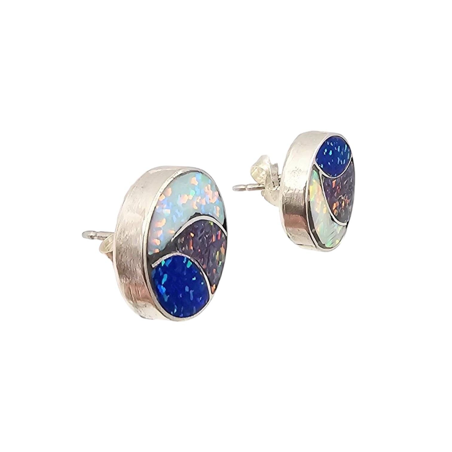 Carmichel Halo earrings, handcrafted by Zuni artisans, feature inlaid opal in a sterling silver setting. These stud earrings exhibit vibrant opal accents set in a circular design. Weighing approximately 2.6 grams, this pair includes secure push-back closures. Diameter of each earring measures just under 1 inch.