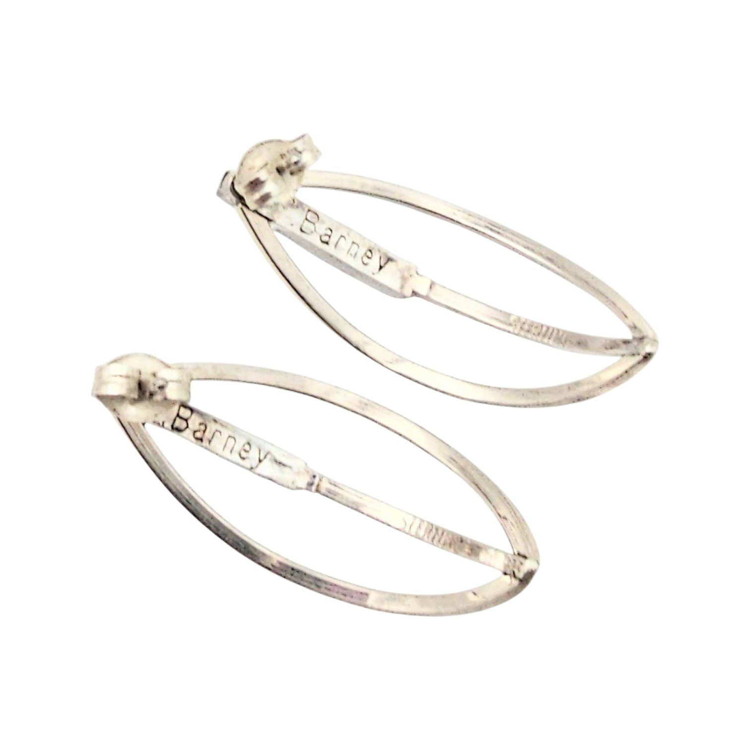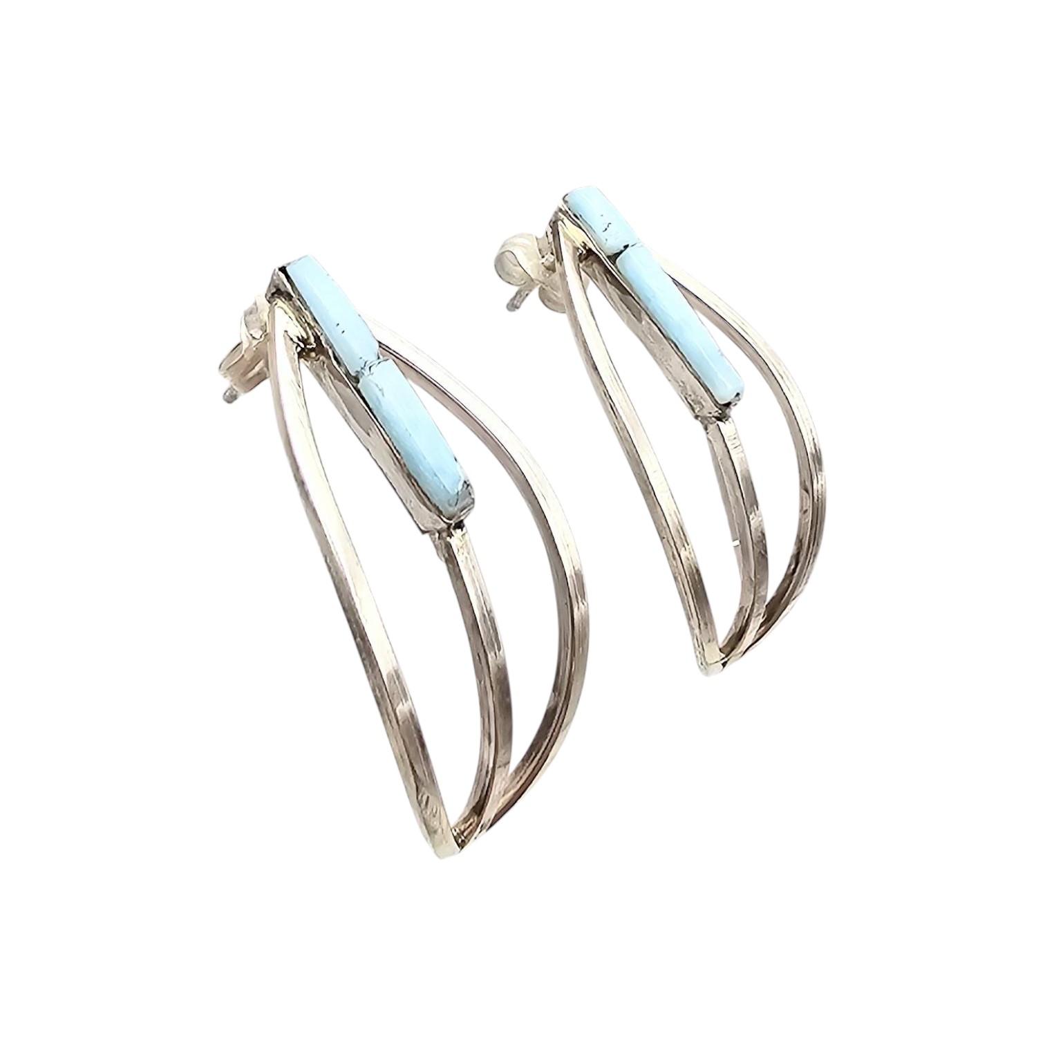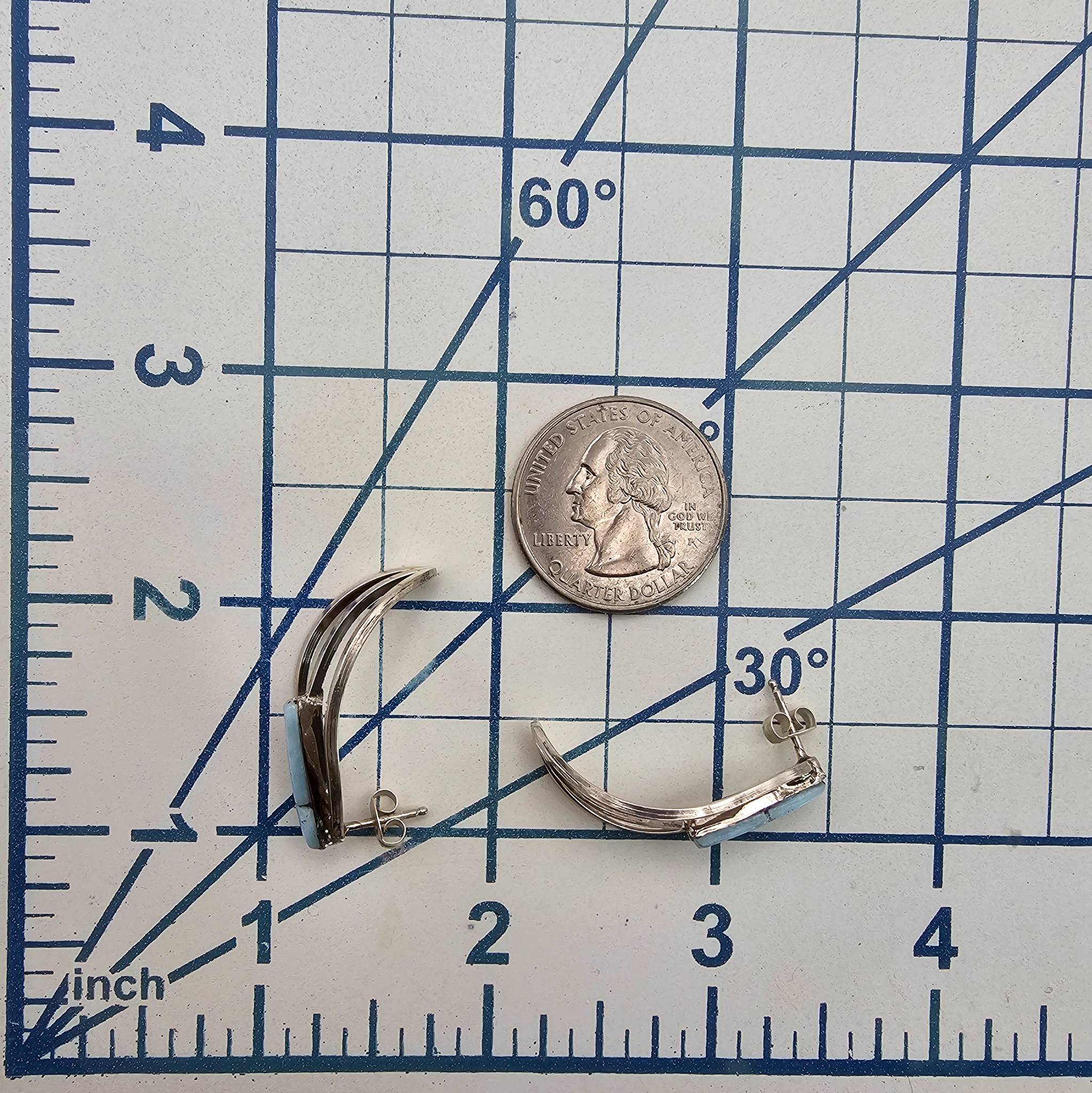 Sterling silver earrings handmade by Navajo artisan Fred Barney. These earrings feature a unique hoop design with polished larimar stones. Each earring measures approximately 1.5 inches in length and weighs a total of 4.5 grams together. Marked ‘Barney’ on the back, showcasing the artist’s signature.