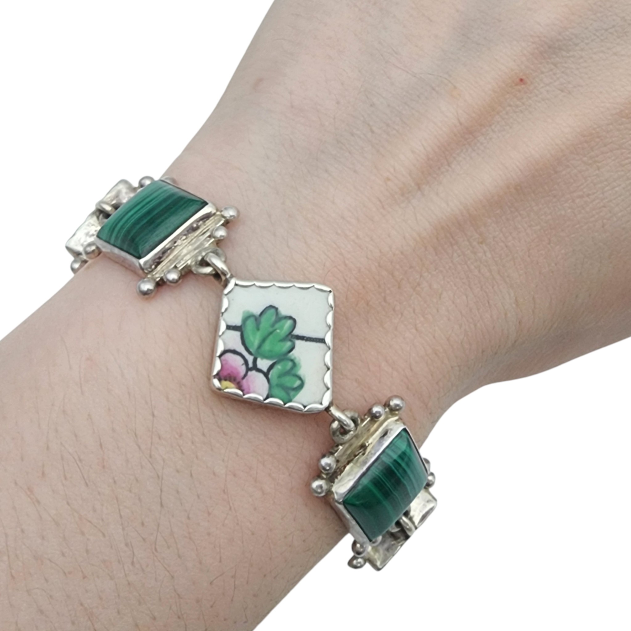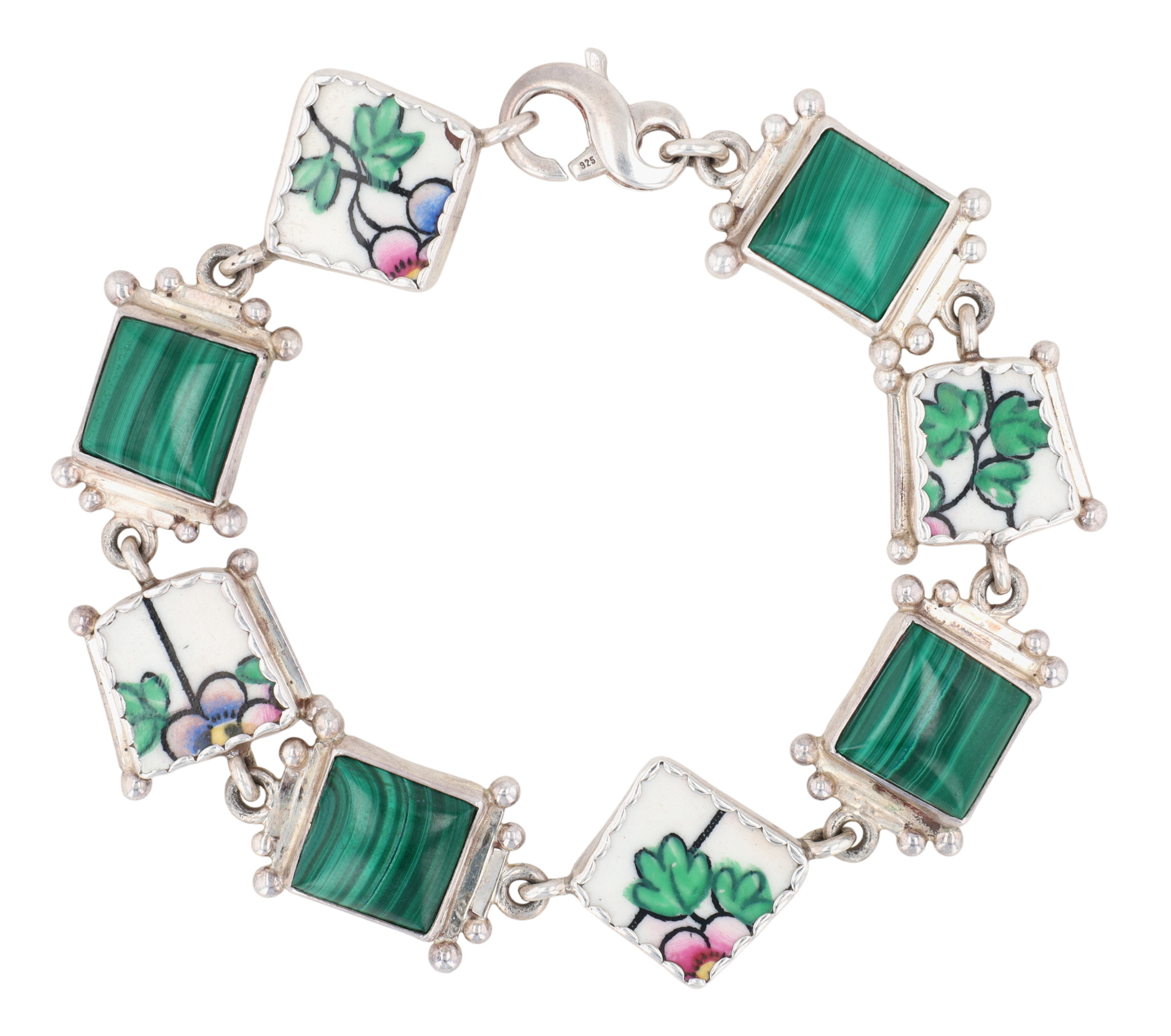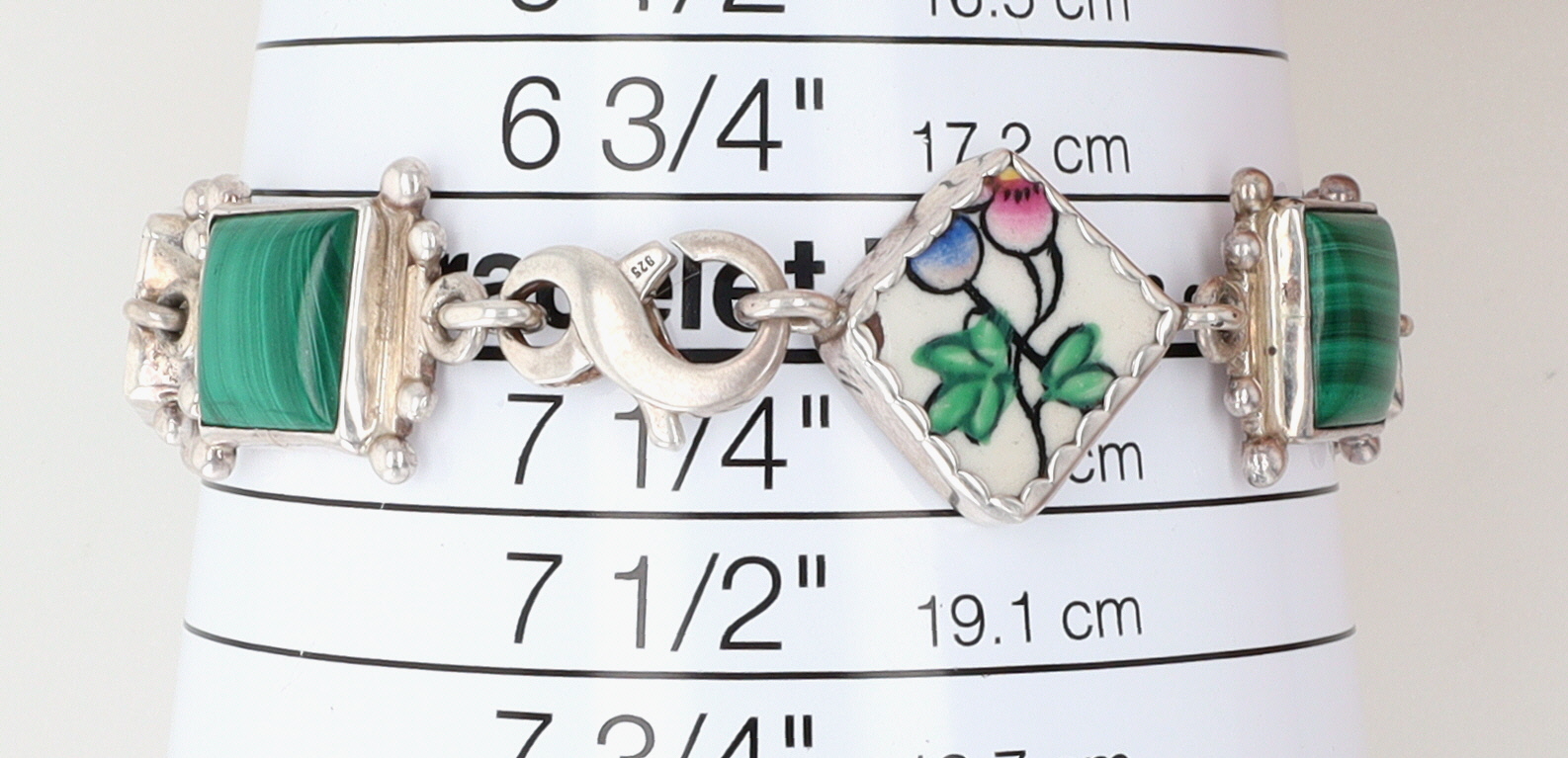 Lindsay Livingston Sterling Ceramic Shard & Malachite Bracelet | 27.3g | Length approx. 7.75″ | “Lindsay is an artisan silversmith from Cottonwood, AZ. Her colorful bracelets and earrings are all sterling silver fabricated jewelry with antique ceramic shards set in bezel cups.”
