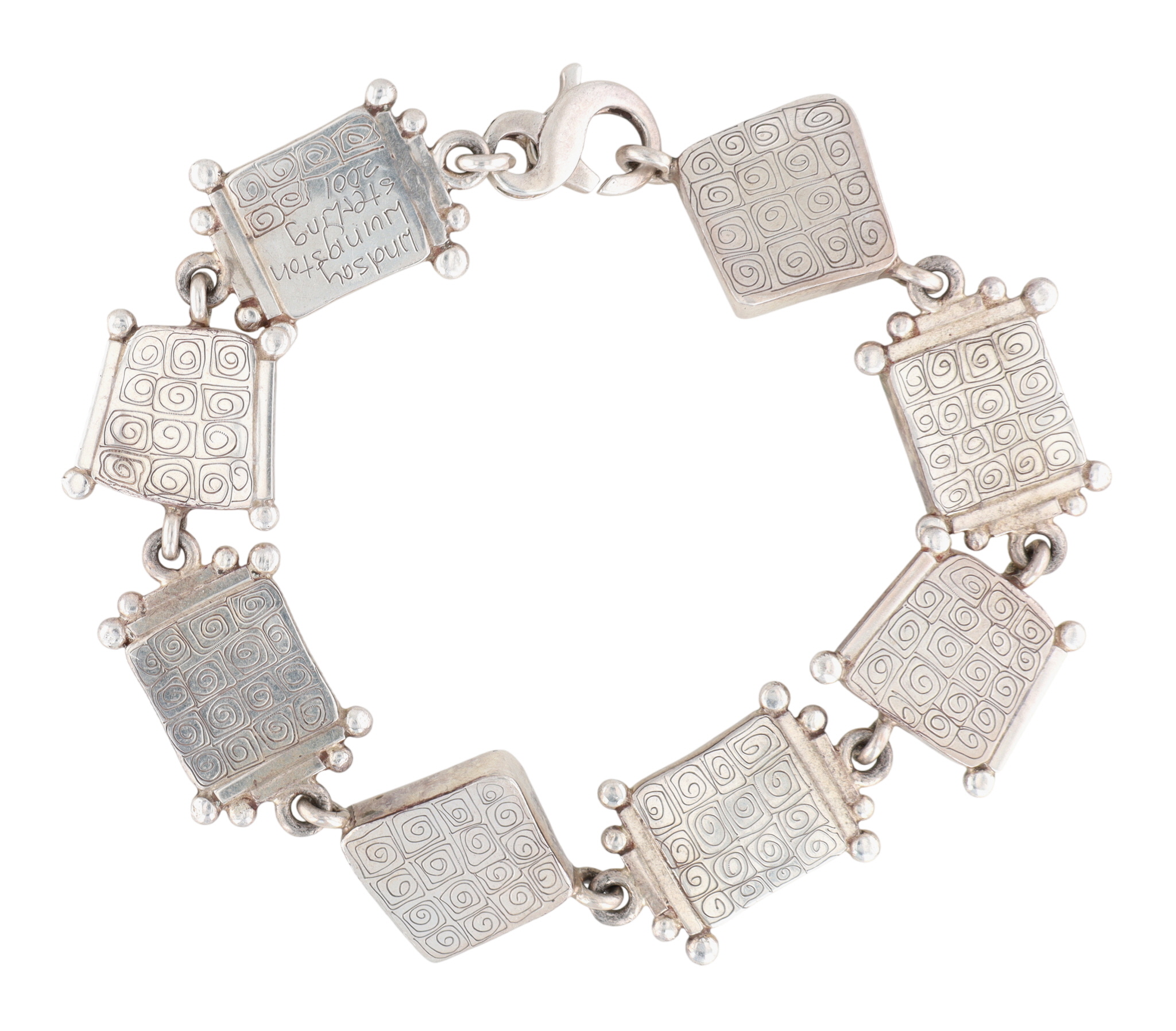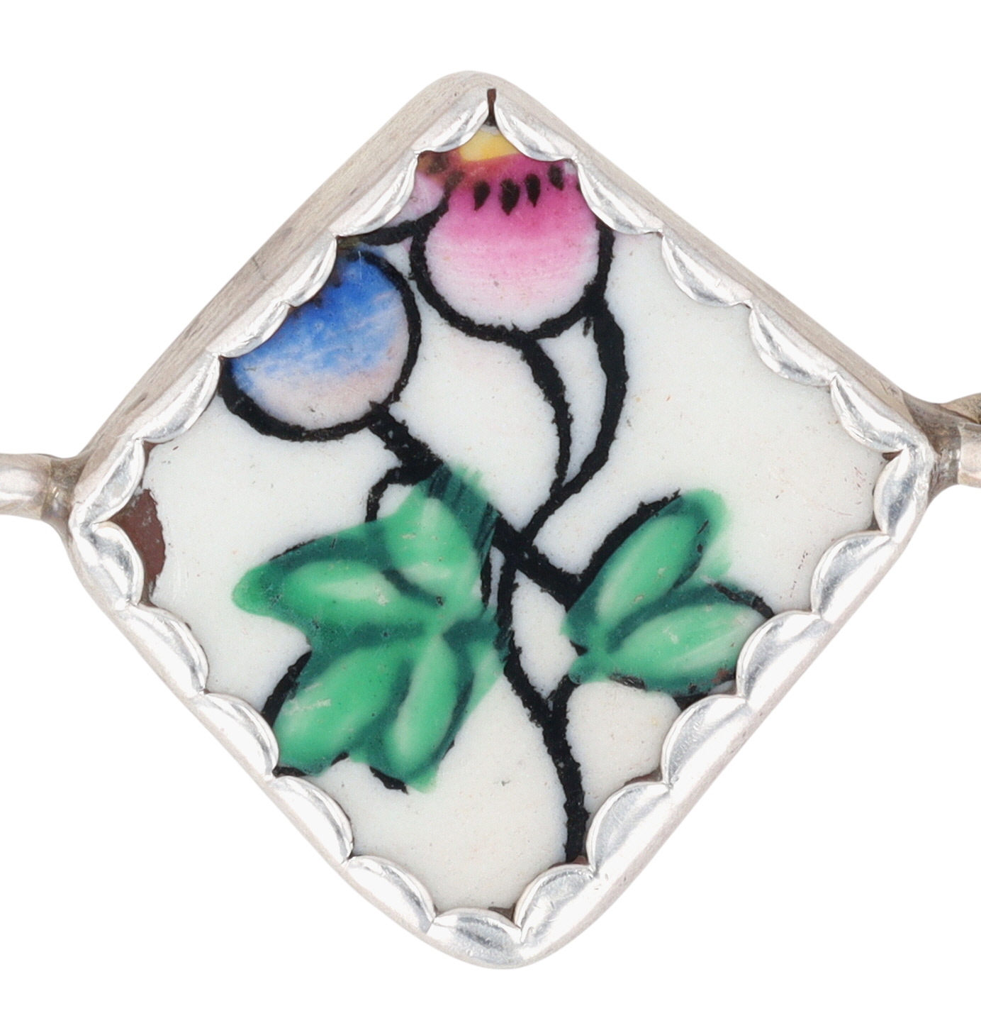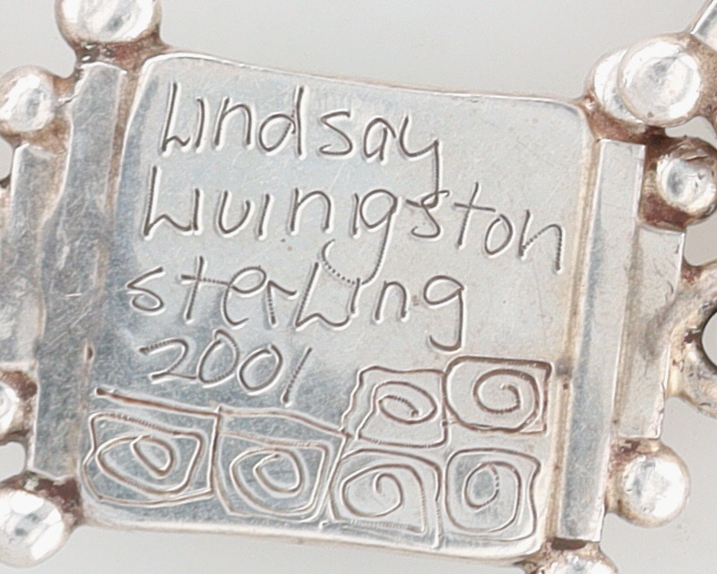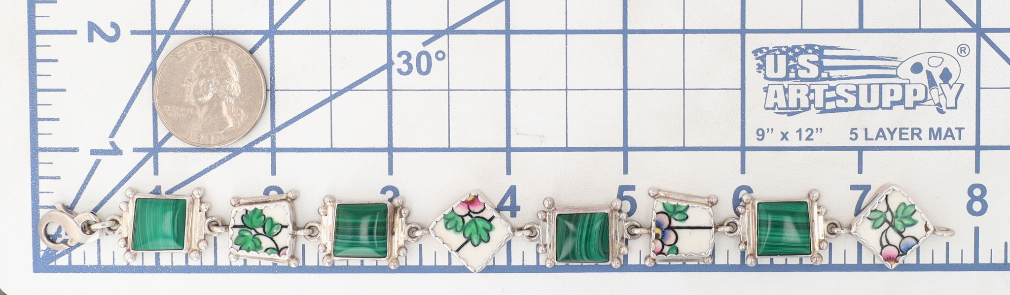 Lindsay Livingston Sterling Ceramic Shard & Malachite Bracelet | 27.3g | Length approx. 7.75″ | “Lindsay is an artisan silversmith from Cottonwood, AZ. Her colorful bracelets and earrings are all sterling silver fabricated jewelry with antique ceramic shards set in bezel cups.”