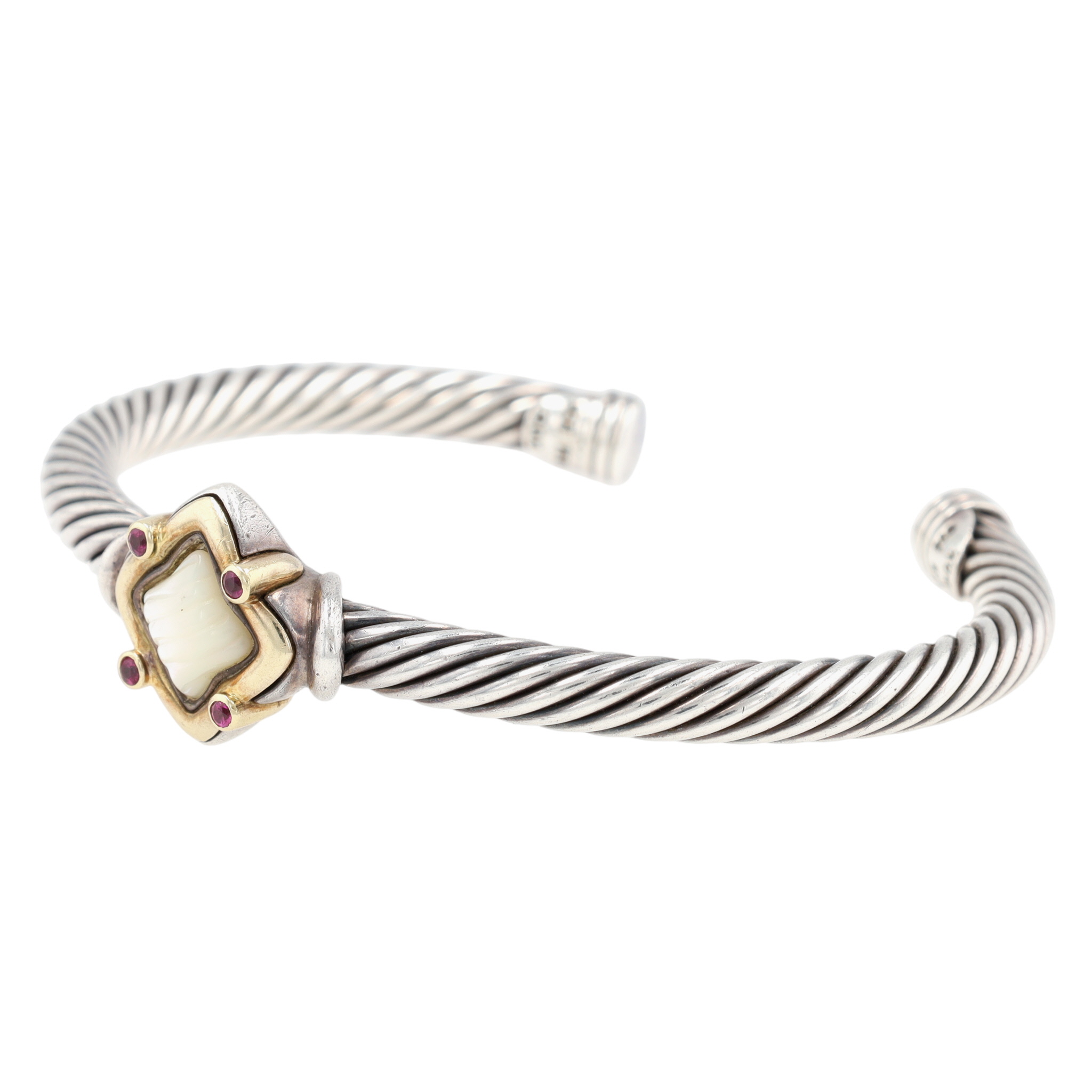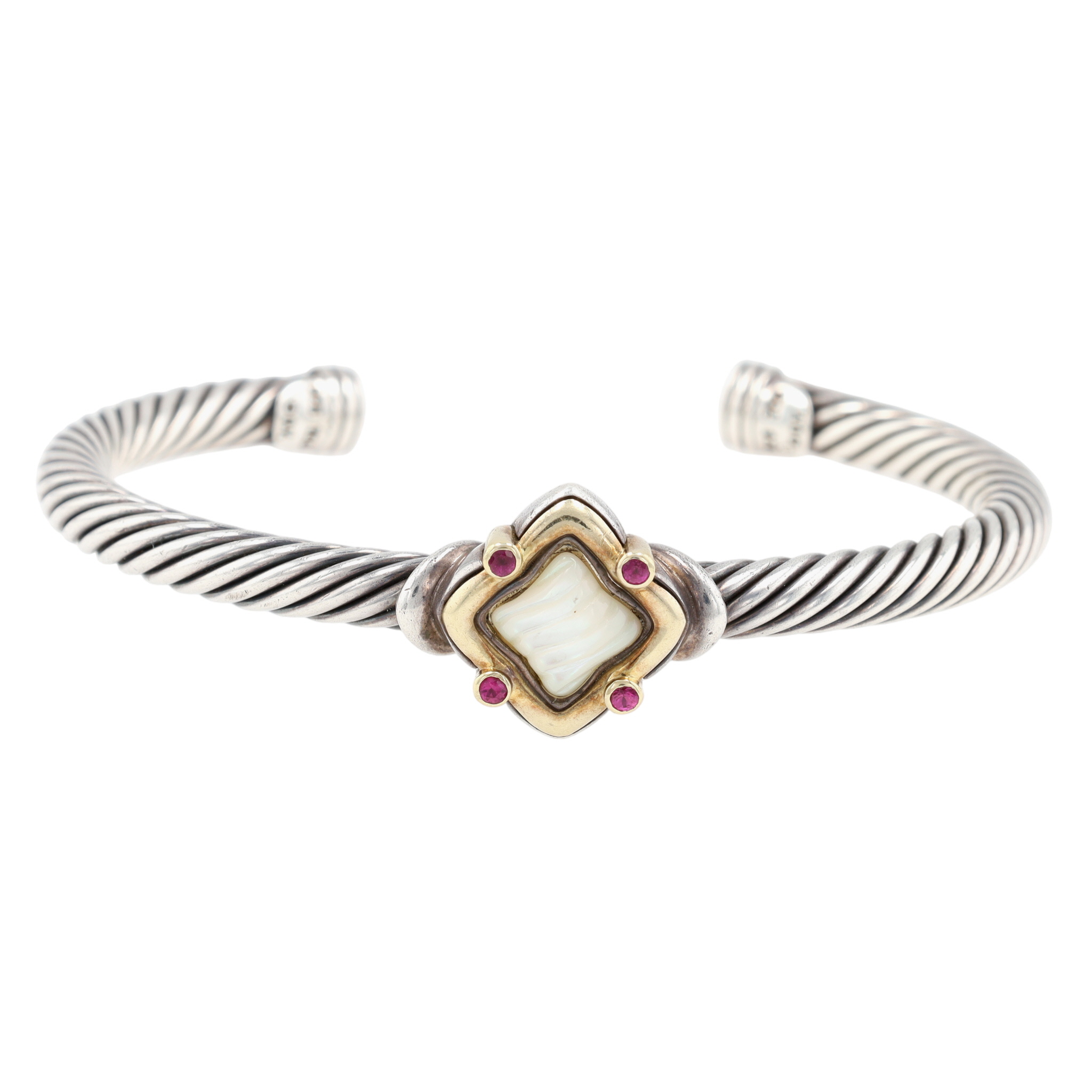 Gorgeous David Yurman Sterling & 18K Gold Ruby and Mother of Pearl Venetian Quatrefoil Cuff Bracelet | 30.2g
