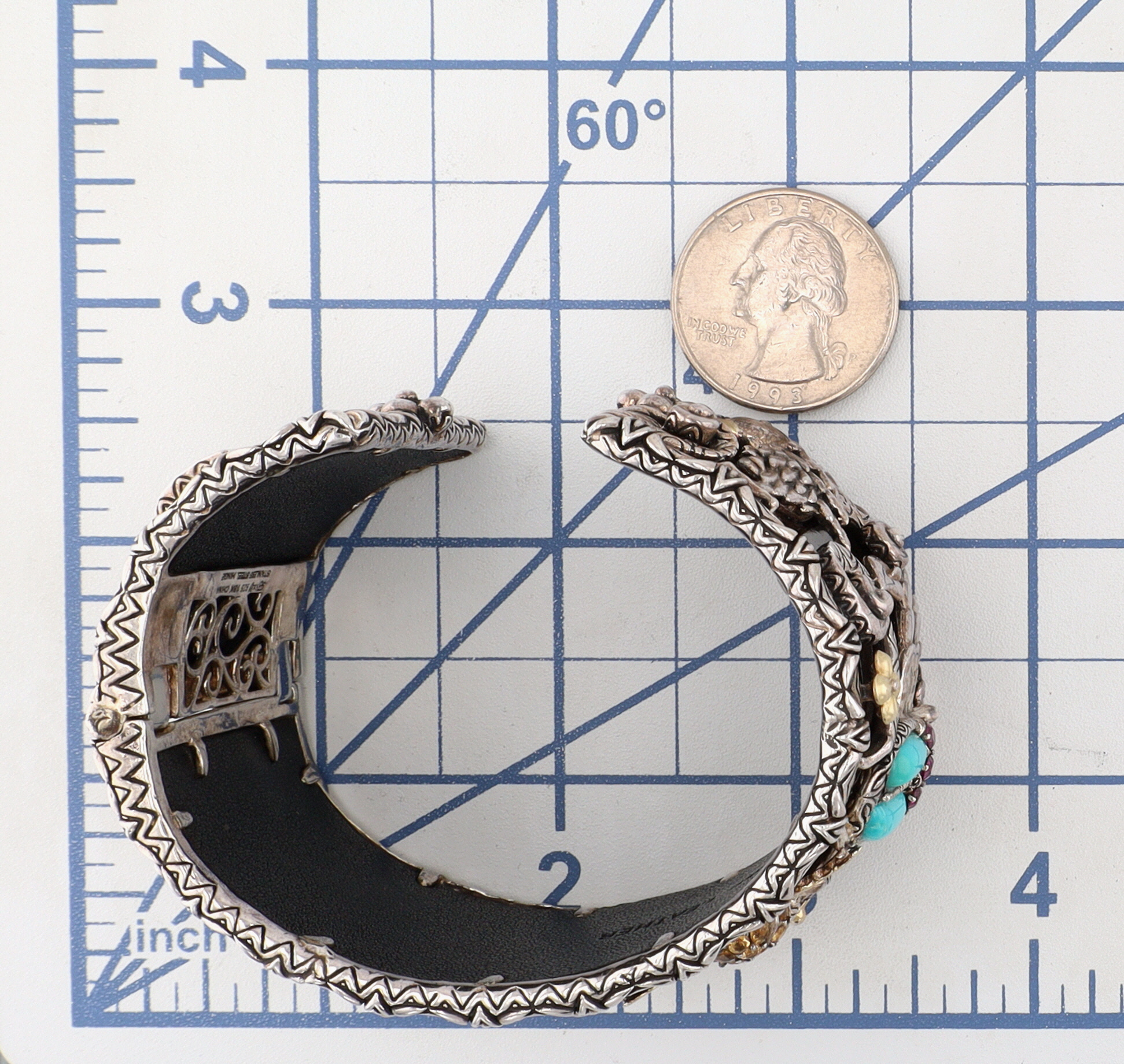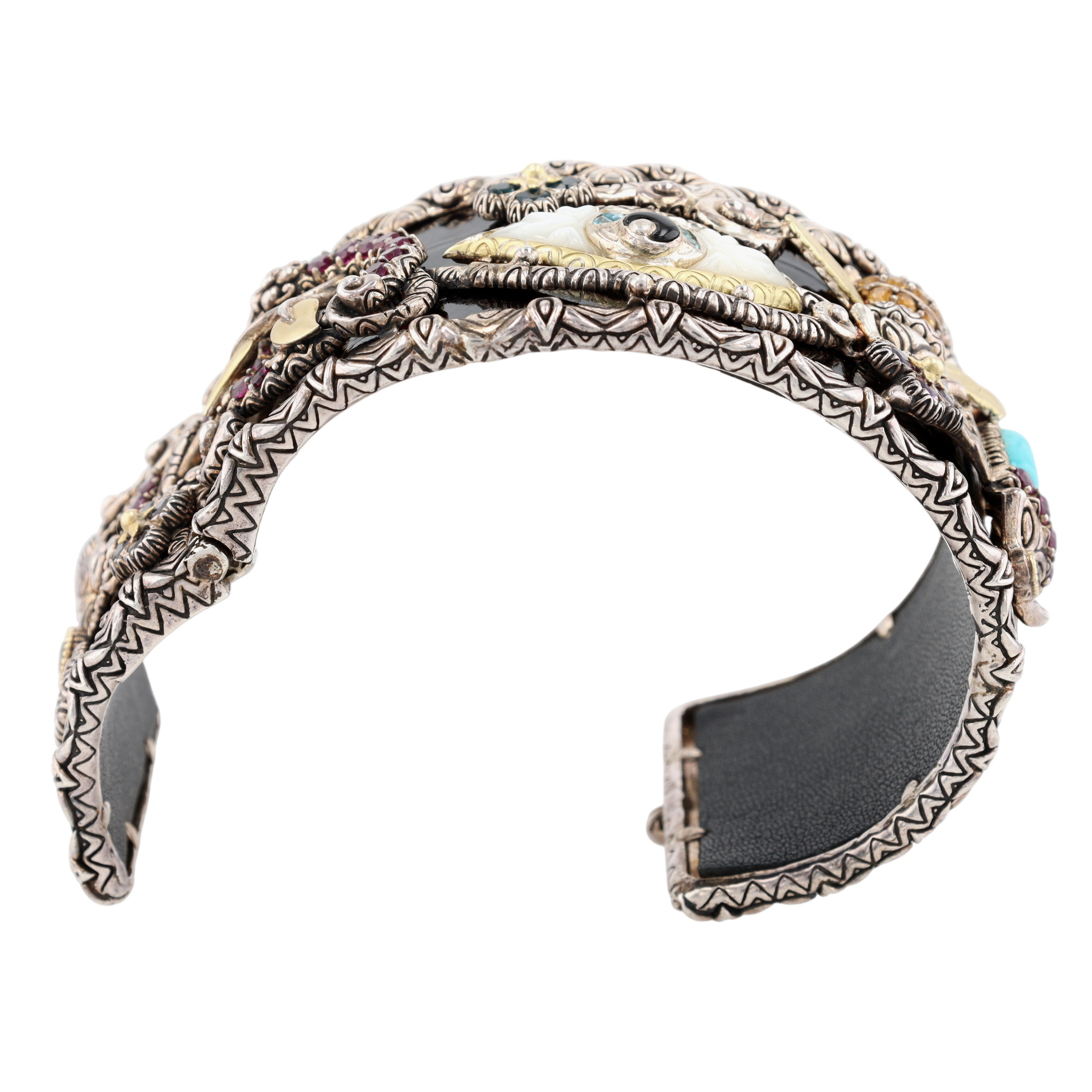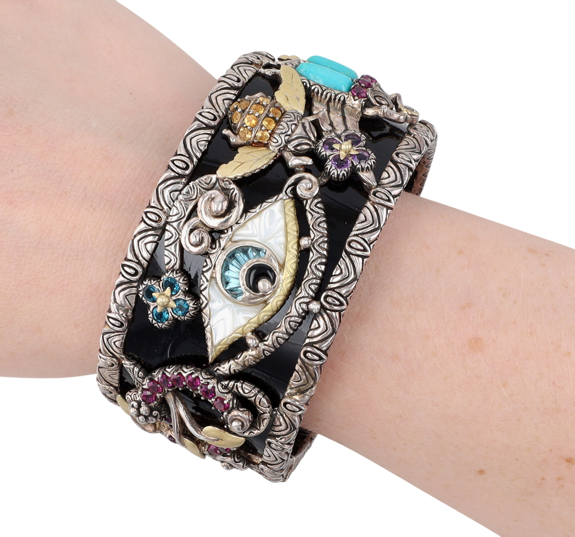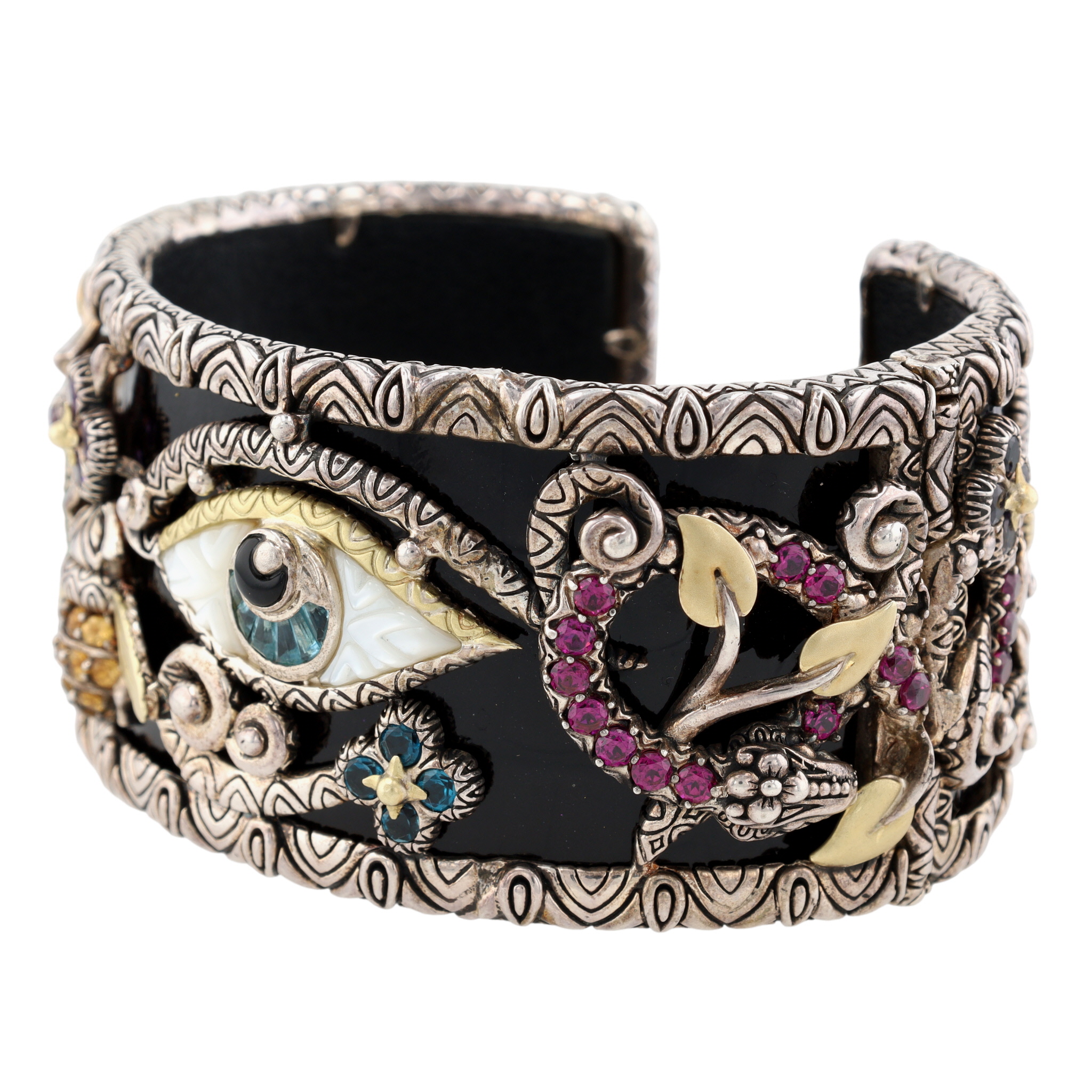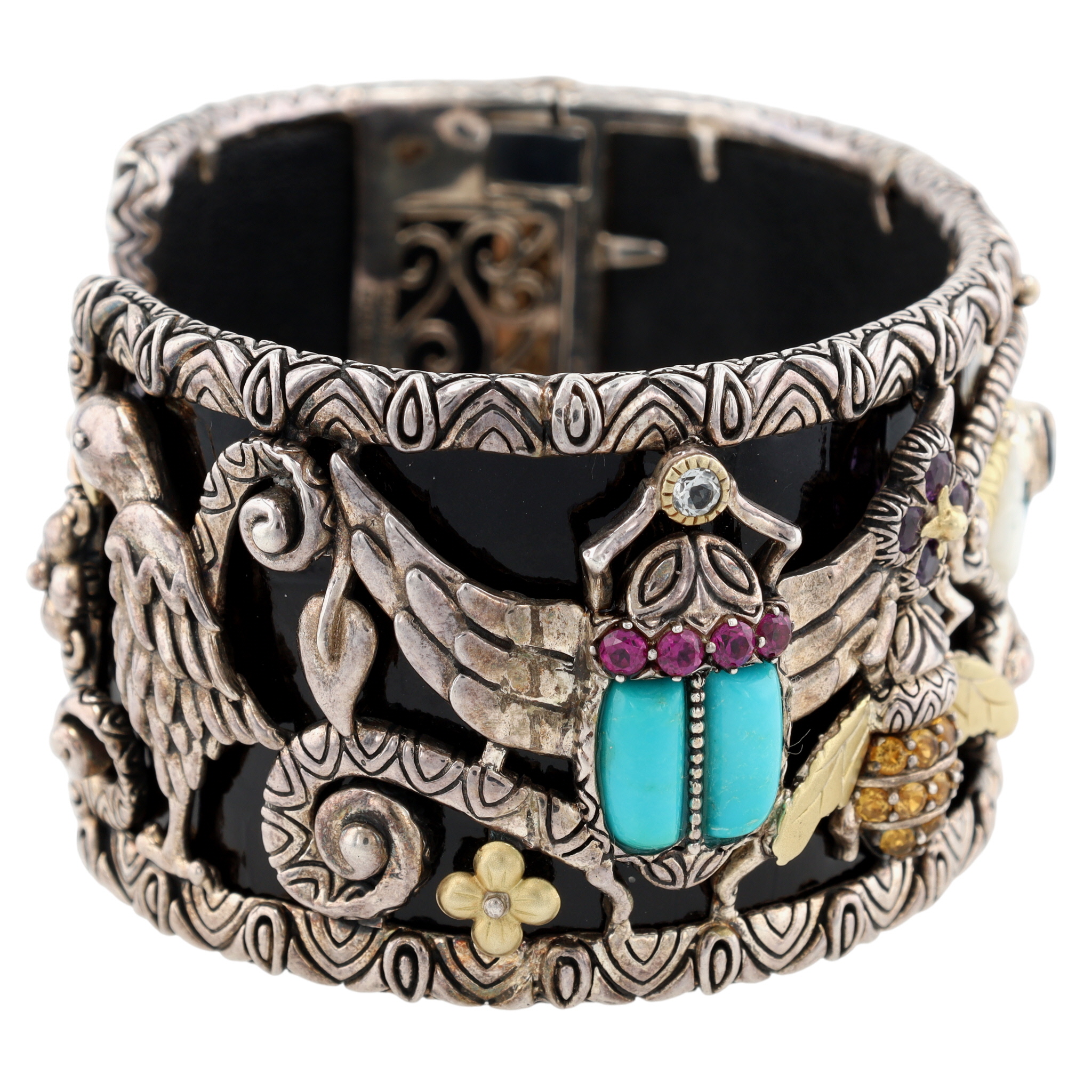 Barbara Bixby Sterling & 18K Gold Multi Gemstone Egyptian Cuff Bracelet | 110.8g | 1.5" wide/tall | Retail $1250 |