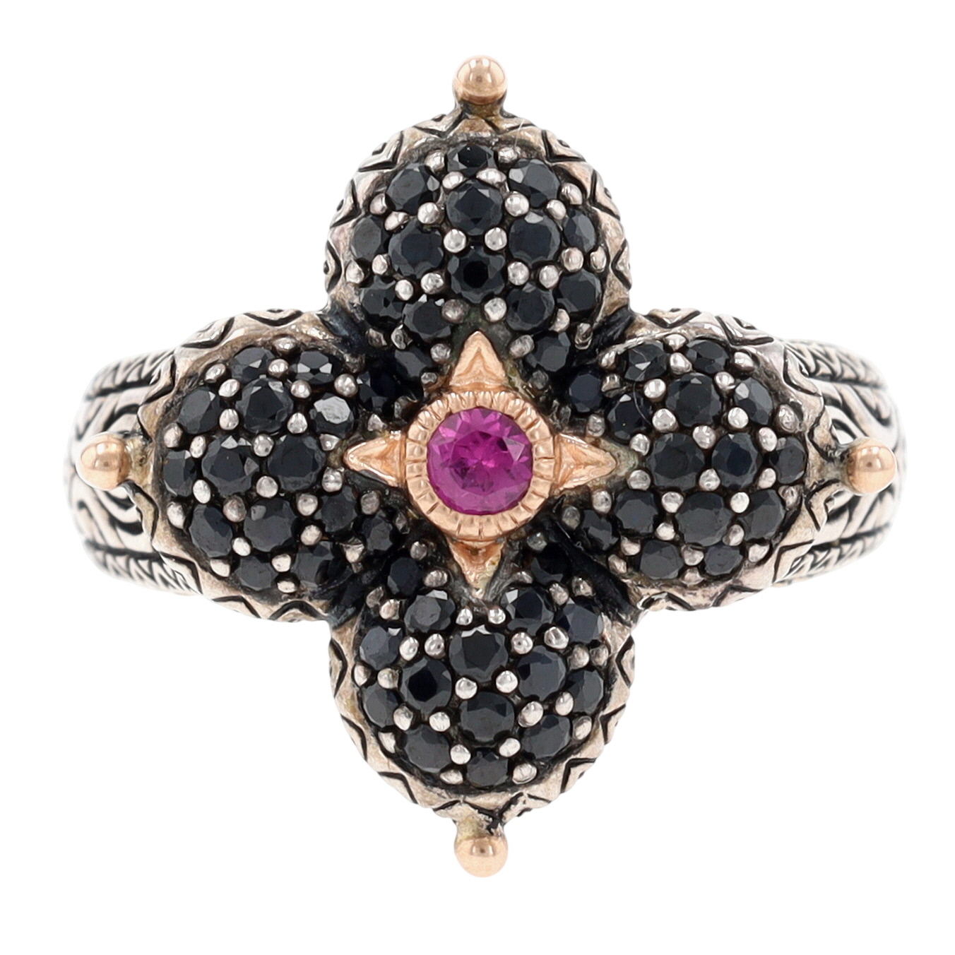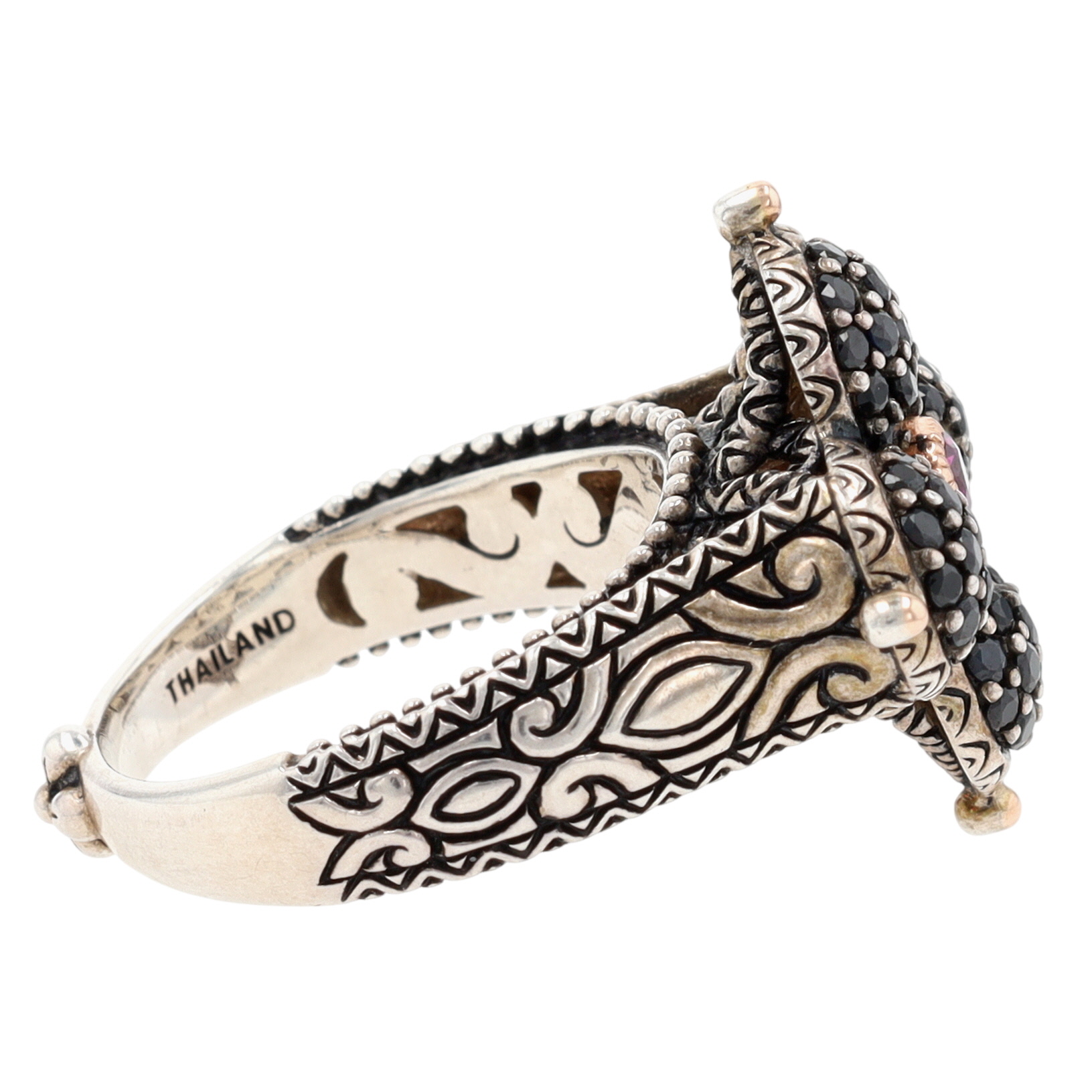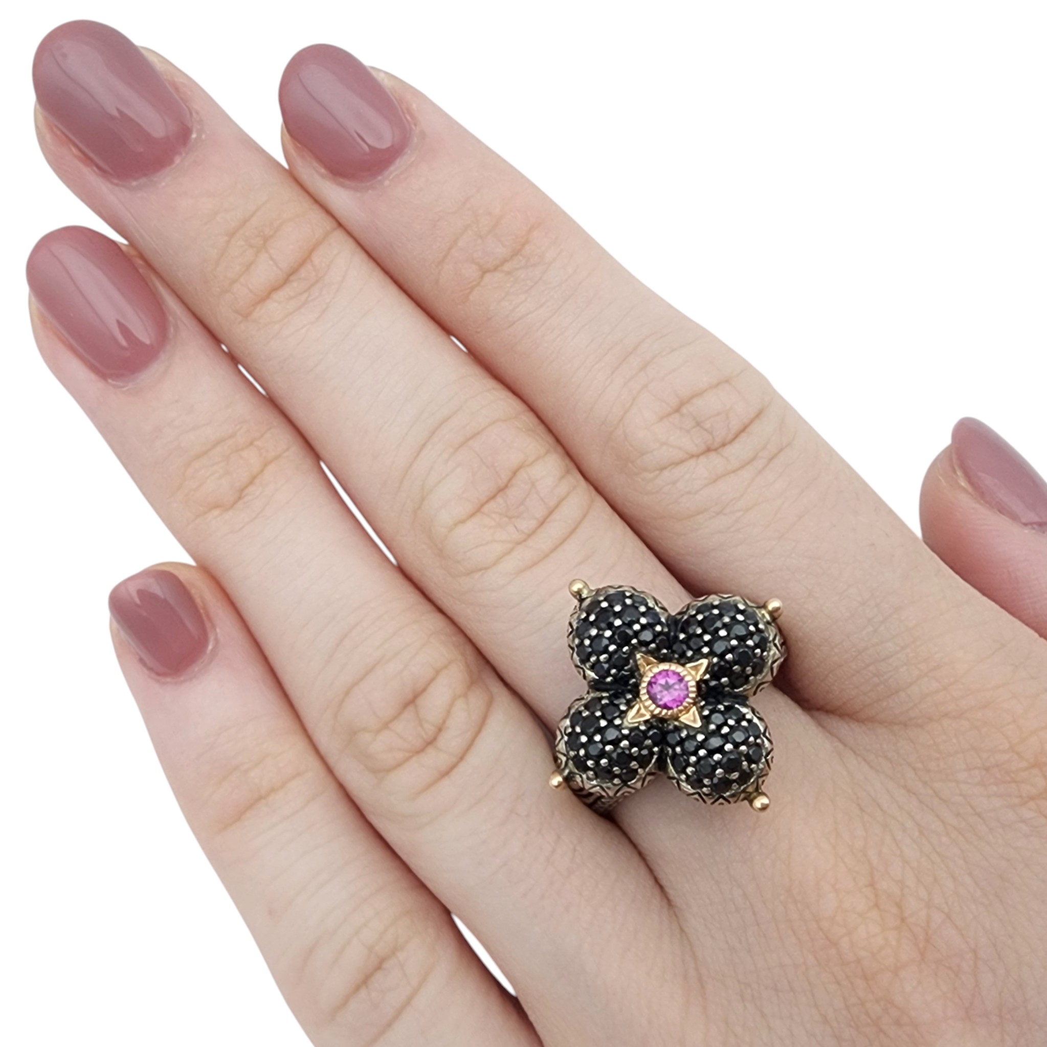 Barbara Bixby Sterling & 18K Gold Black Sapphire and Rhodolite Ring Sz 9 | 10g | From product webpage: “Floral motif with round black sapphires set with black rhodium plated prongs; center rhodolite gemstone bezel-set in a textured 18K yellow gold setting; 18K yellow gold beads on each end of the flower.” | Total gemstone weight is approximately 1.00 carat | Retail $315