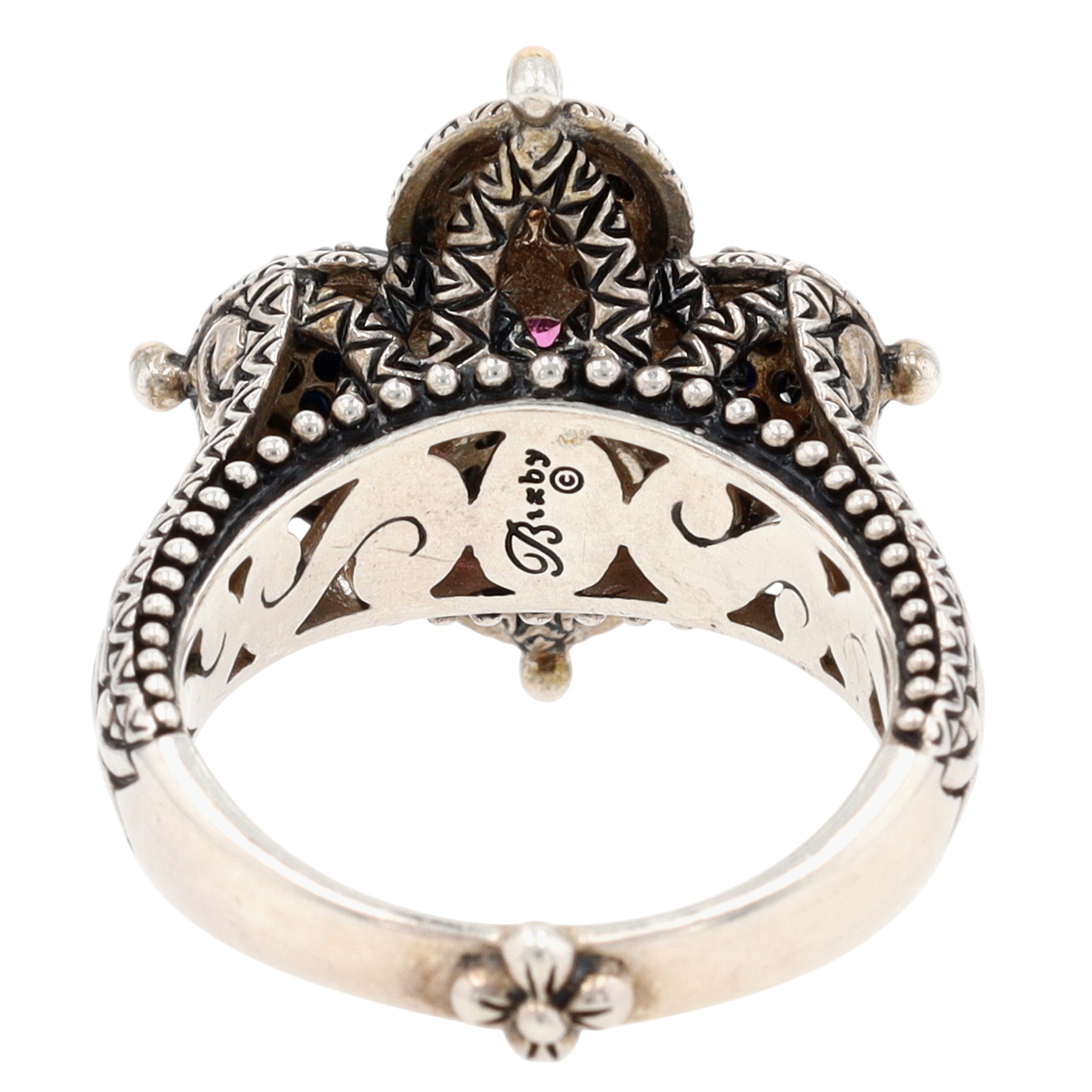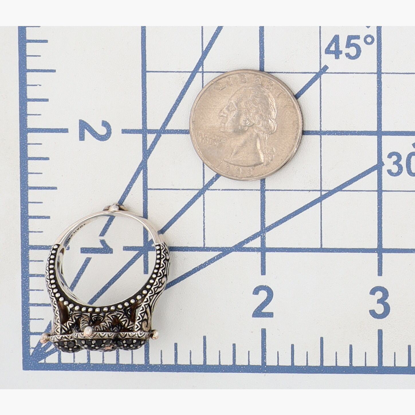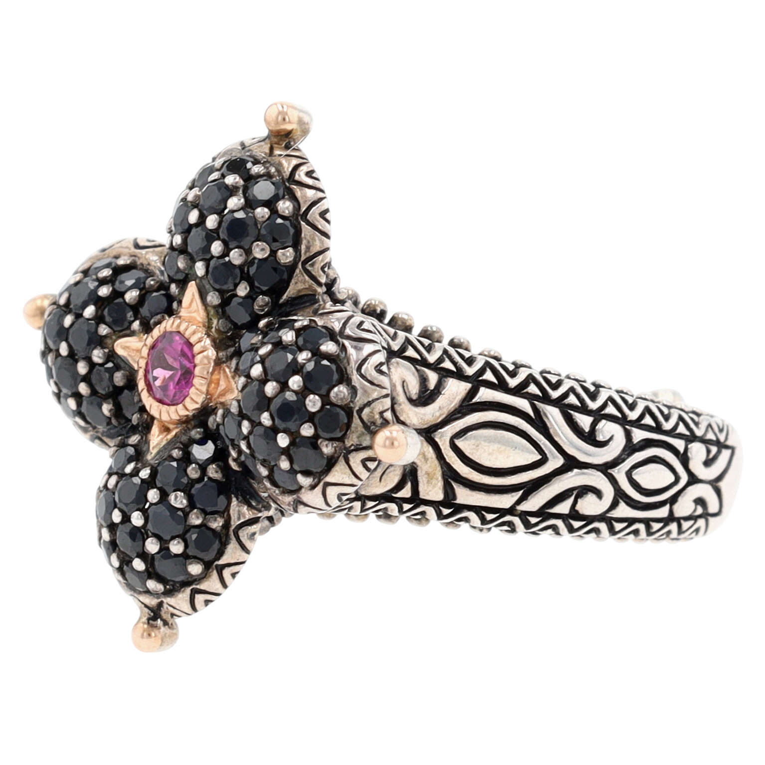 Barbara Bixby Sterling & 18K Gold Black Sapphire and Rhodolite Ring Sz 9 | 10g | From product webpage: “Floral motif with round black sapphires set with black rhodium plated prongs; center rhodolite gemstone bezel-set in a textured 18K yellow gold setting; 18K yellow gold beads on each end of the flower.” | Total gemstone weight is approximately 1.00 carat | Retail $315
