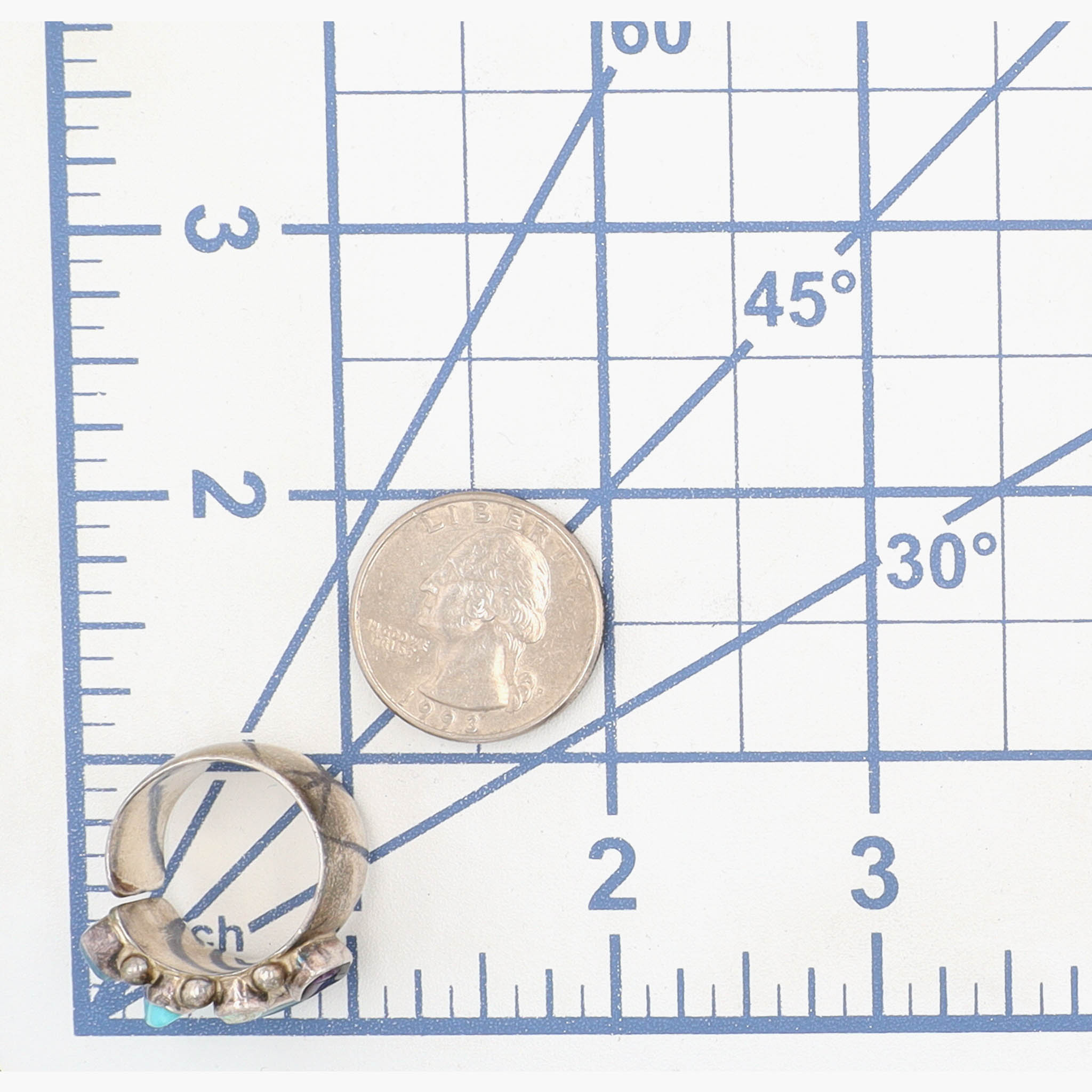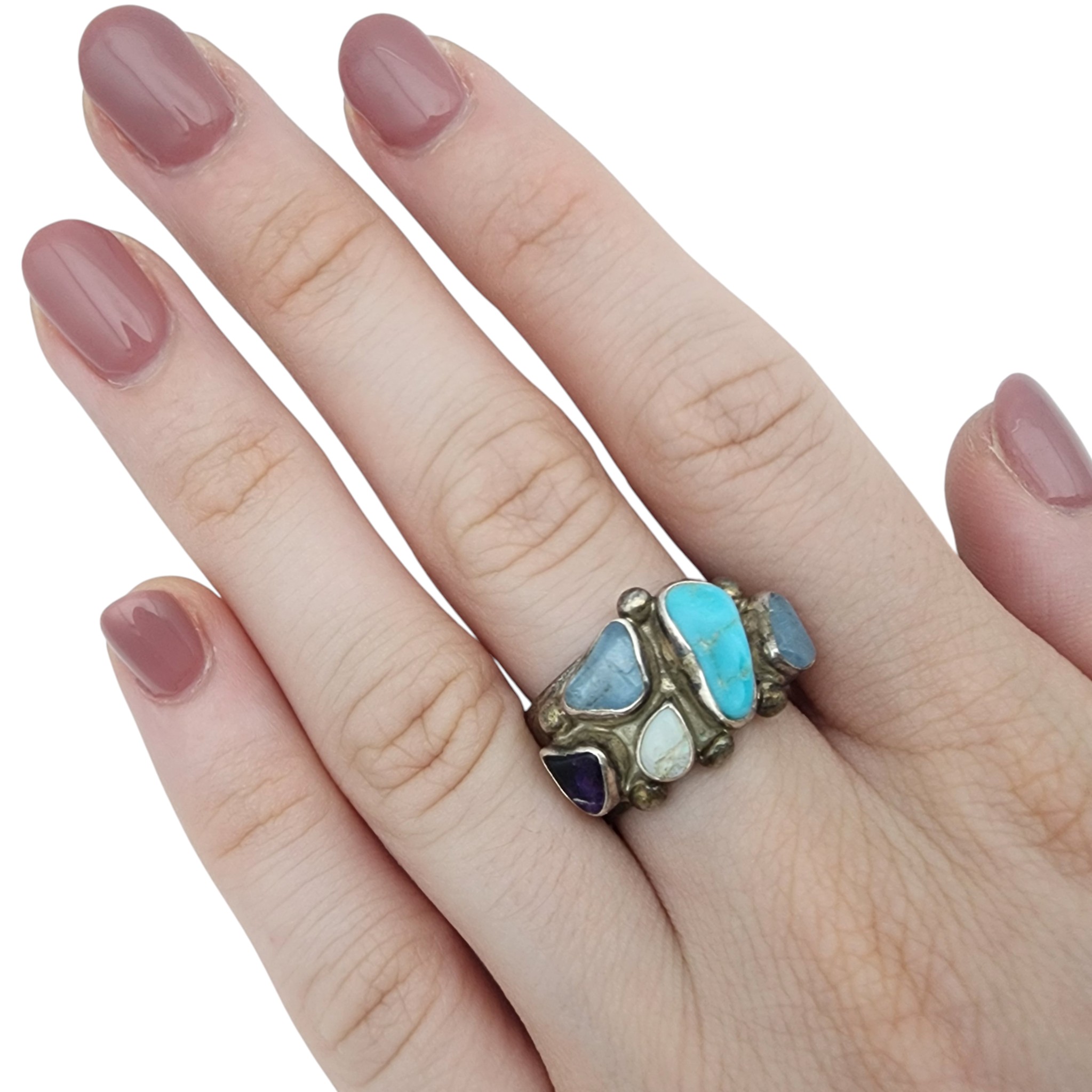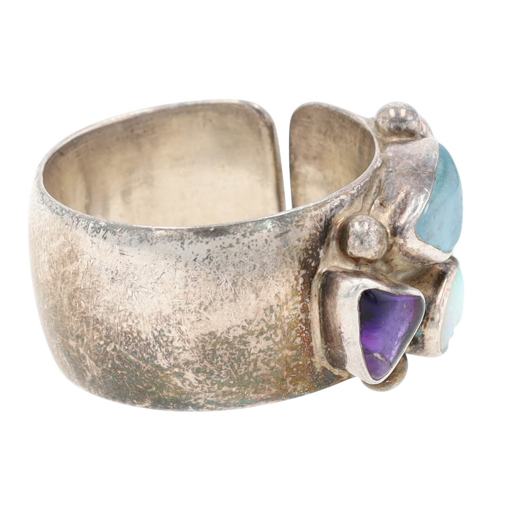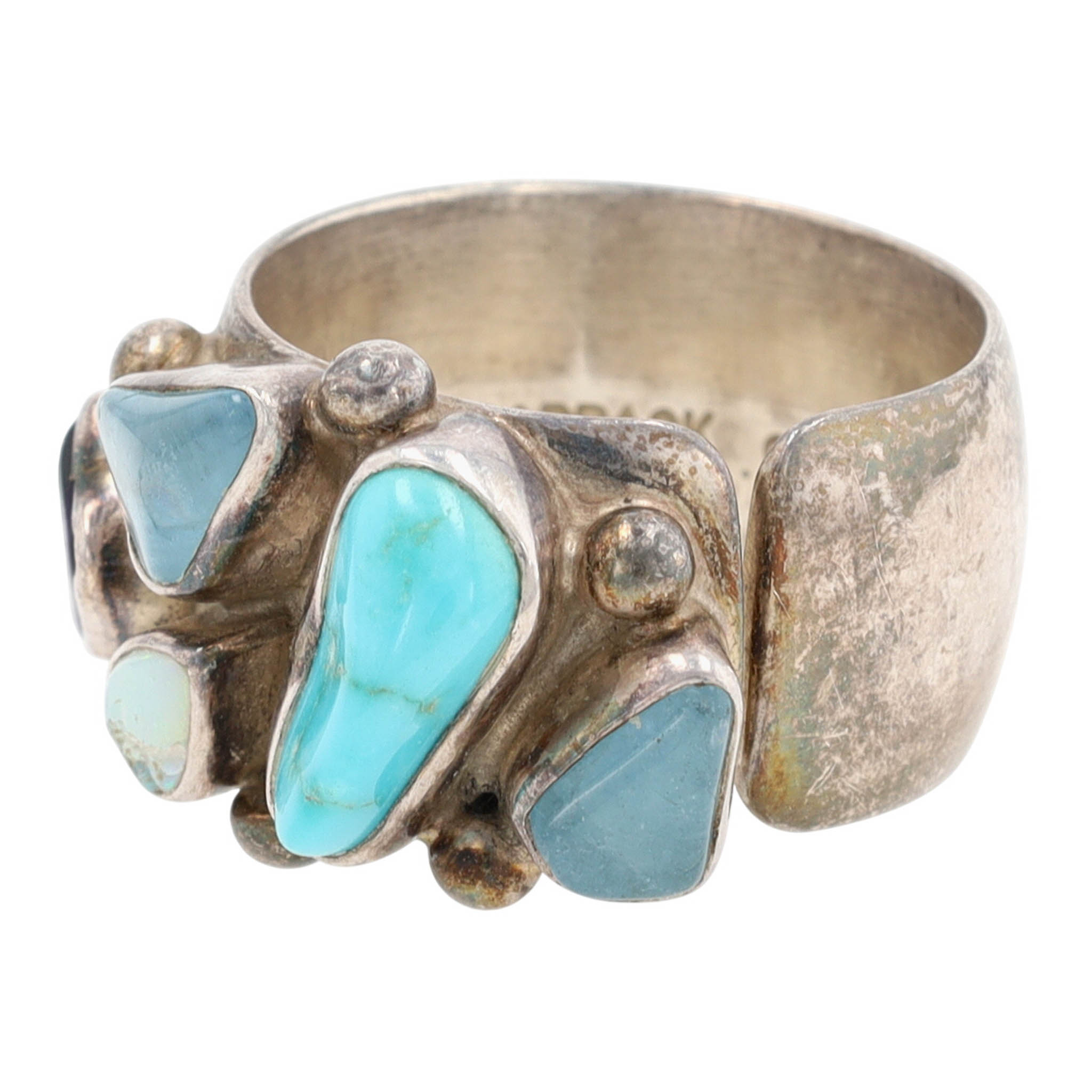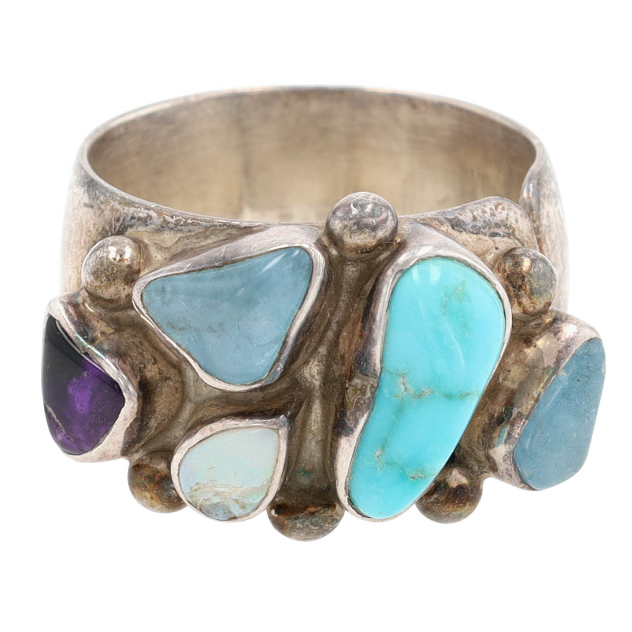 Gorgeous Rare Lilly Barrack Sterling Multistone (Turquoise, Amethyst, Opal, etc.) Modernist Ring Sz 8 | 13.8g | Note: amethyst stone with scratch across surface, opal stone with a break – stones secure, intact. See photos – as is.