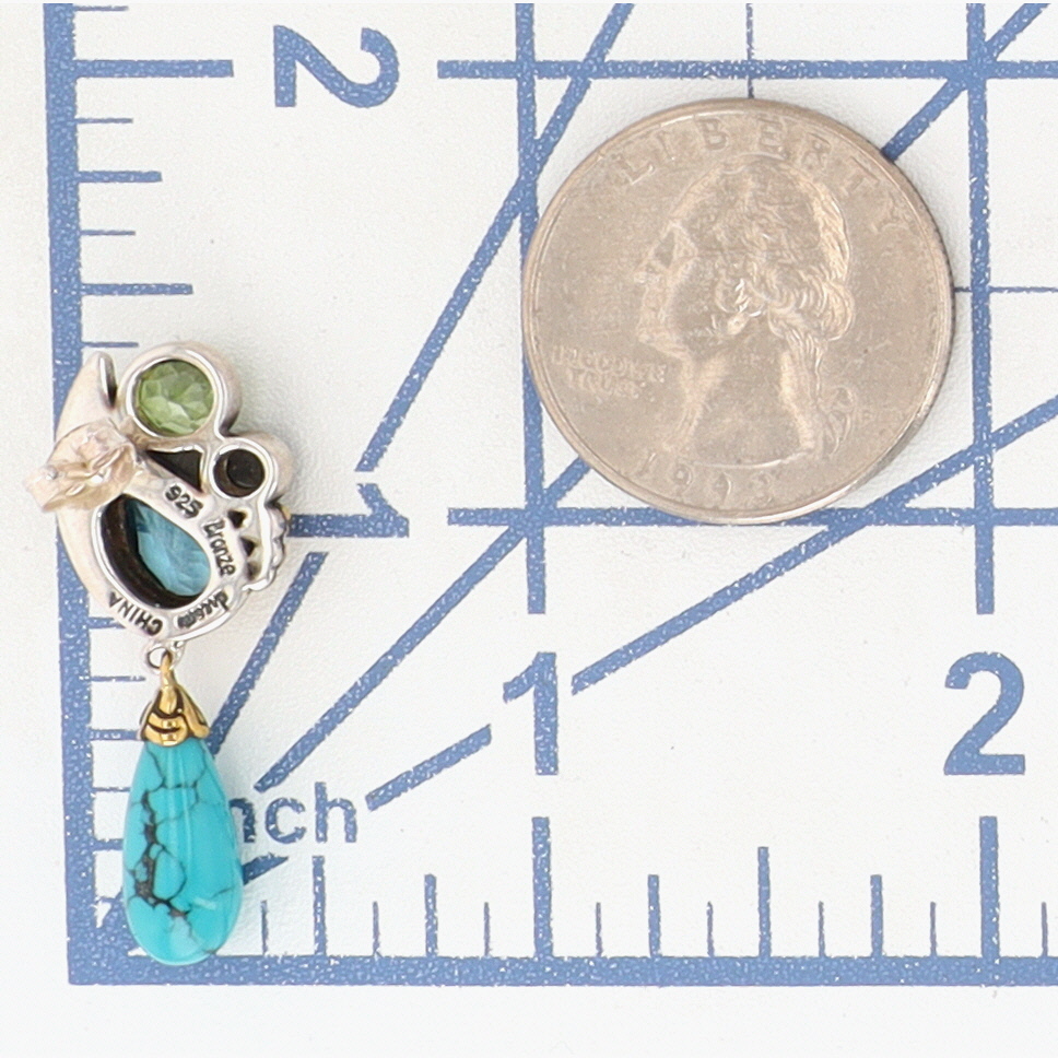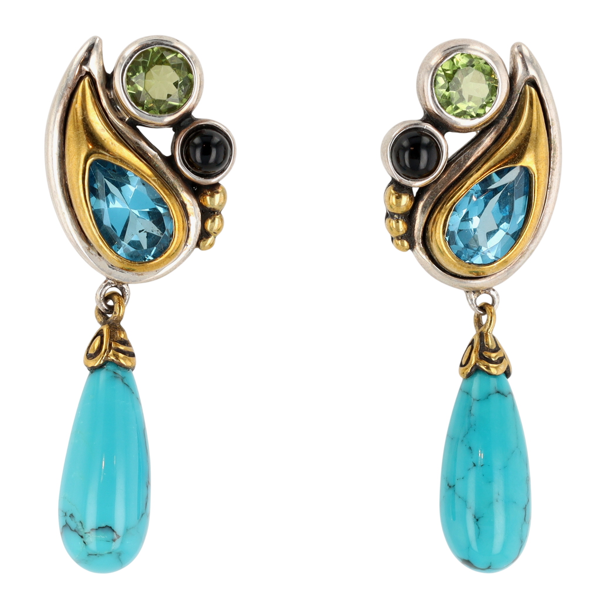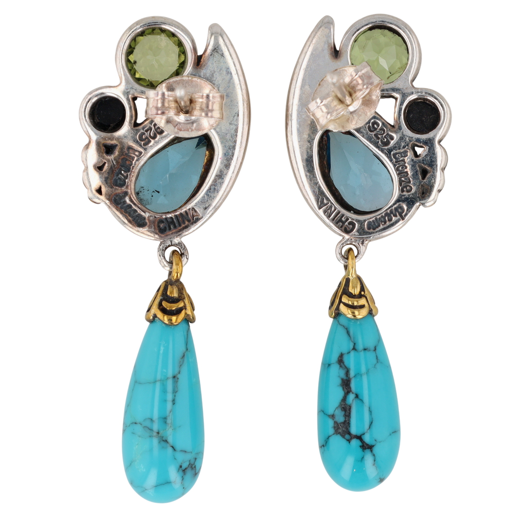 Echo of the Dreamer Sterling and Bronze Multistone (Peridot, Topaz, etc.) and Turquoise Dangle Earrings | 7.1g
