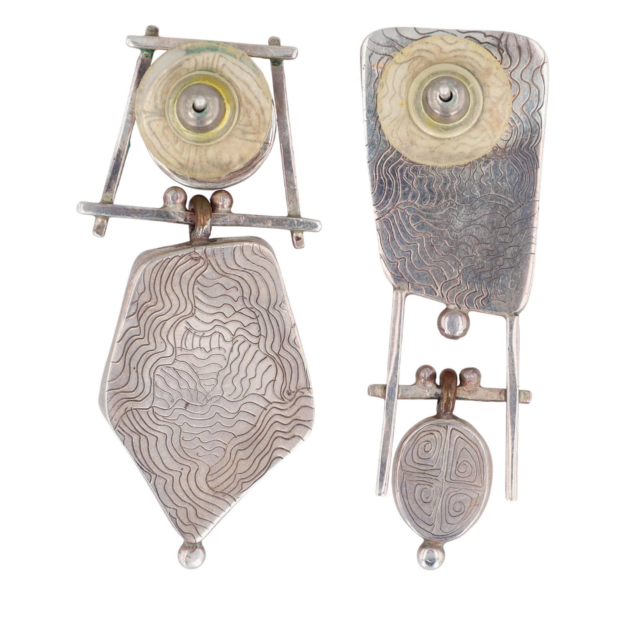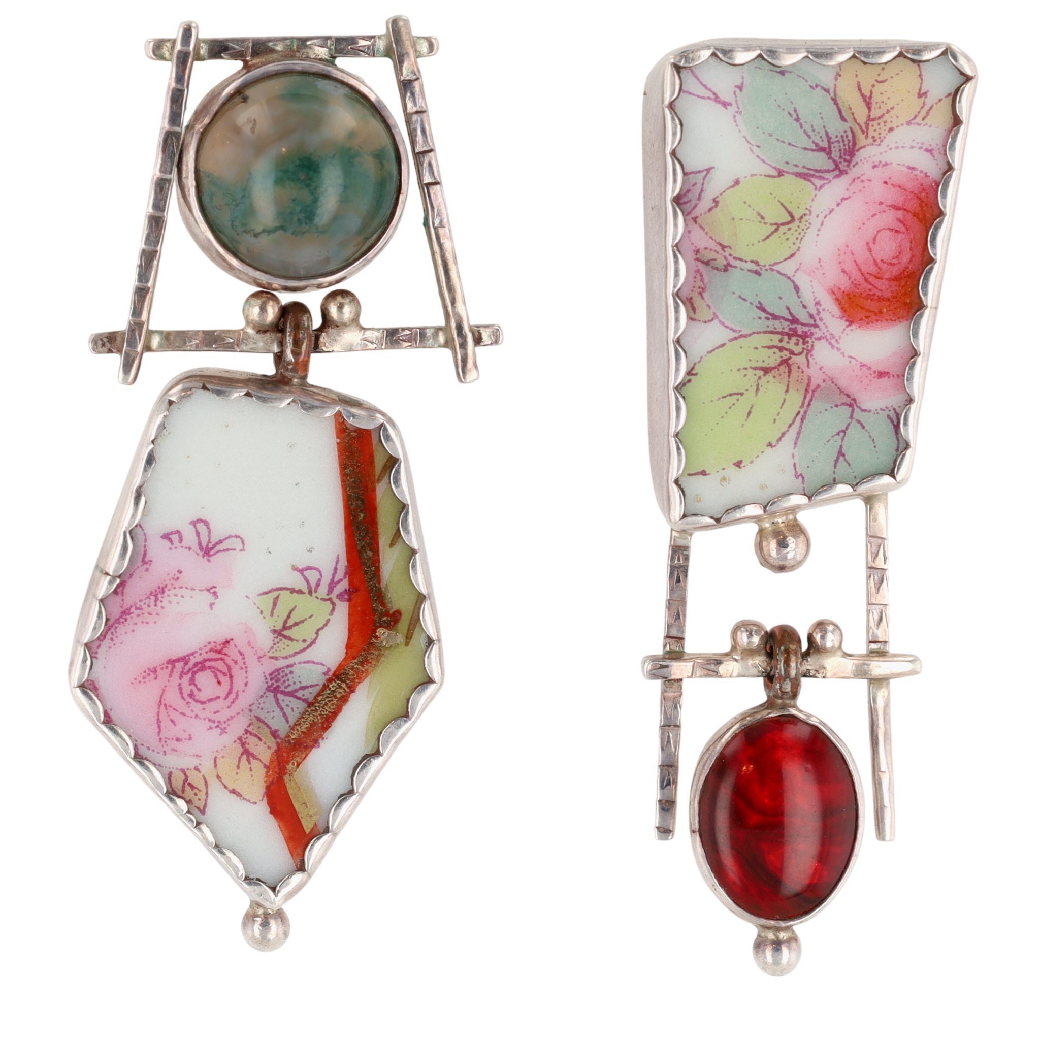Lindsay Livingston Sterling Ceramic Shard & Multistone Earrings | 12.1g | “Lindsay is an artisan silversmith from Cottonwood, AZ. Her colorful bracelets and earrings are all sterling silver fabricated jewelry with antique ceramic shards set in bezel cups.”