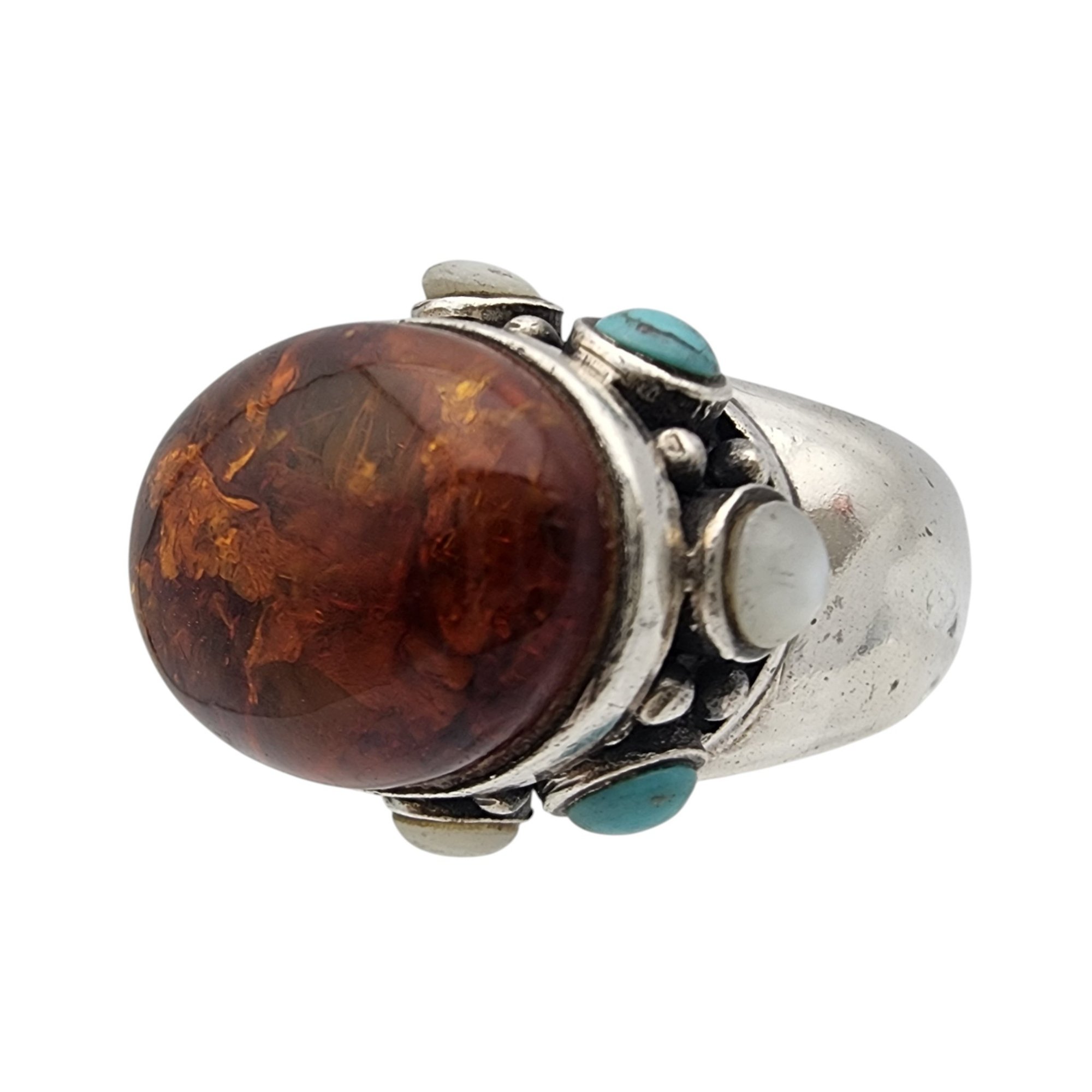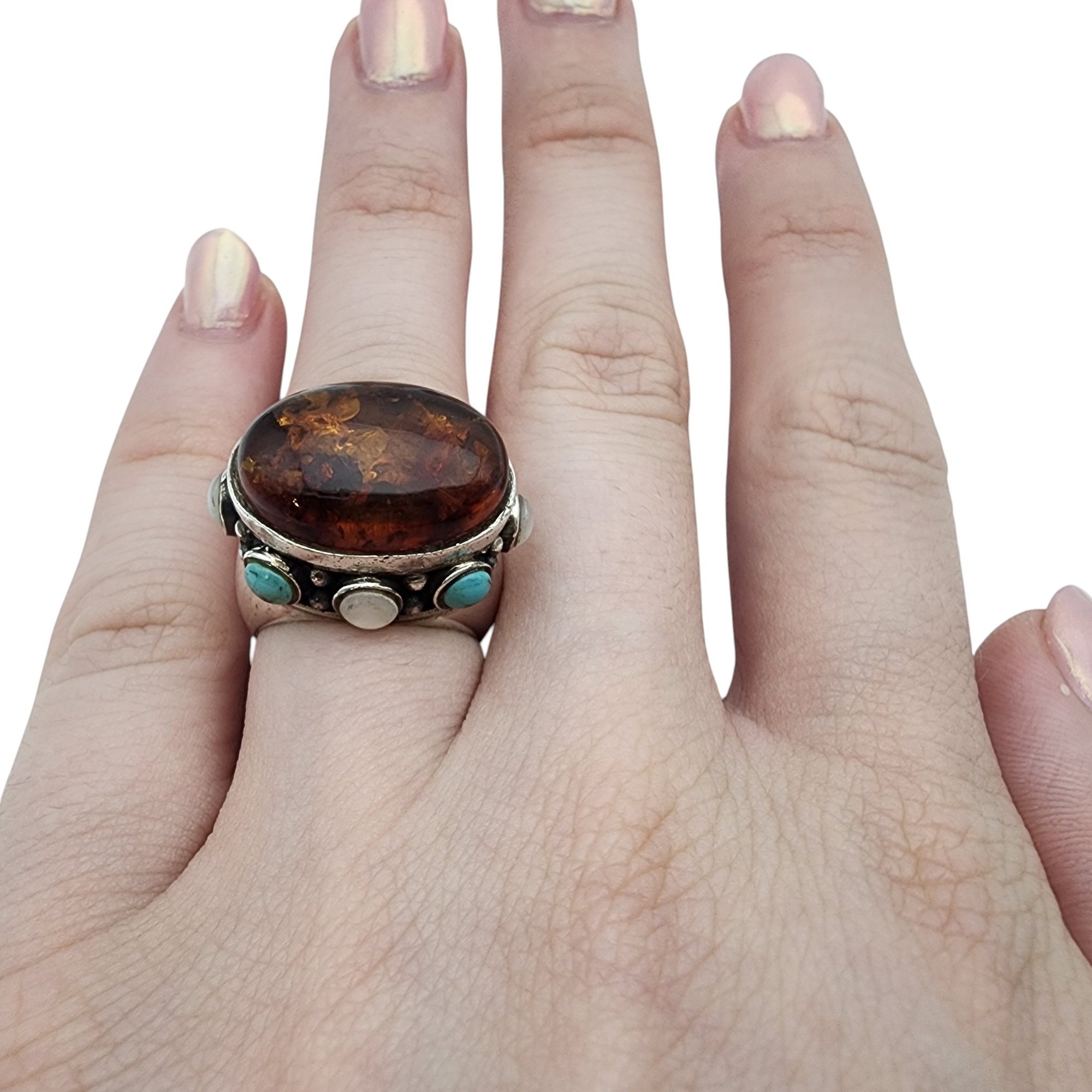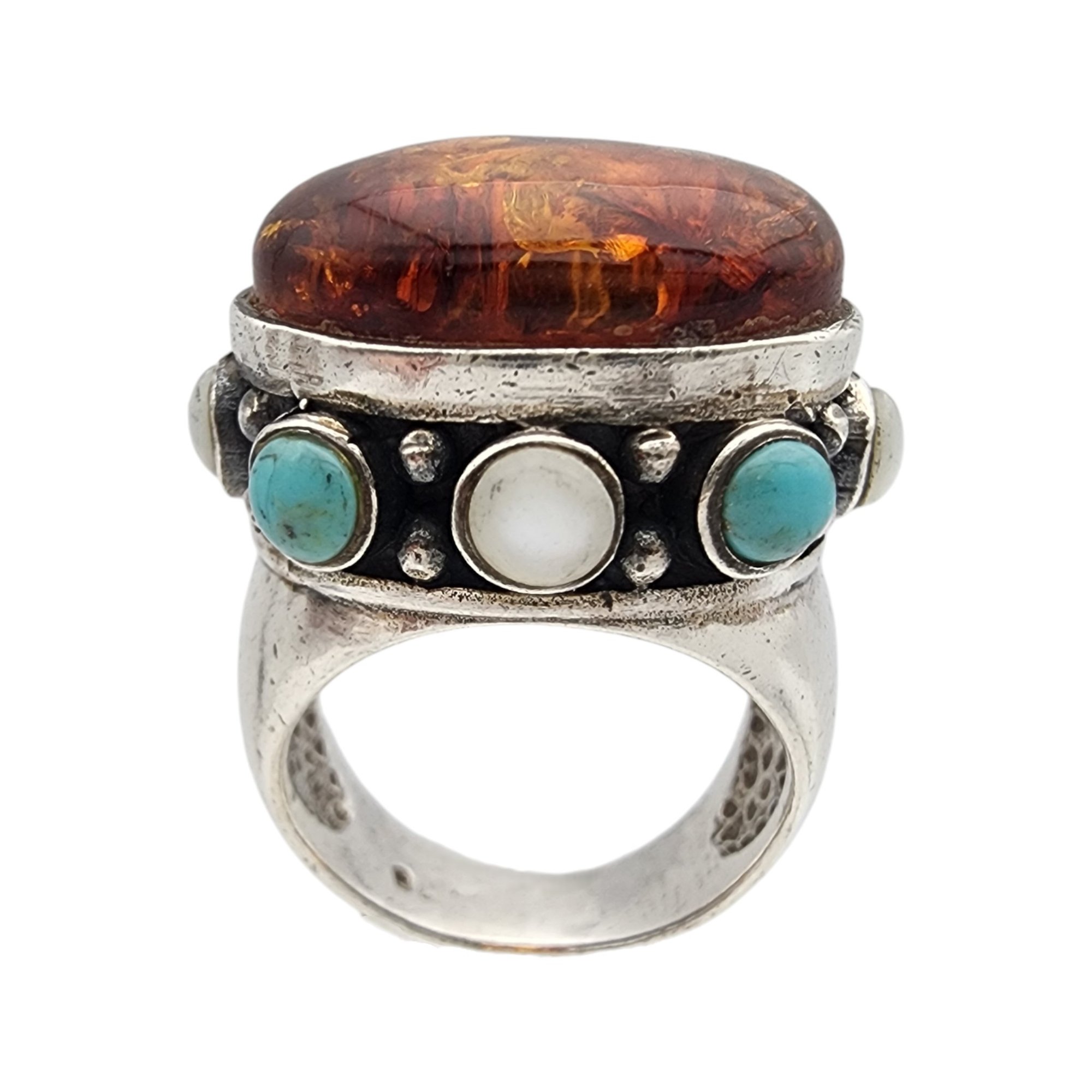 Vintage Sterling Amber, Turquoise, Mother of Pearl RIng Sz 5 – 10.6g
