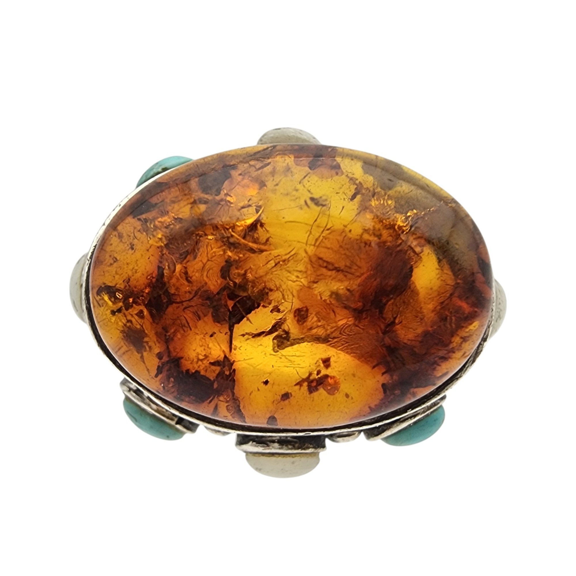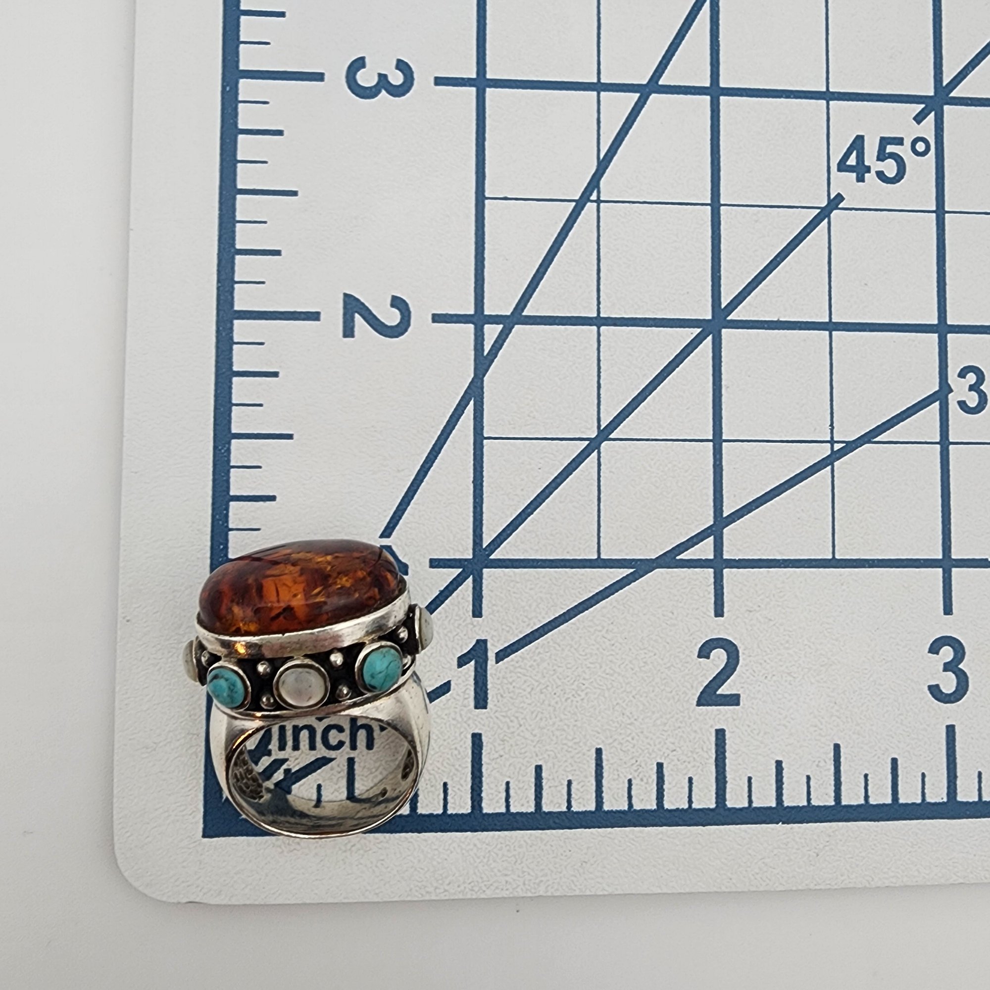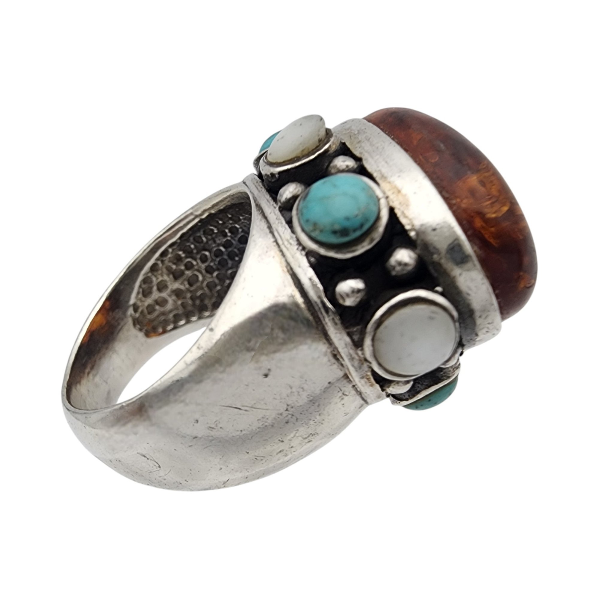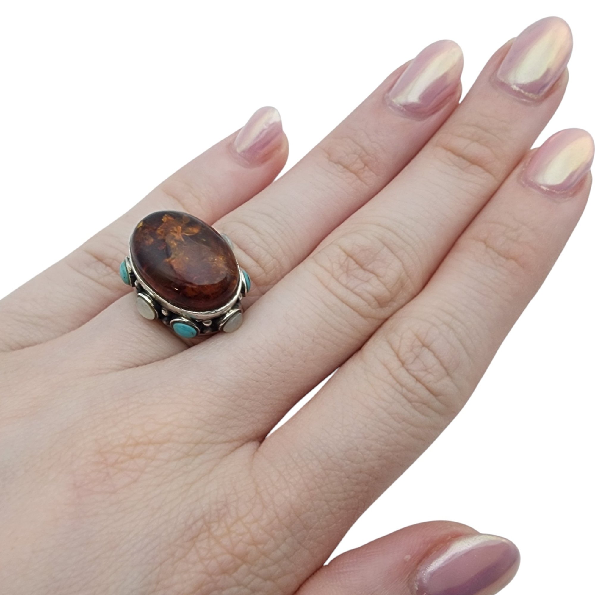 Vintage Sterling Amber, Turquoise, Mother of Pearl RIng Sz 5 – 10.6g